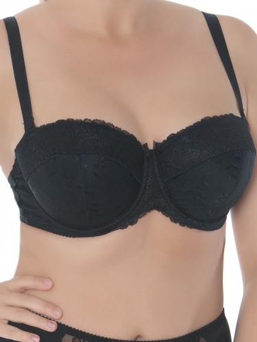 Балконет с дублированными чашками. Стан из эластичного трикотажного и жаккардового полотен. Верхняя деталь чашки из эластичного кружева и трикотажного полотна. Нижняя деталь чашки из эластичного жаккардового полотна и трикотажного полотна. Карман для вкладышей.