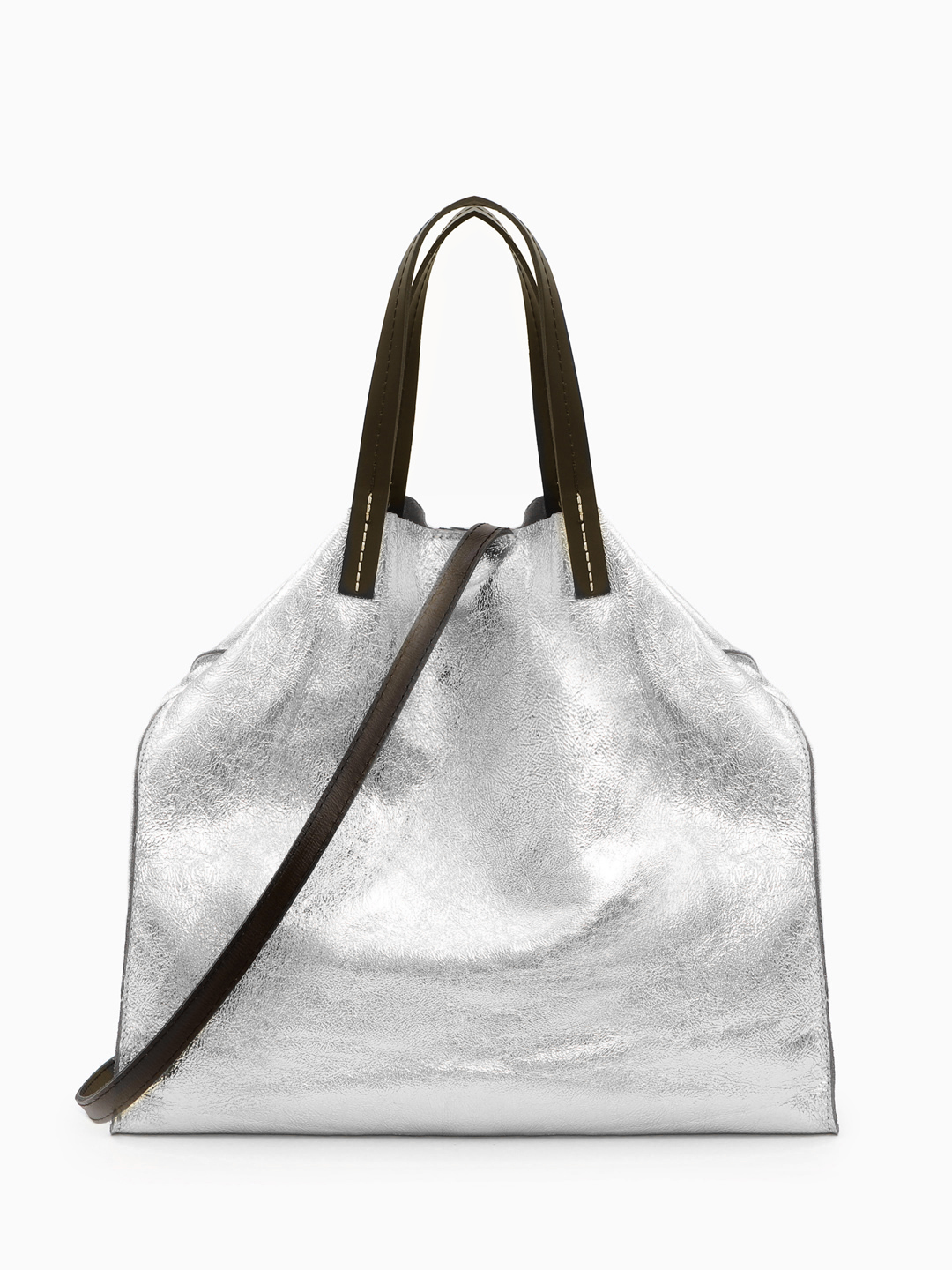 Большая сумка с контрастной строчкой на ручках из кожи серебристого цвета от FOLLE fo611 laminato argento