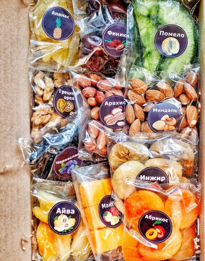Миндаль, ананас, манго, абрикос, арахис жареный, чернослив , грецкий орех, инжир, айва, финик, помело.
