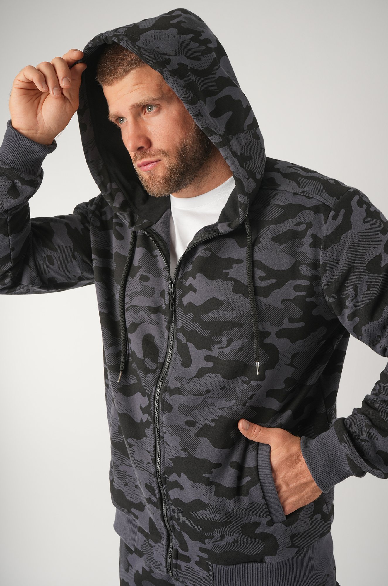 Мужской спортивный костюм выполнен из 100% хлопка, плотного футера трехнитки. Демисезонный камуфляжный костюм состоит из толстовки с капюшоном и брюк джоггеров. Мастерка с застежкой на молнию и карманами, капюшон регулируется по объему. Штаны дополнены карманами, пояс утягивается шнуром, по низу расположены эластичные манжеты.