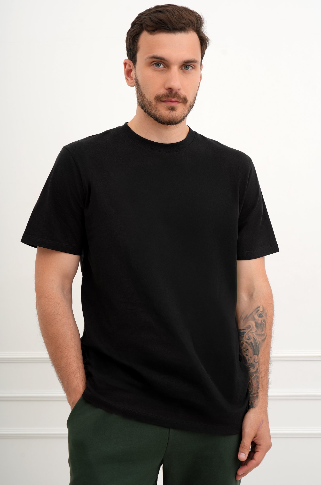 Однотонная черная футболка – тот случай, когда не нужно придумывать, что надеть. Мужская футболка идеальна для создания стильных повседневных образов. Классическая модель с коротким рукавом выполнена из натурального 100% хлопка.