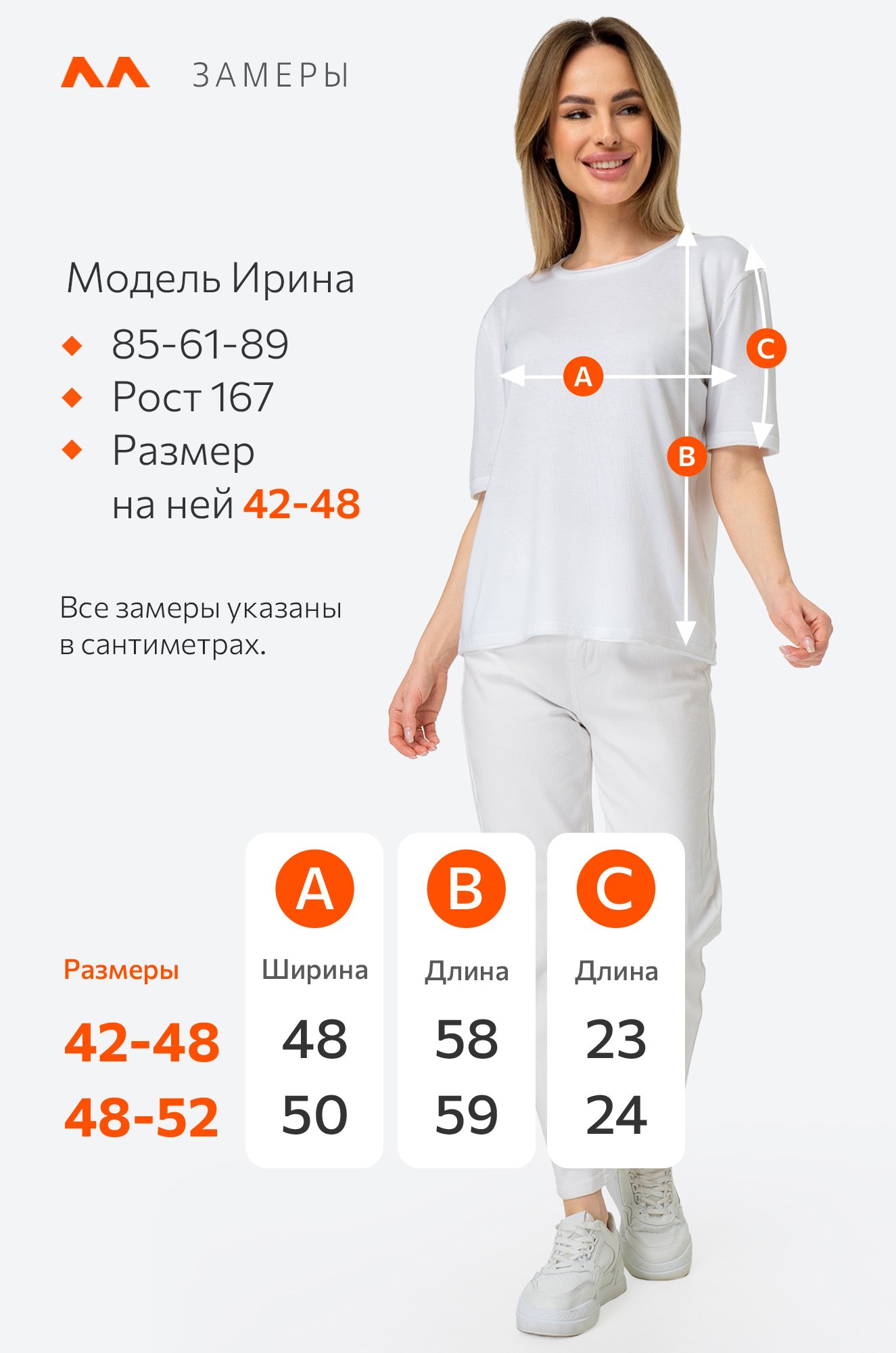 Размер 42-48: длина:58 см; ширина:48 см; длина рукава внешняя:23 см; длина рукава внутренняя:9 см.