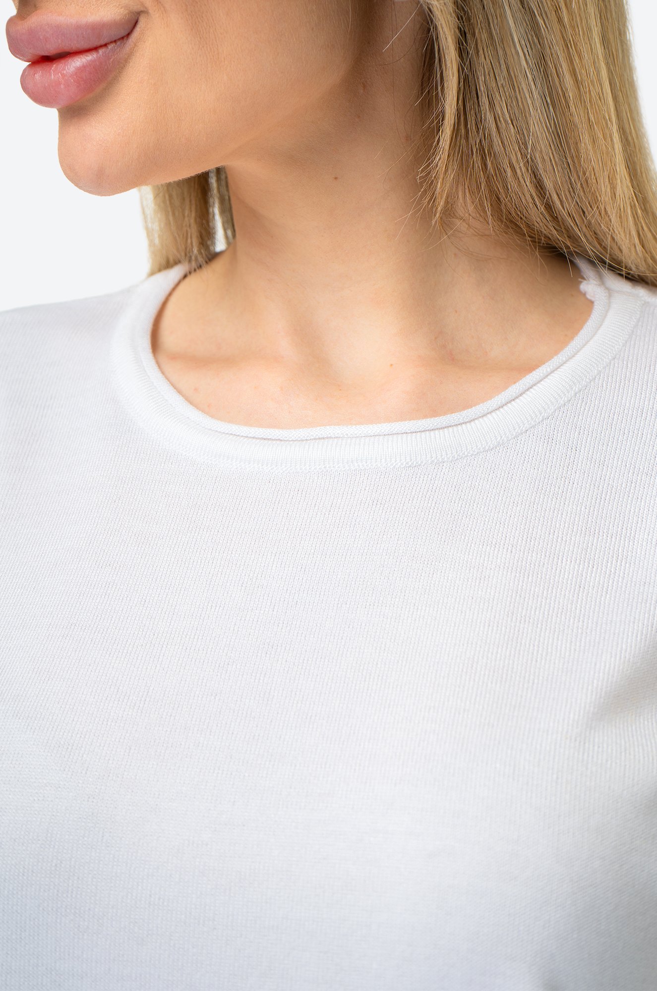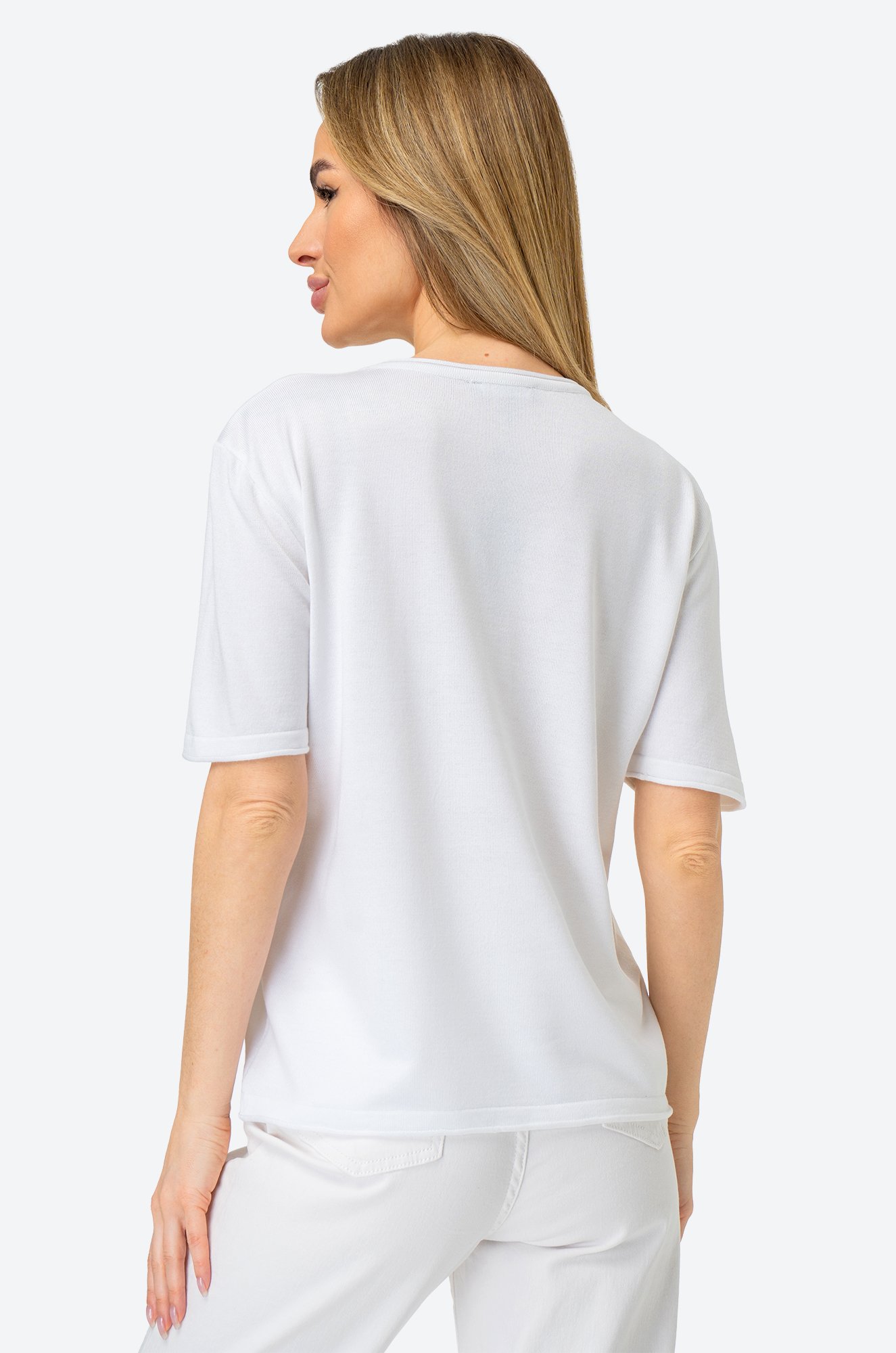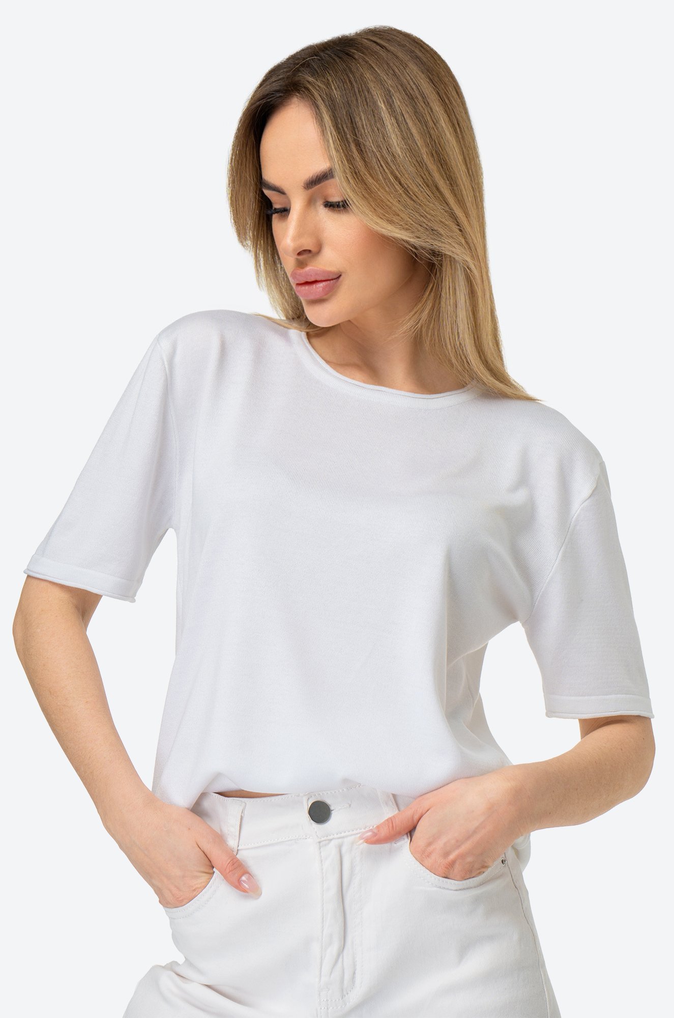 Вязаный трикотаж из вискозы и акрила плавно облегает фигуру и струится по коже. В таком джемпере будет комфортно на протяжении всего дня! Вязаная футболка для женщин не вытягивается и не теряет форму даже после многократных стирок.