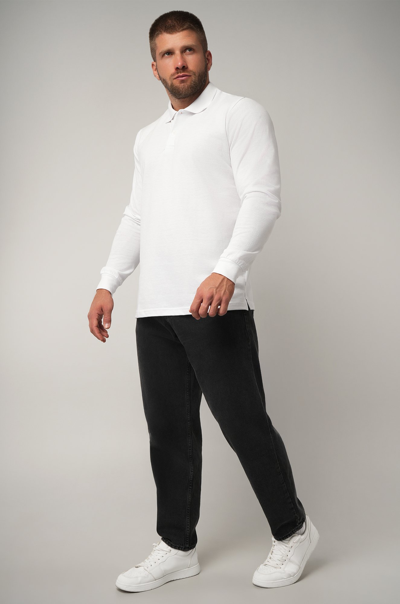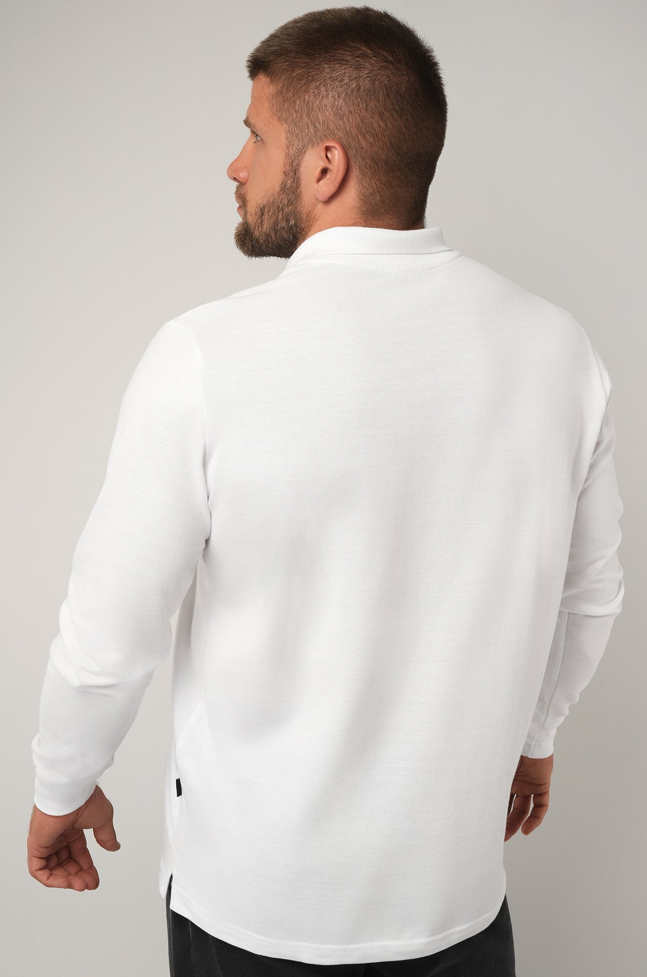 Белый лонгслив поло — лаконичный фаворит мужского гардероба, который всегда к месту. Идеальный баланс между комфортом и стильным минимализмом для повседневных образов.