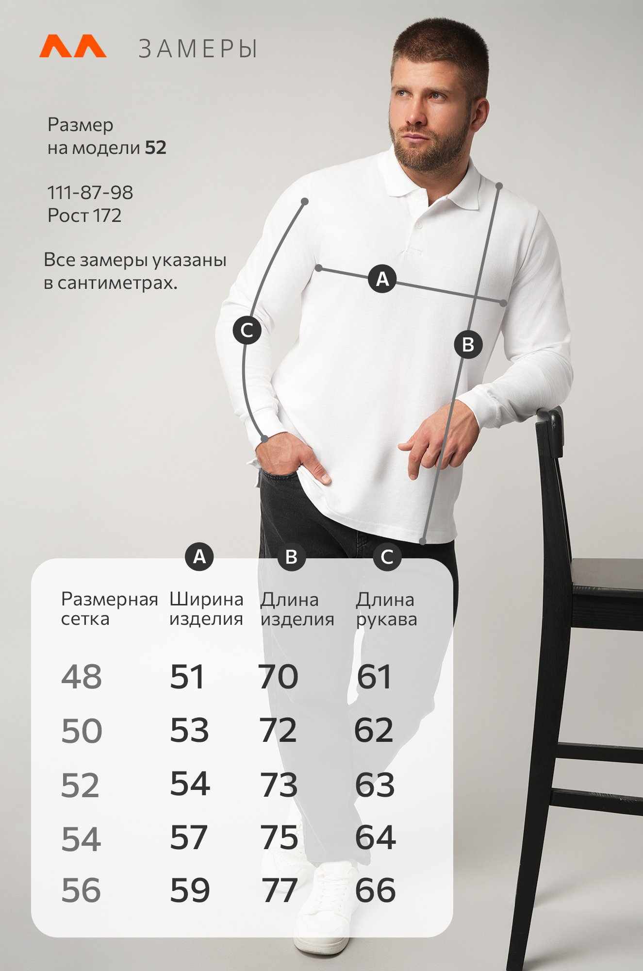 Модель Артем, рост 172 см, параметры 113-82-100 см. На нем поло 50 размера.