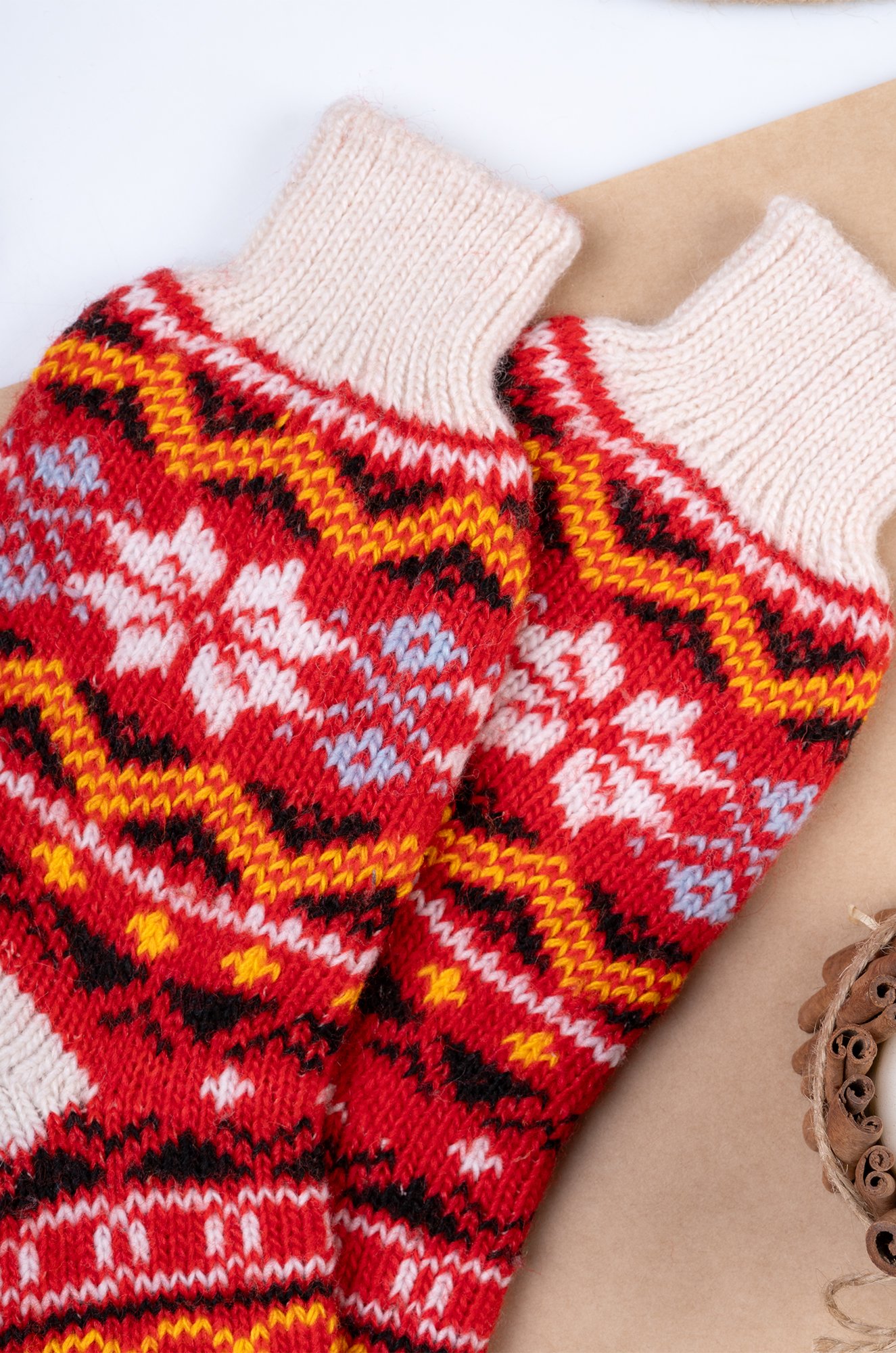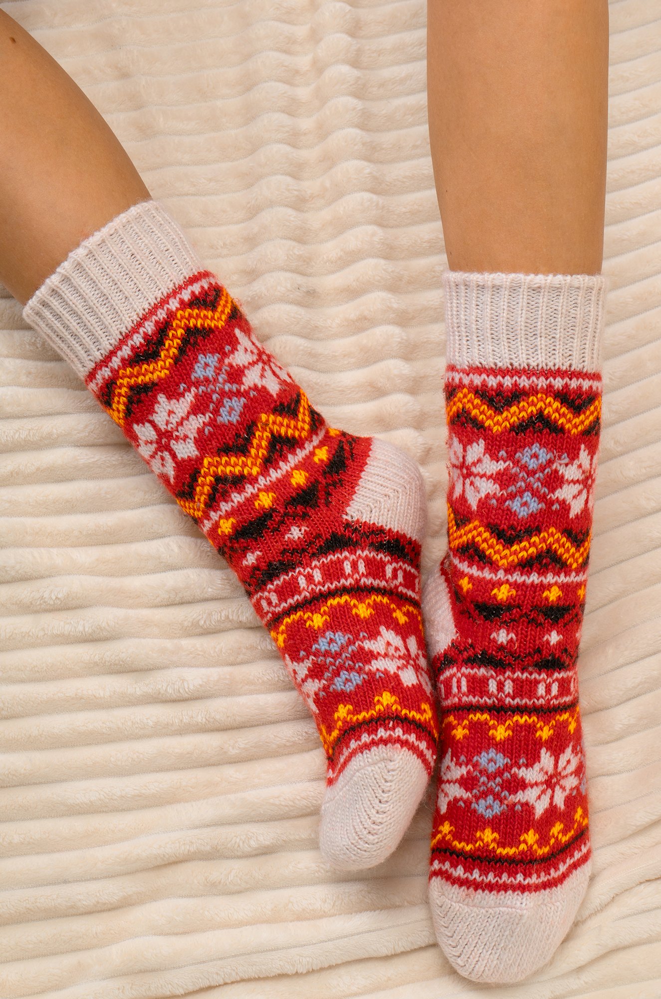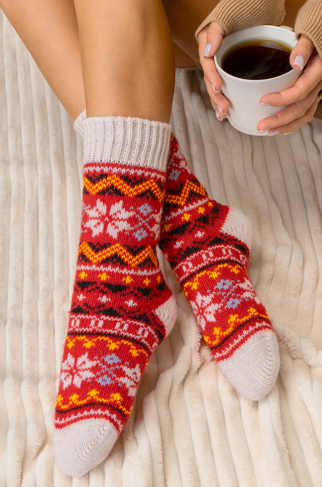 Теплые шерстяные носки для женщин выполнены из приятной к телу пряжи с высоким содержанием натуральной шерсти. Высокие носки с ярким узором принесут не только тепло, но и радость в холодные дни.