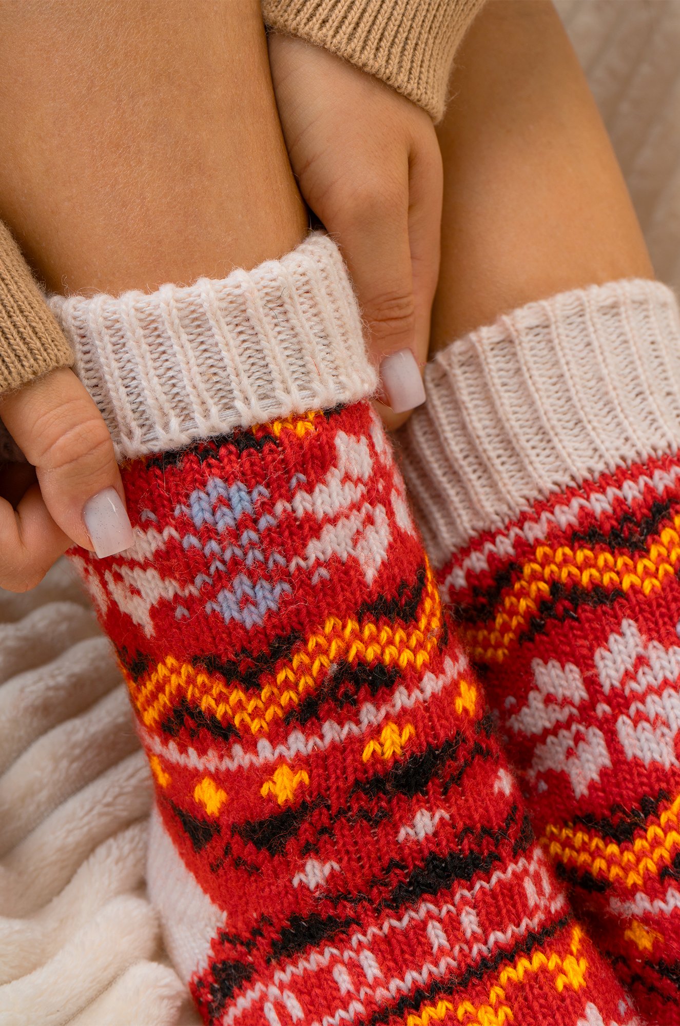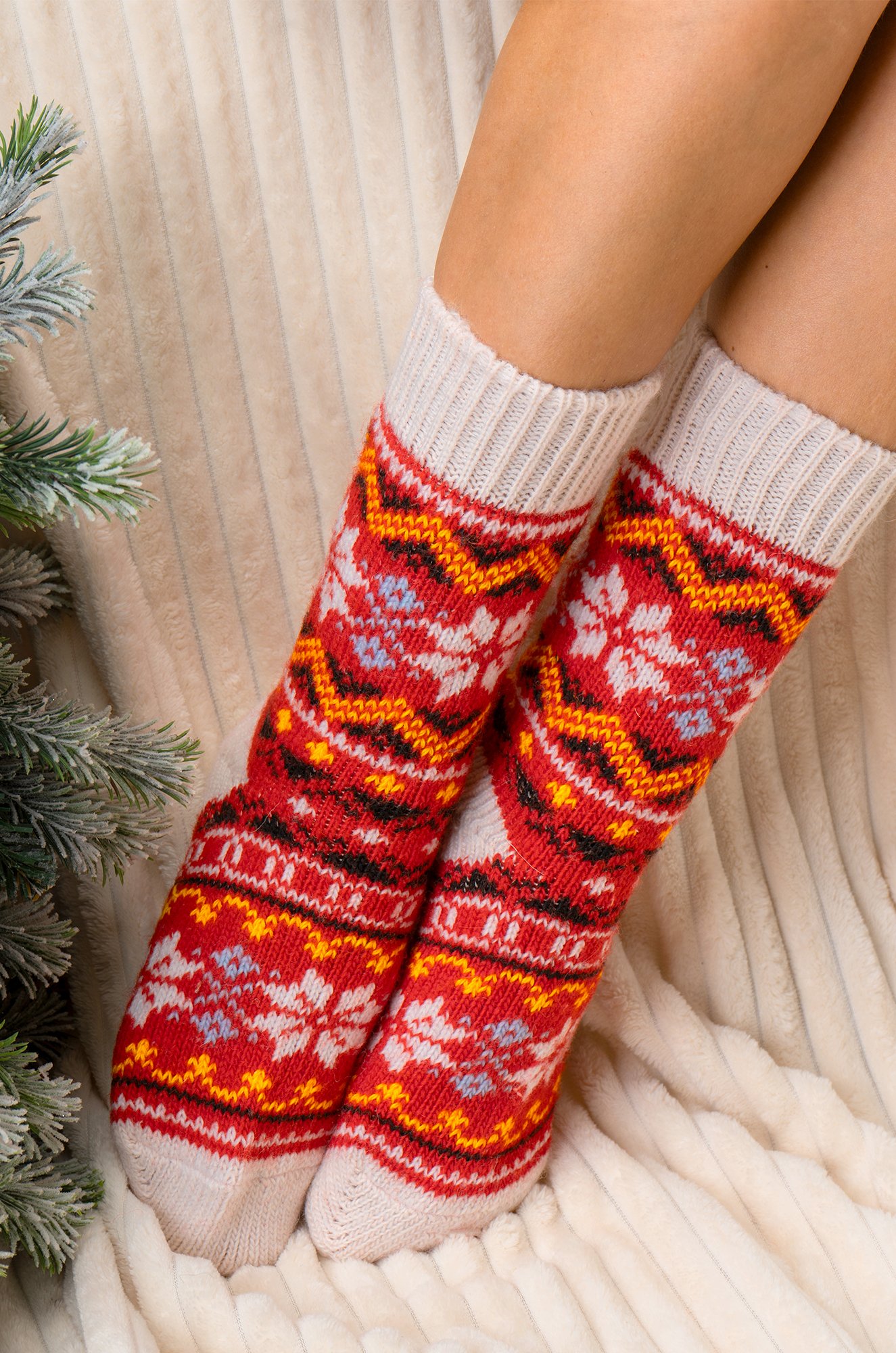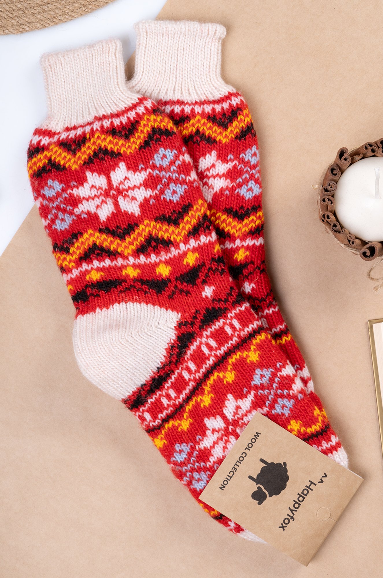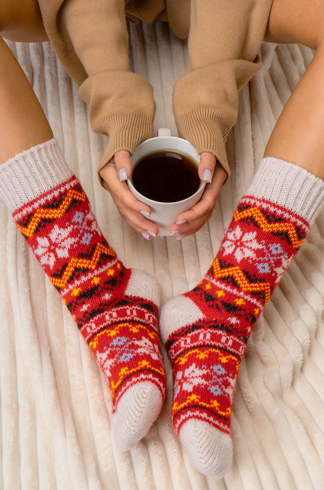 Теплые шерстяные носки для женщин выполнены из приятной к телу пряжи с высоким содержанием натуральной шерсти. Высокие носки с ярким узором принесут не только тепло, но и радость в холодные дни.
