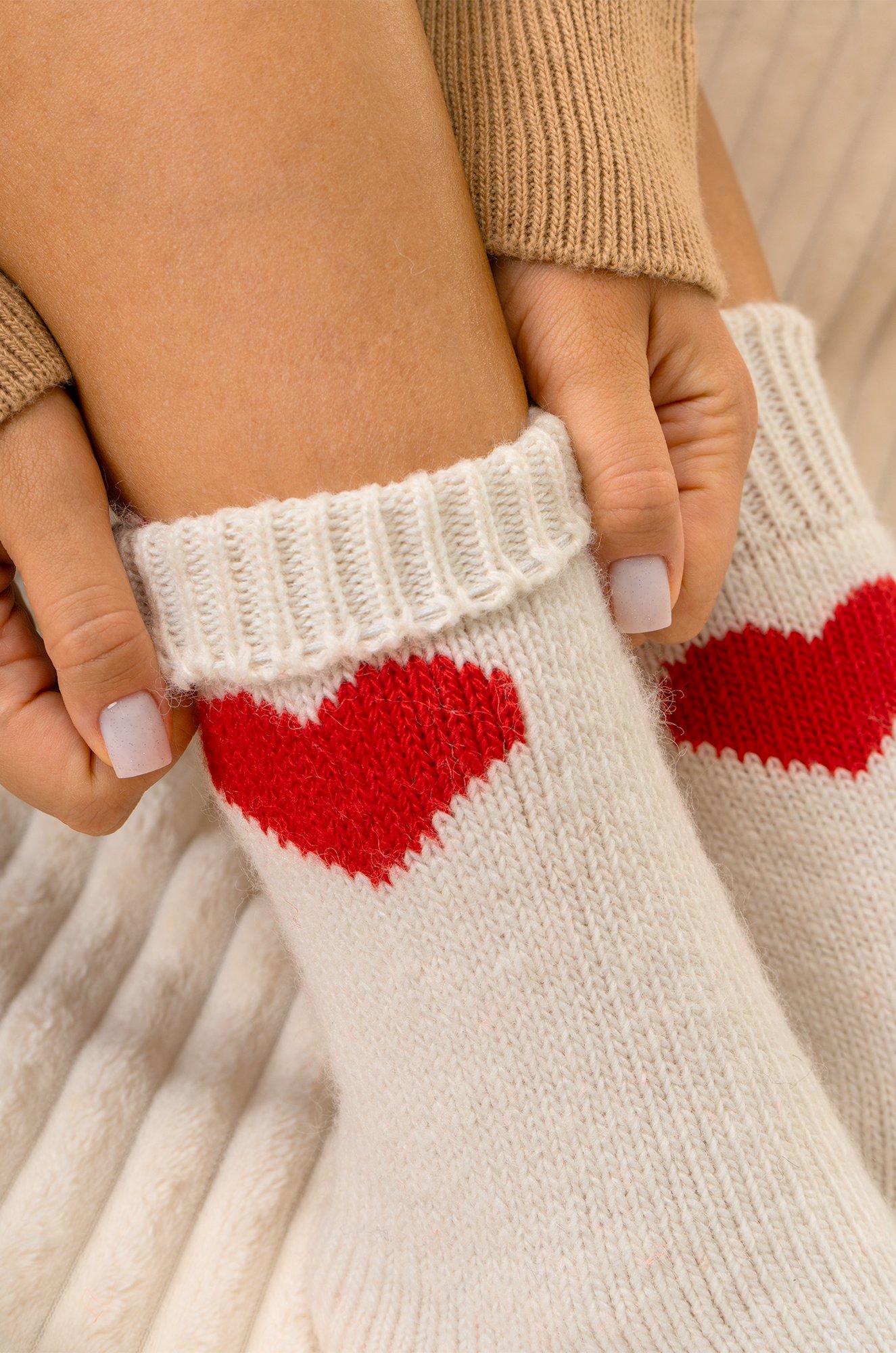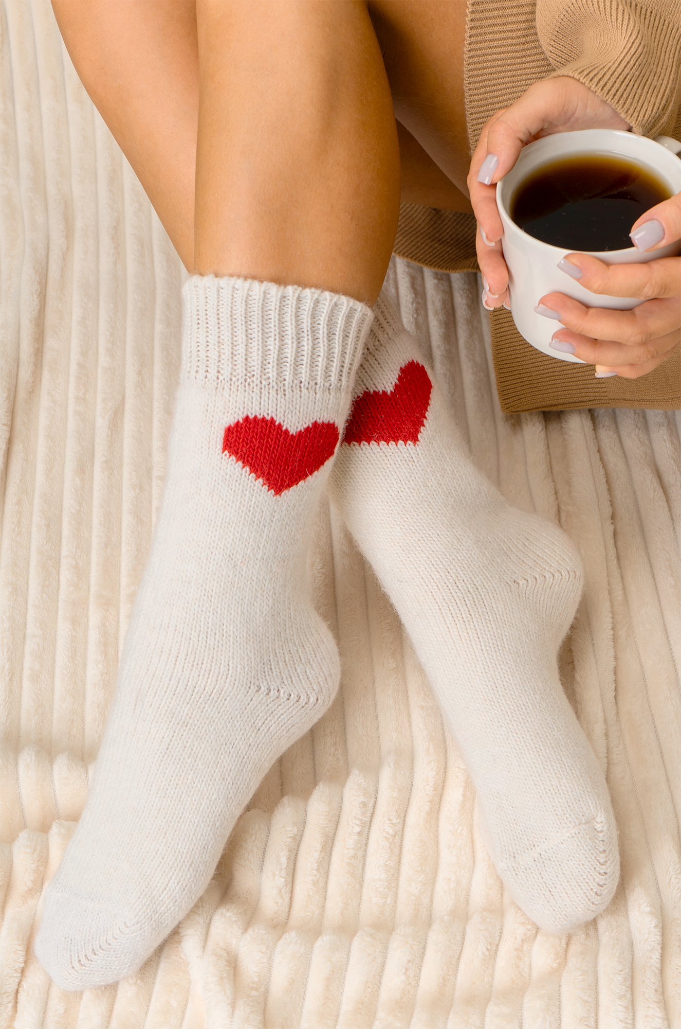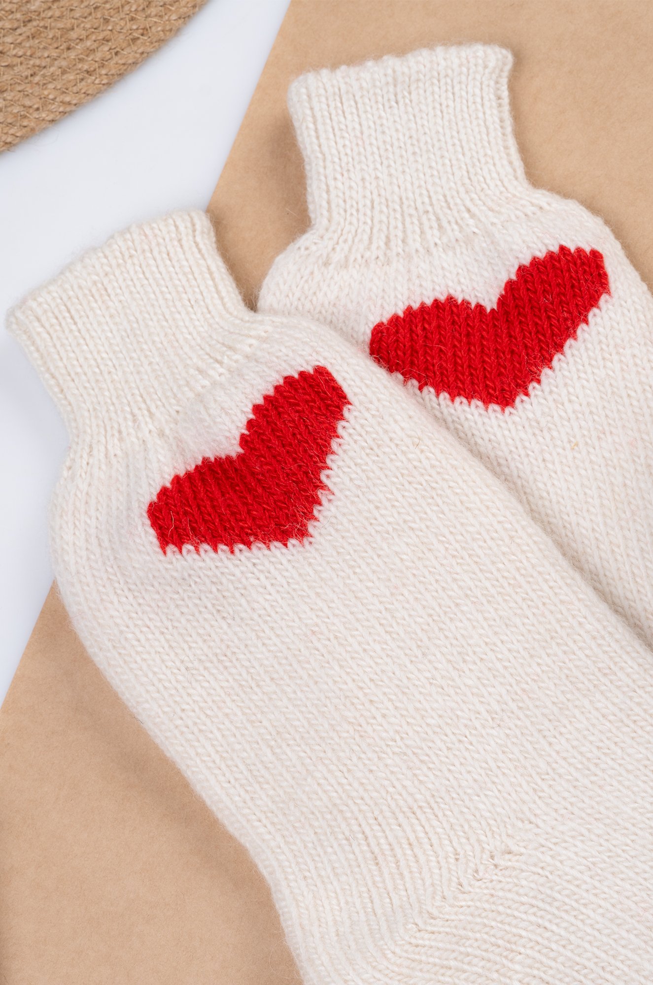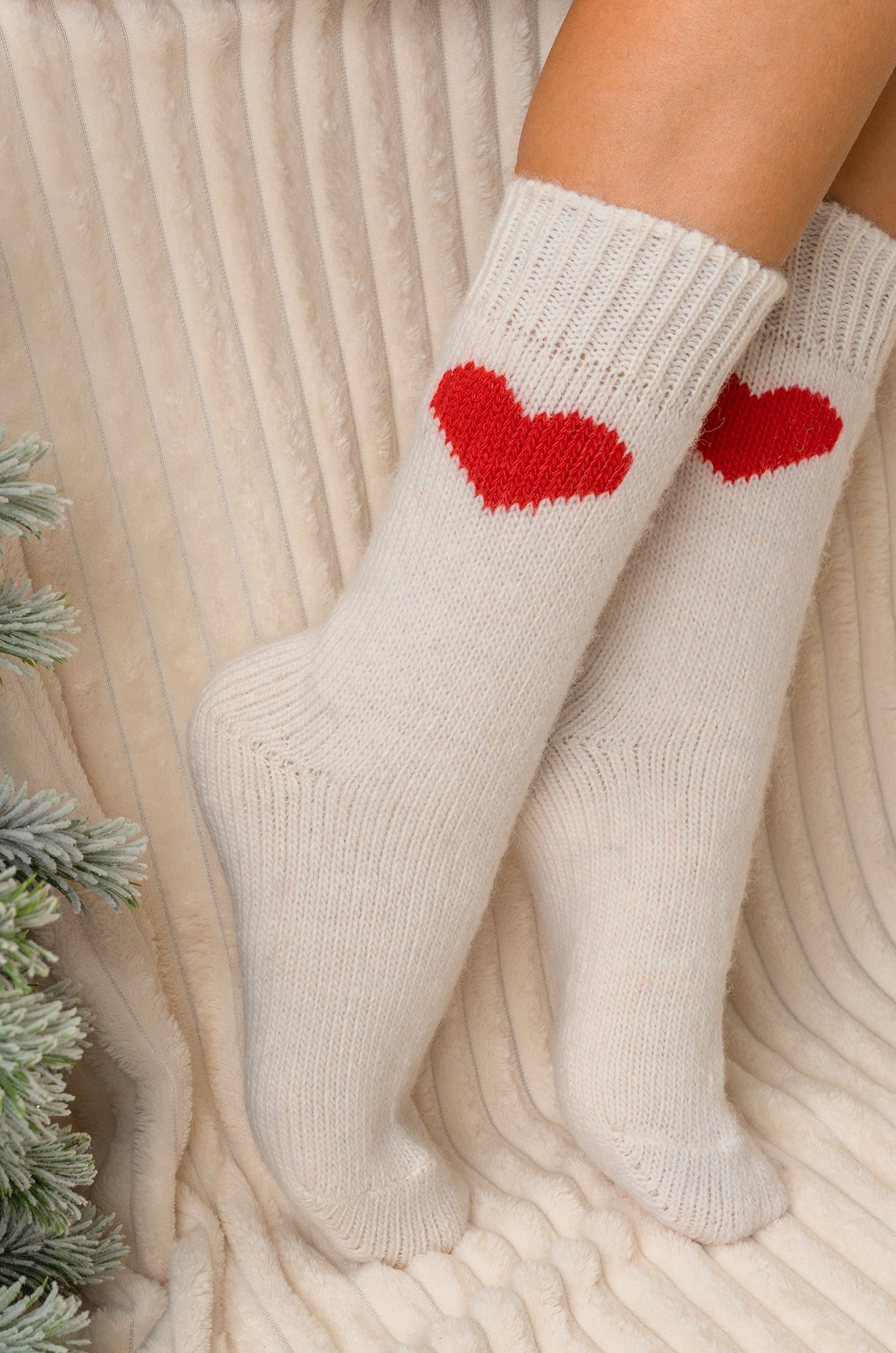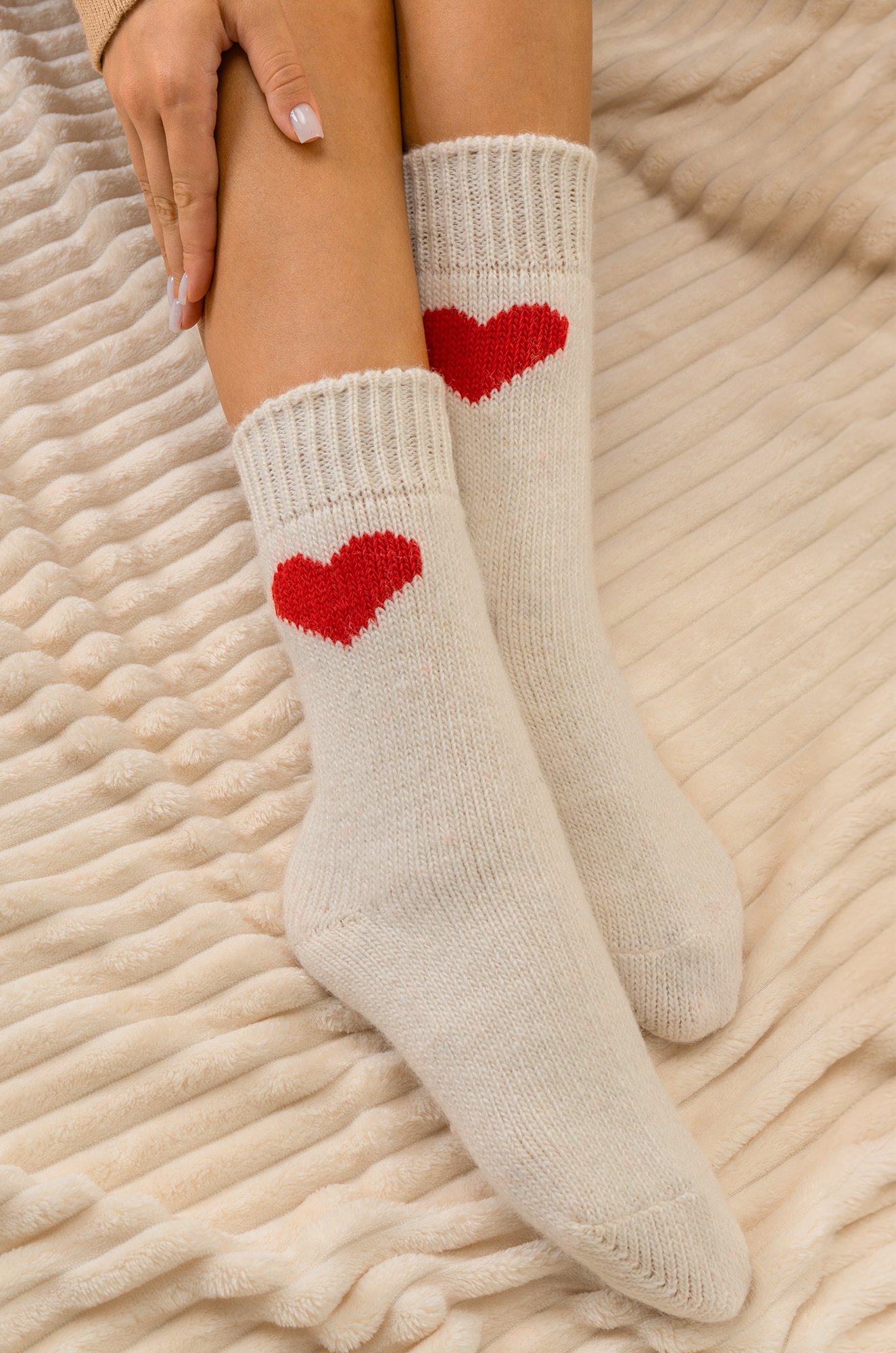 Теплые шерстяные носки для женщин выполнены из приятной к телу пряжи с высоким содержанием натуральной шерсти. Белые носки с ярким рисунком Сердце принесут не только тепло, но и радость в холодные дни.