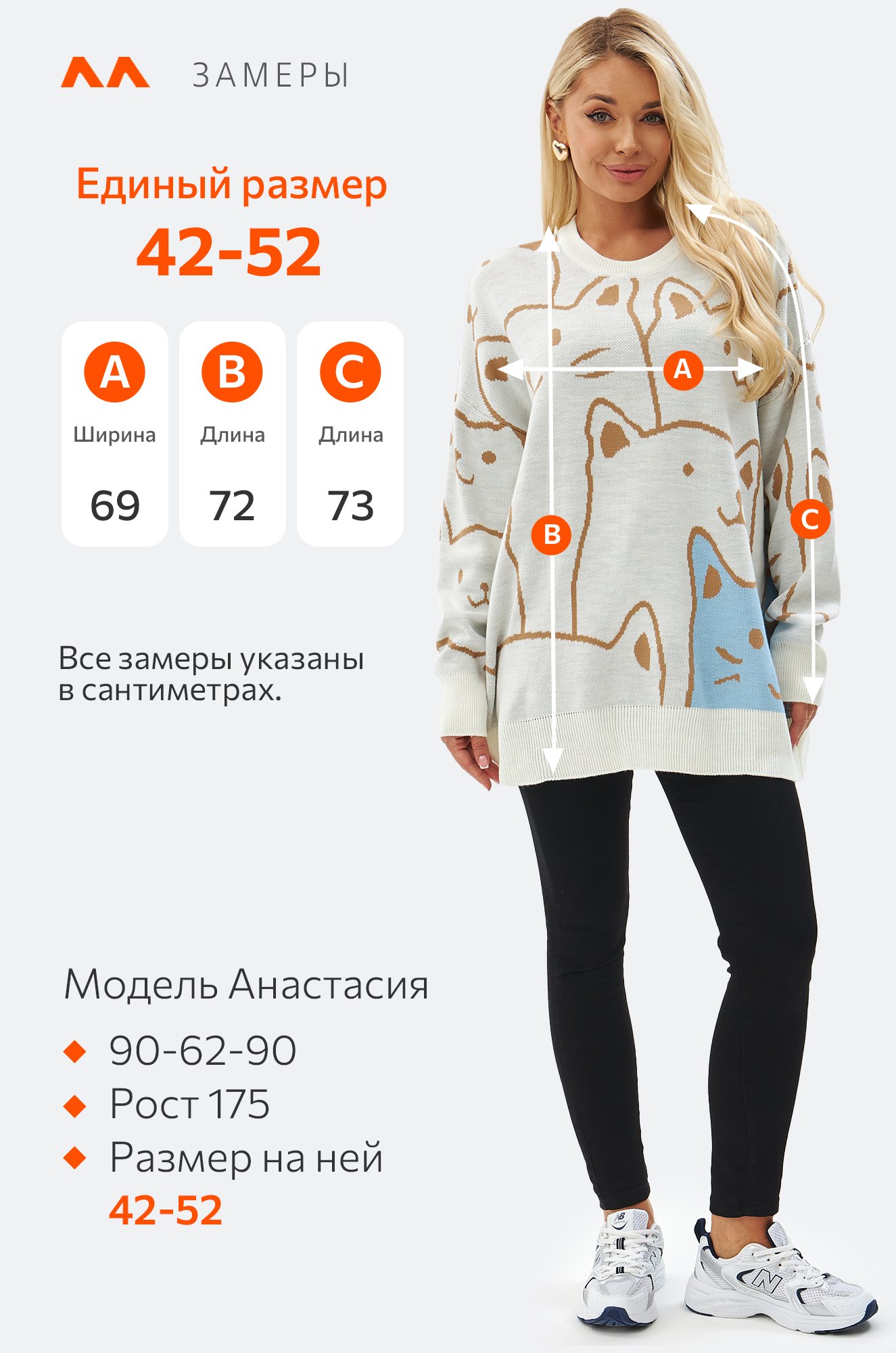 Модель Анастасия, рост 175 см, параметры 90-62-90 см. На ней молочный джемпер единого размера 42-52.