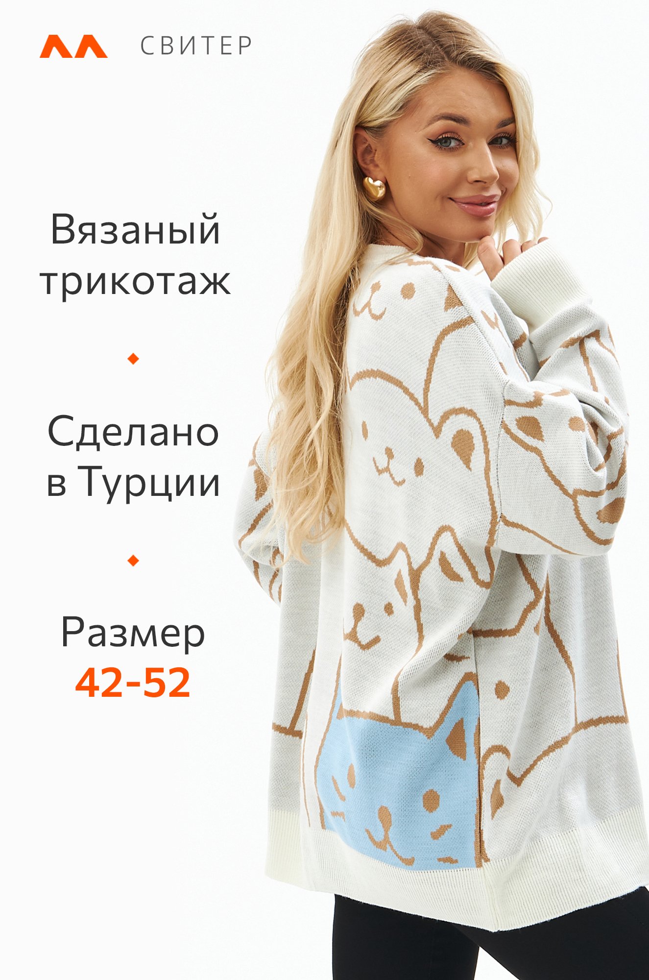 Трикотажный джемпер подойдет для женщин, которые ценят комфорт и немного веселья. Он идеален для уютных вечеров дома или прогулок по городу. Благодаря универсальному единому размеру свитер подходит для любого типа фигуры.