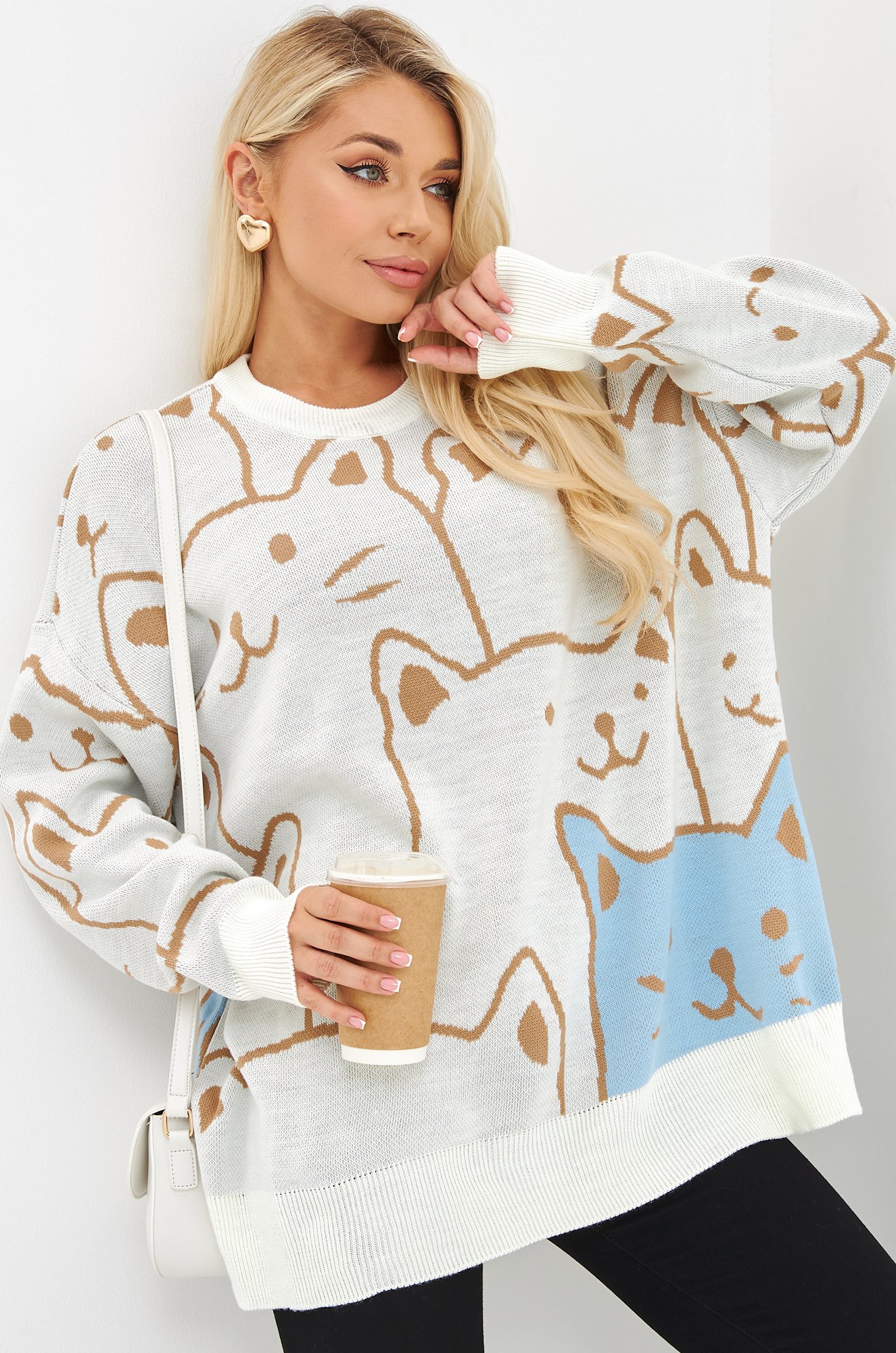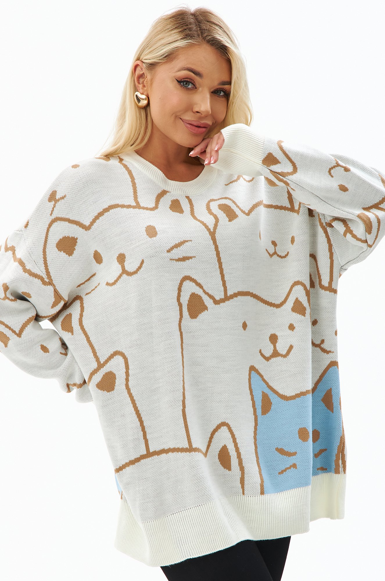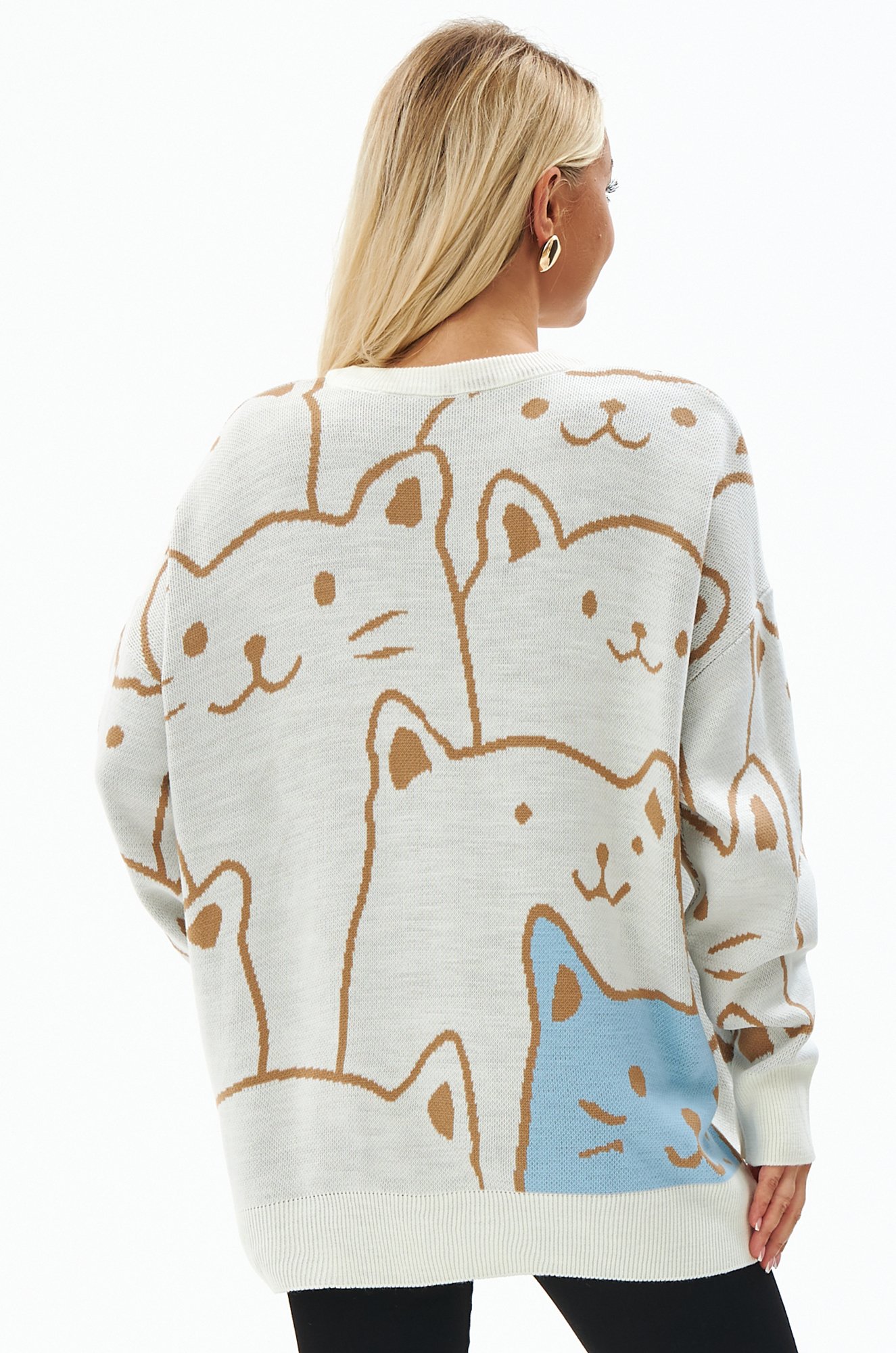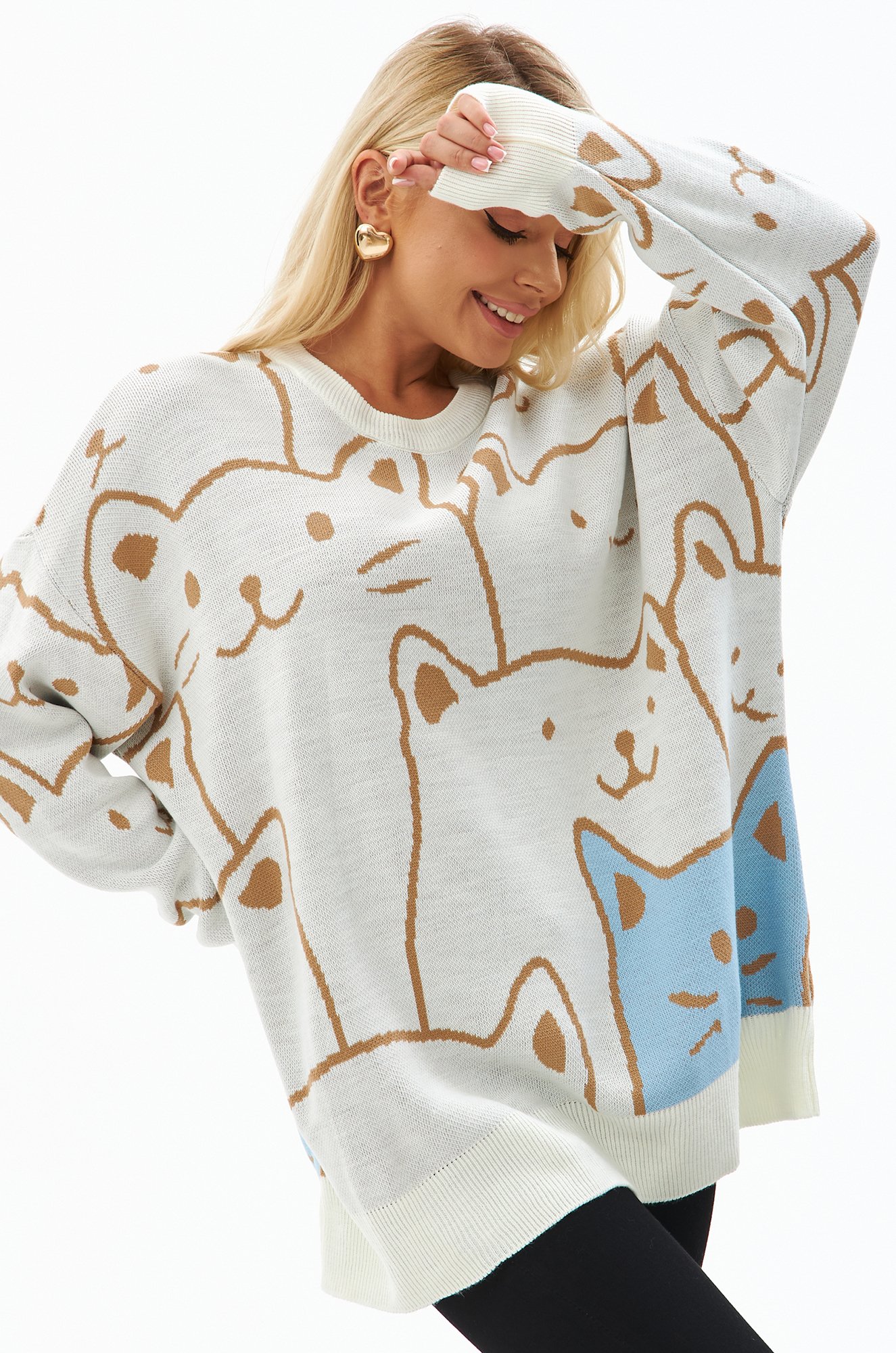 Свободный крой, длинные рукава и спущенное плечо придают джемперу расслабленный вид, а забавный рисунок котики добавляют ему уникальности.