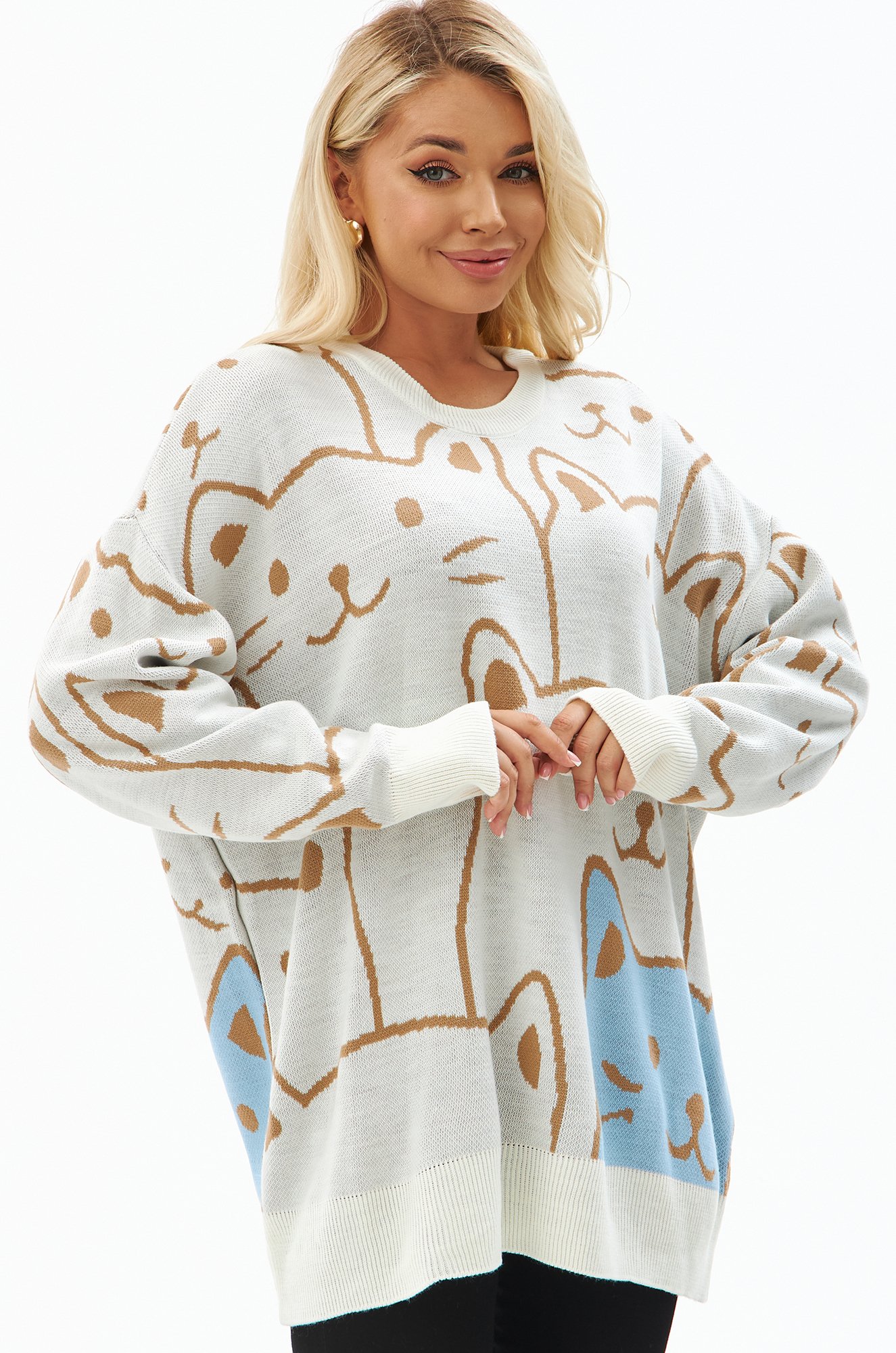 Женский джемпер с рисунком кошки — находка для тех, кто любит весело и тепло проводить зимние дни. Свитер оверсайз с оригинальным рисунком наполнит уютом каждый день.