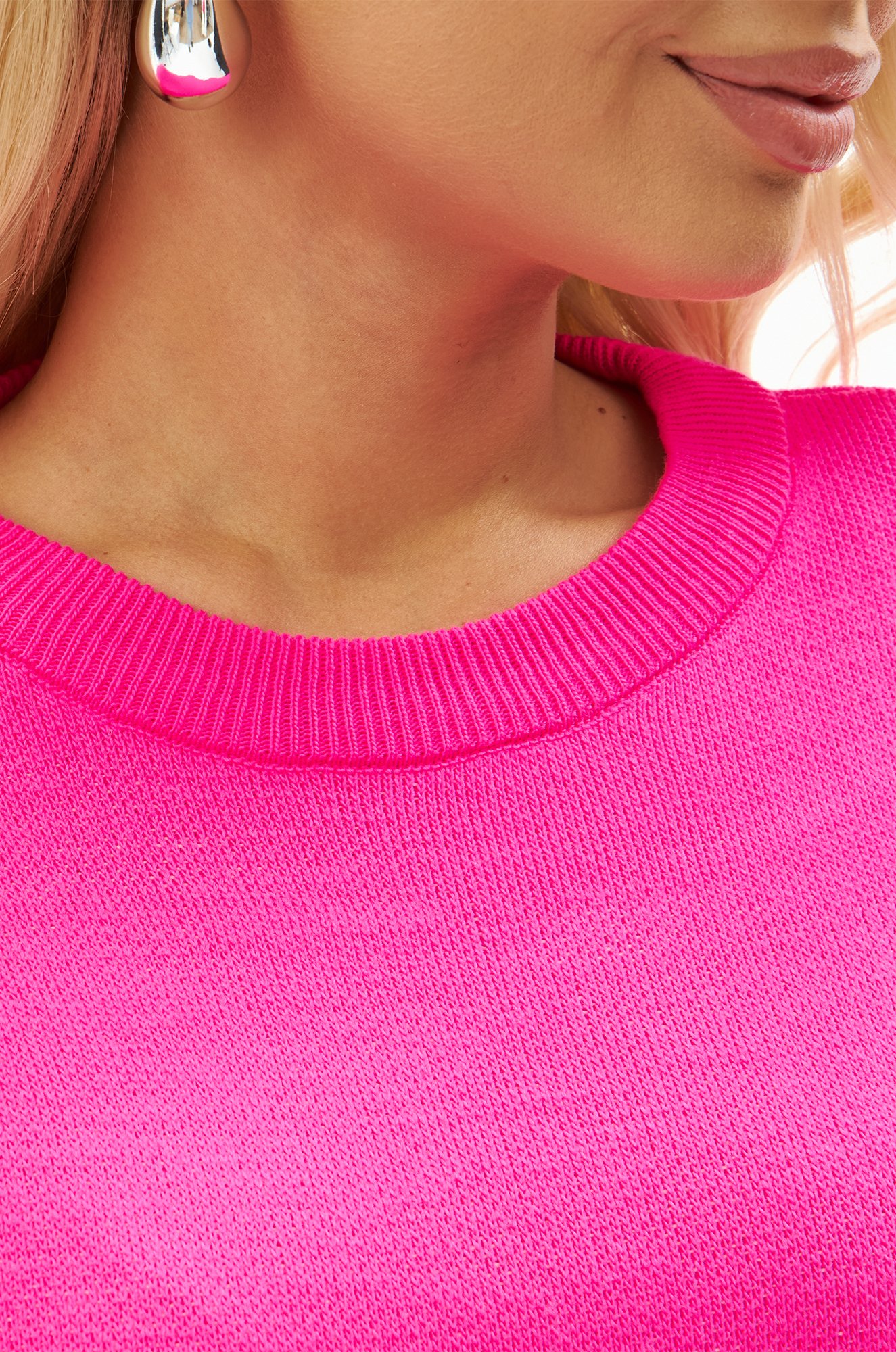 Модель Анастасия, рост 175 см, параметры 90-62-90 см. На ней неоновый джемпер единого размера 42-52.