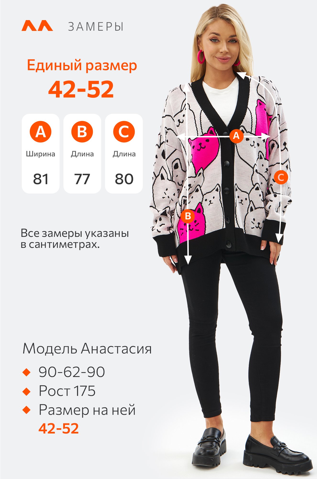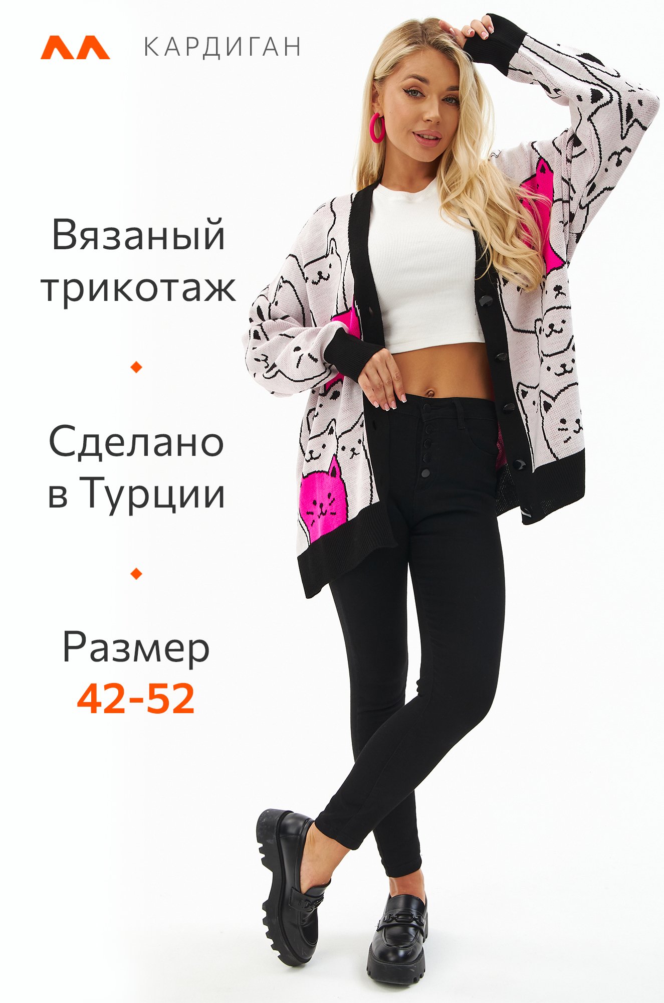 Трикотажная кофта с застежкой на пуговицы подойдет для женщин, которые ценят комфорт и немного веселья. Она идеальна для уютных вечеров дома или прогулок по городу. Благодаря универсальному размеру кардиган подходит для любого типа фигуры.