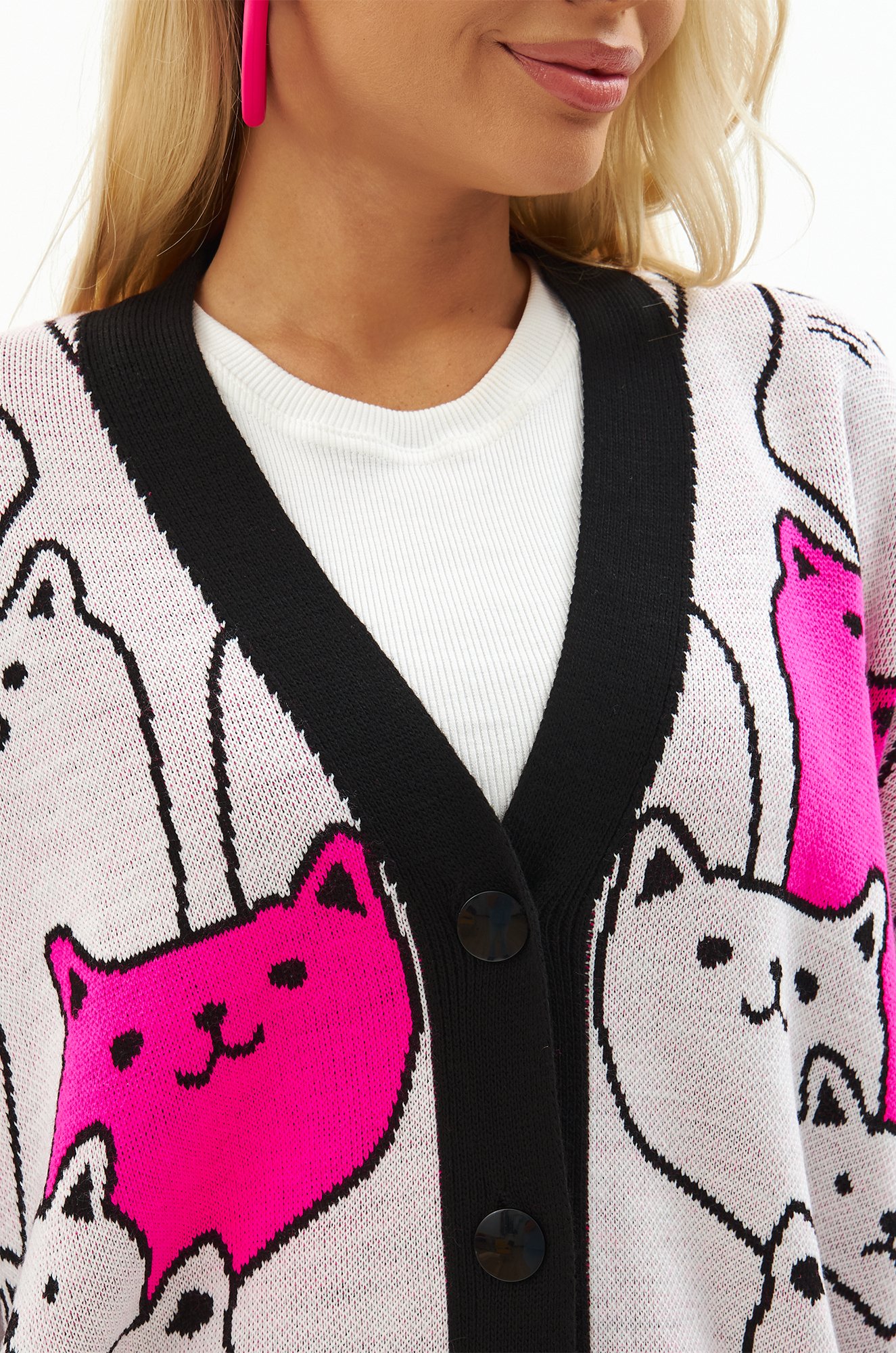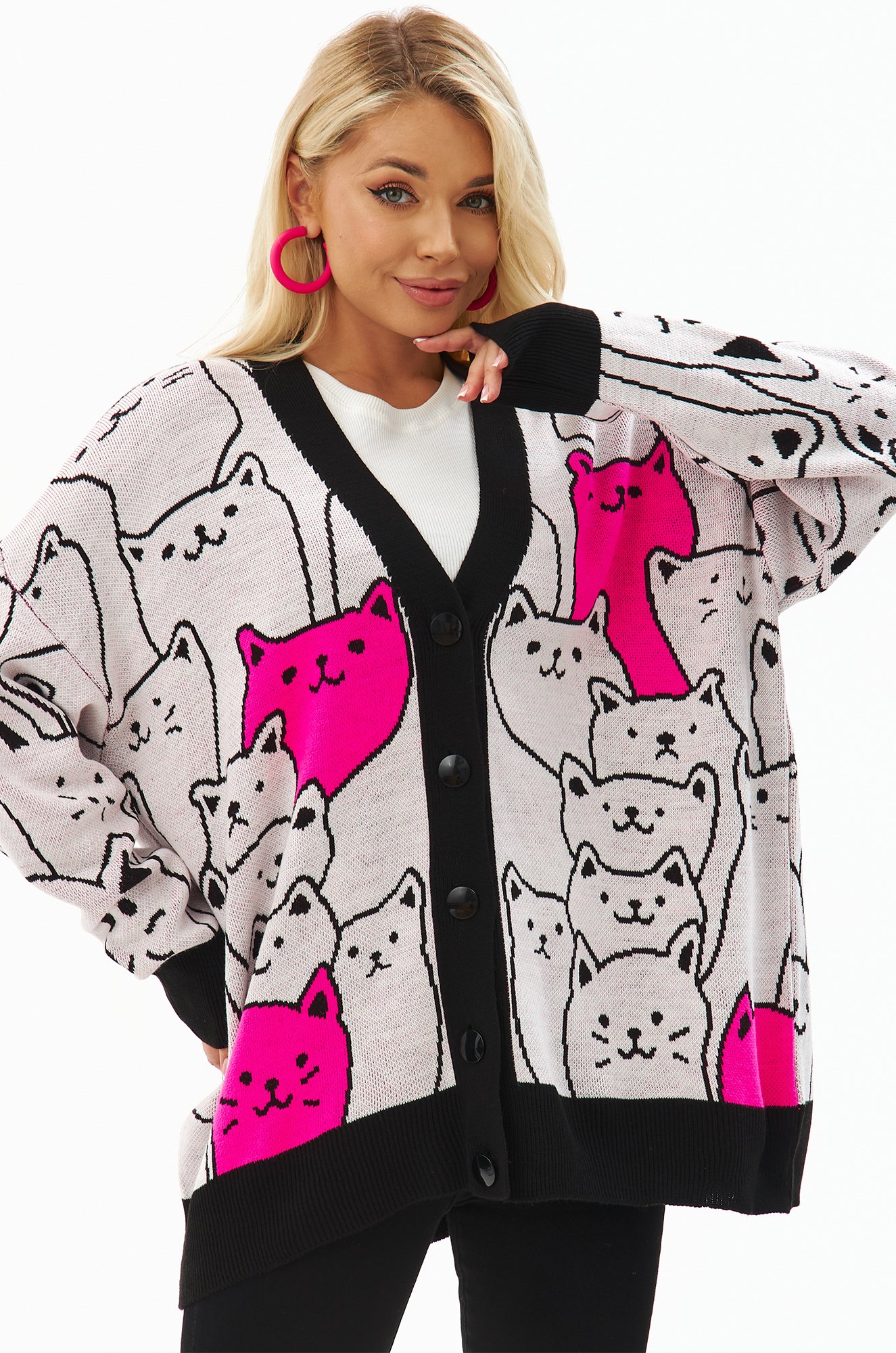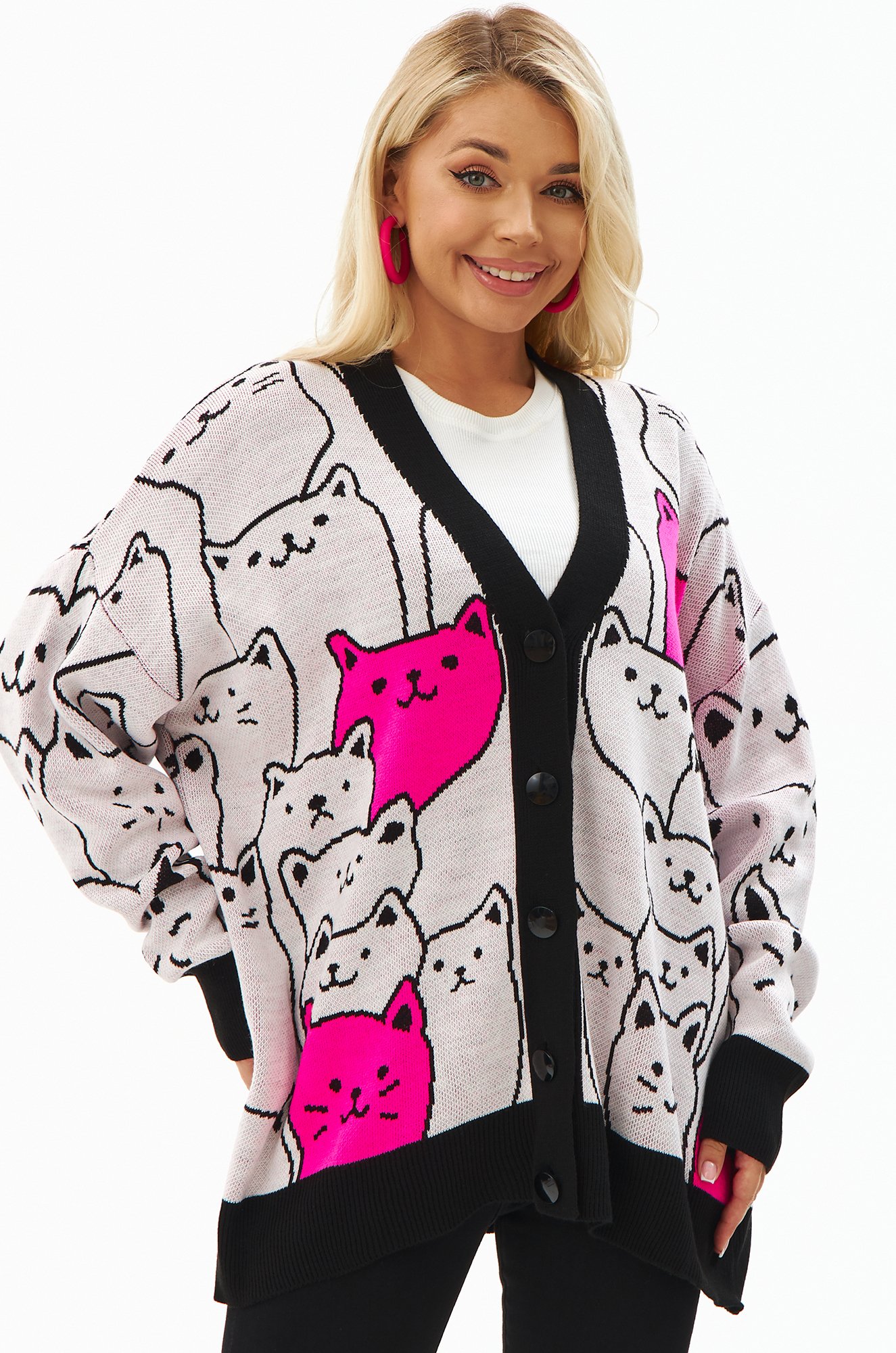 Женский кардиган с рисунком кошки — находка для тех, кто любит весело и тепло проводить зимние дни. Удлиненная кофта оверсайз с оригинальным рисунком наполнит уютом каждый день.