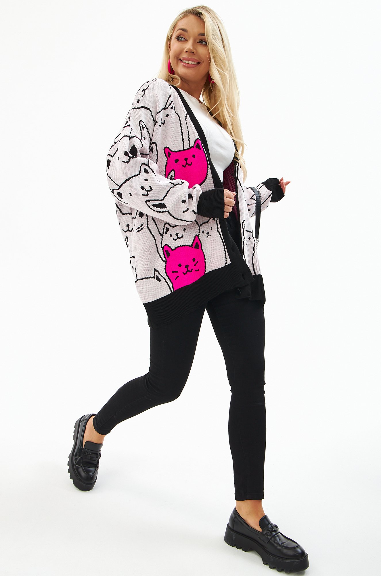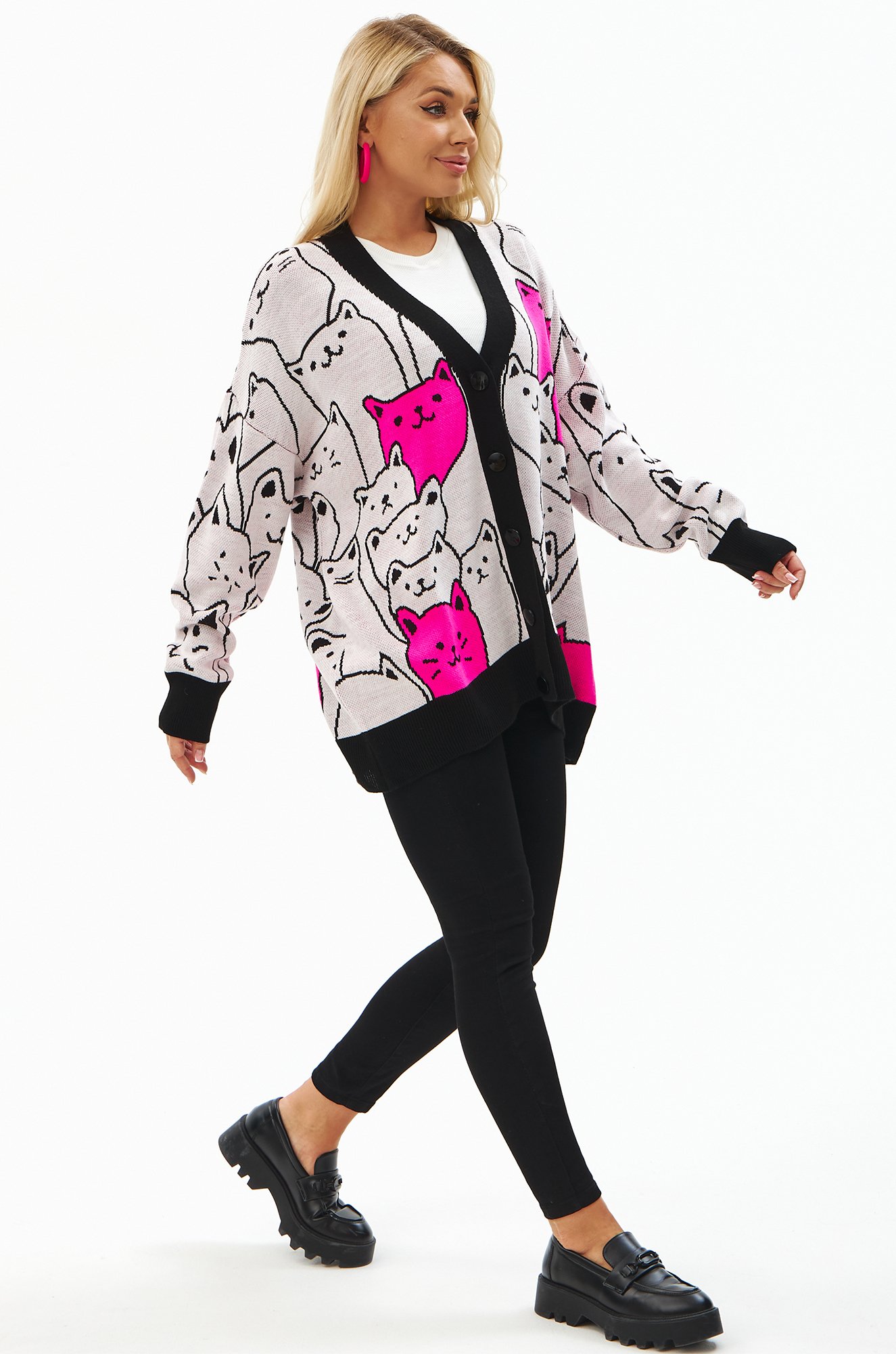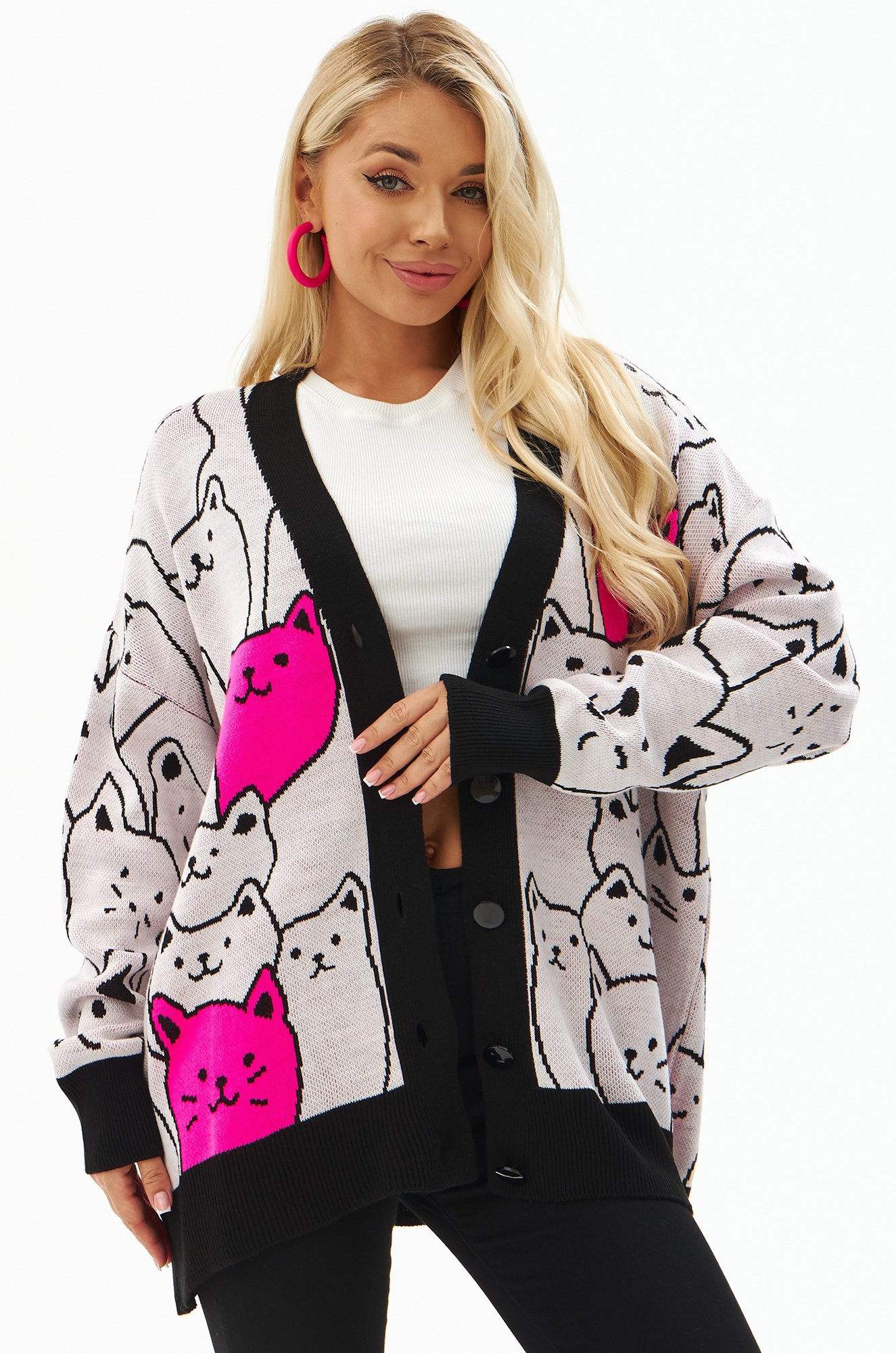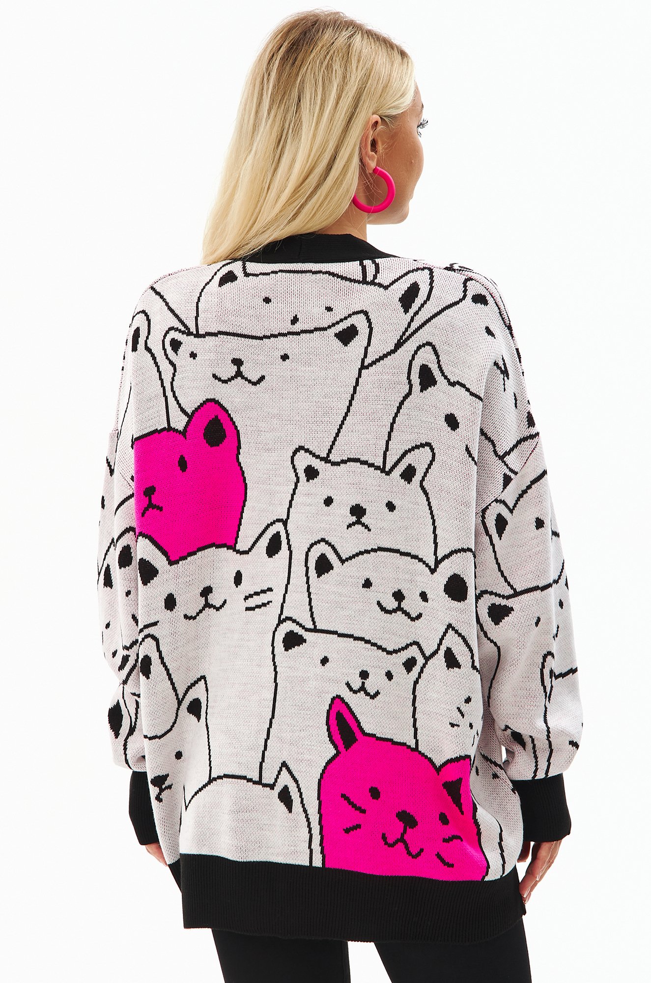 Женский кардиган с рисунком кошки — находка для тех, кто любит весело и тепло проводить зимние дни. Удлиненная кофта оверсайз с оригинальным рисунком наполнит уютом каждый день.