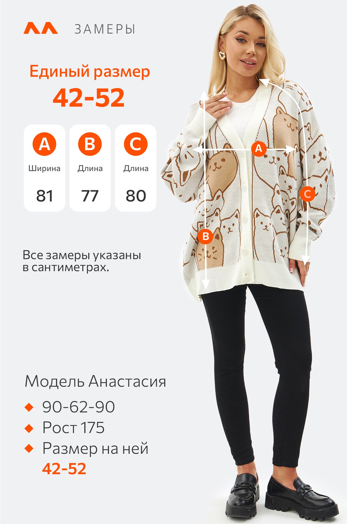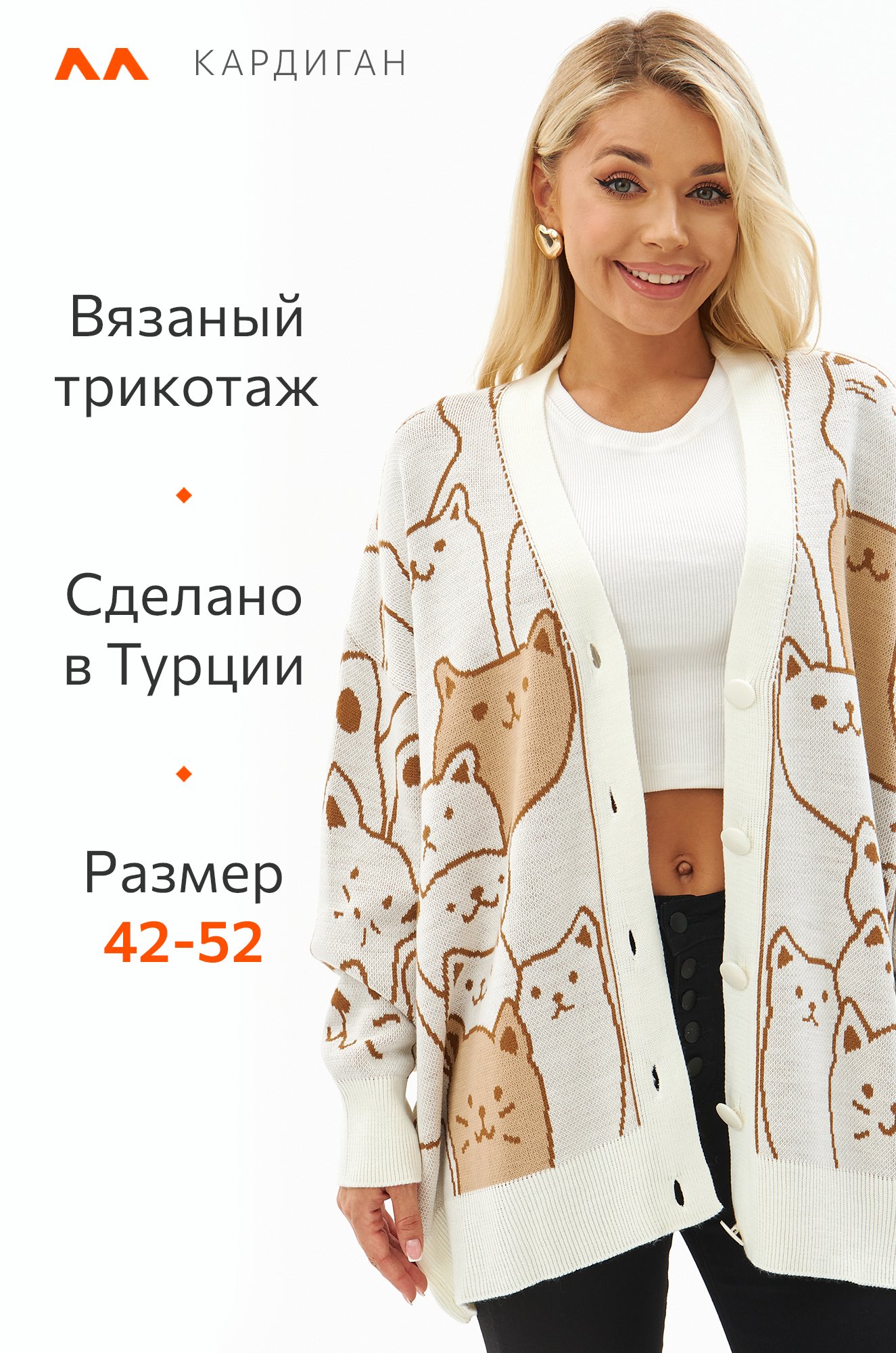 Трикотажная кофта с застежкой на пуговицы подойдет для женщин, которые ценят комфорт и немного веселья. Она идеальна для уютных вечеров дома или прогулок по городу. Благодаря универсальному размеру кардиган подходит для любого типа фигуры.