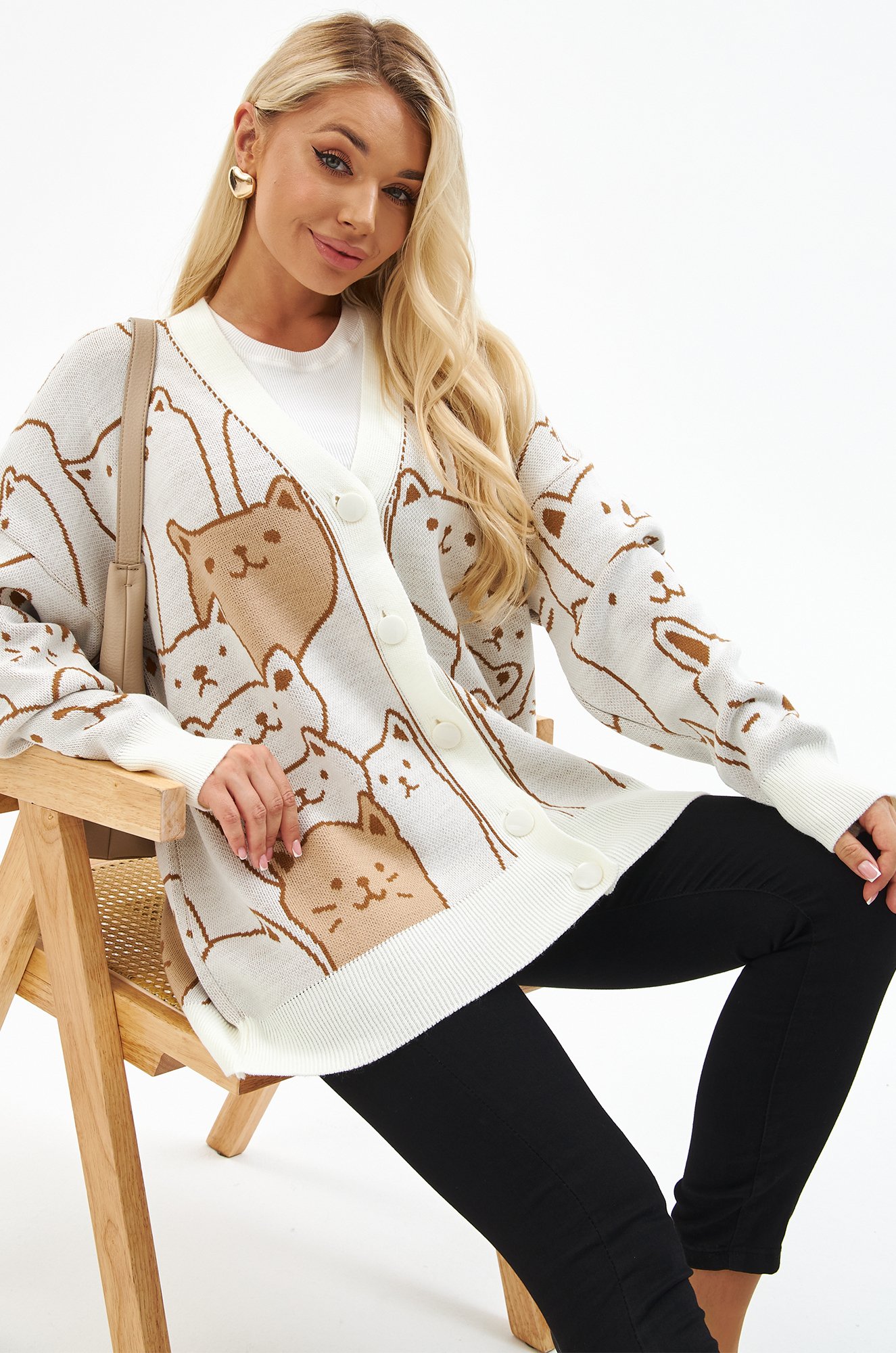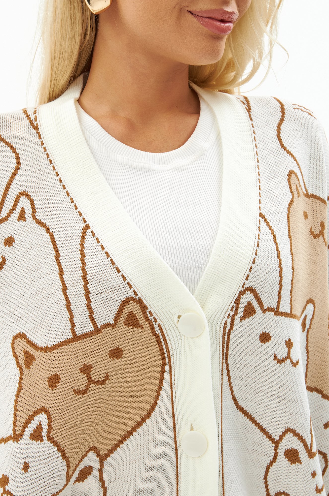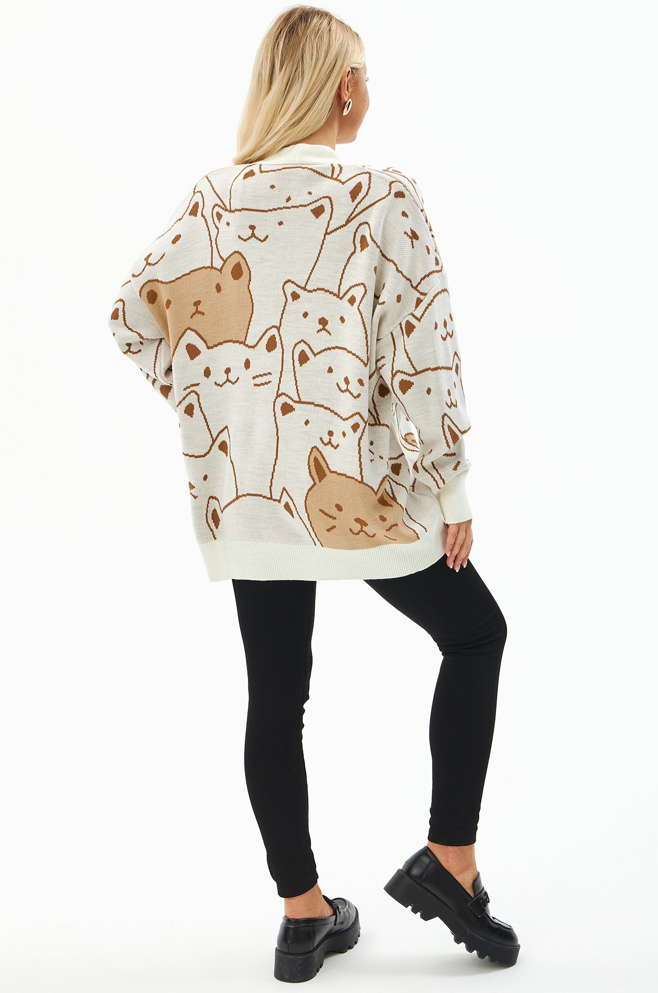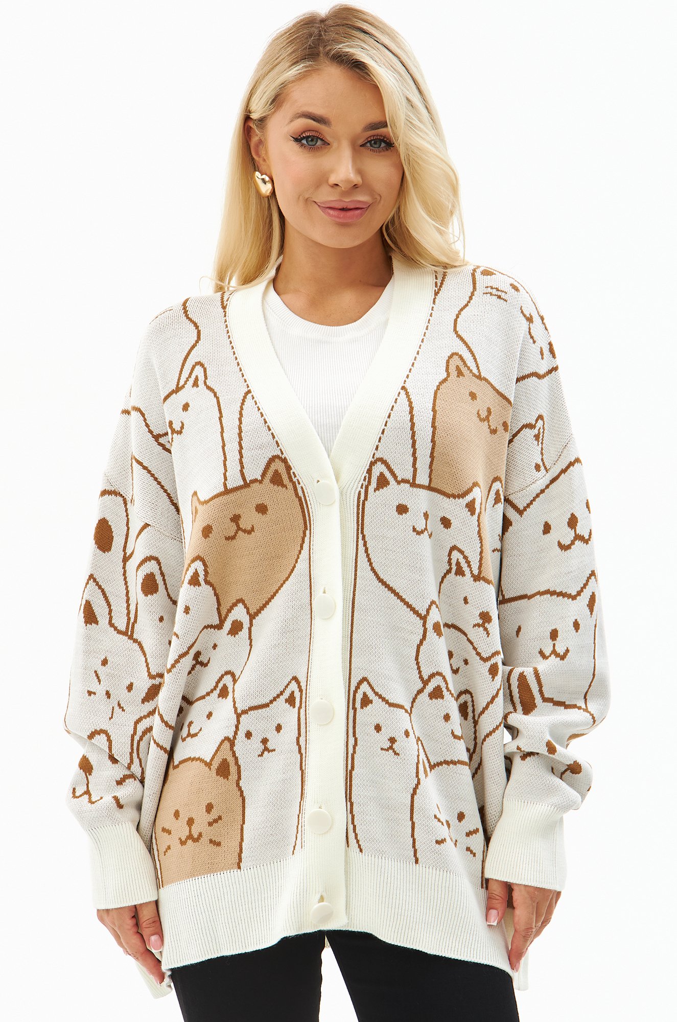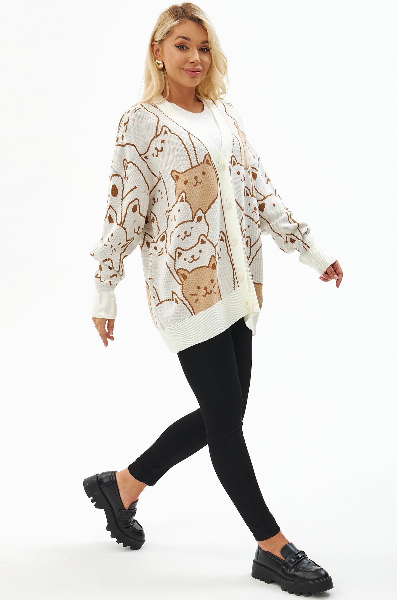 Женский кардиган с рисунком кошки — находка для тех, кто любит весело и тепло проводить зимние дни. Удлиненная кофта оверсайз с оригинальным рисунком наполнит уютом каждый день.