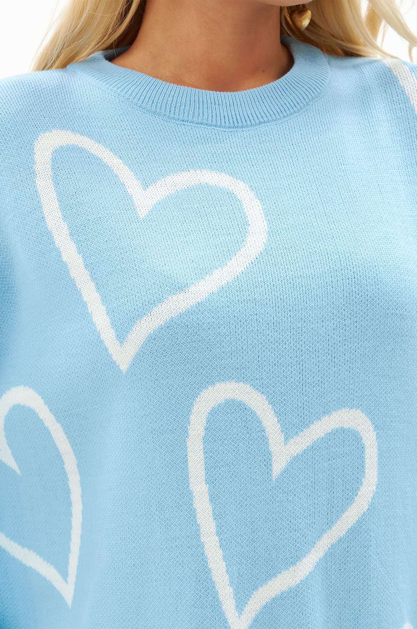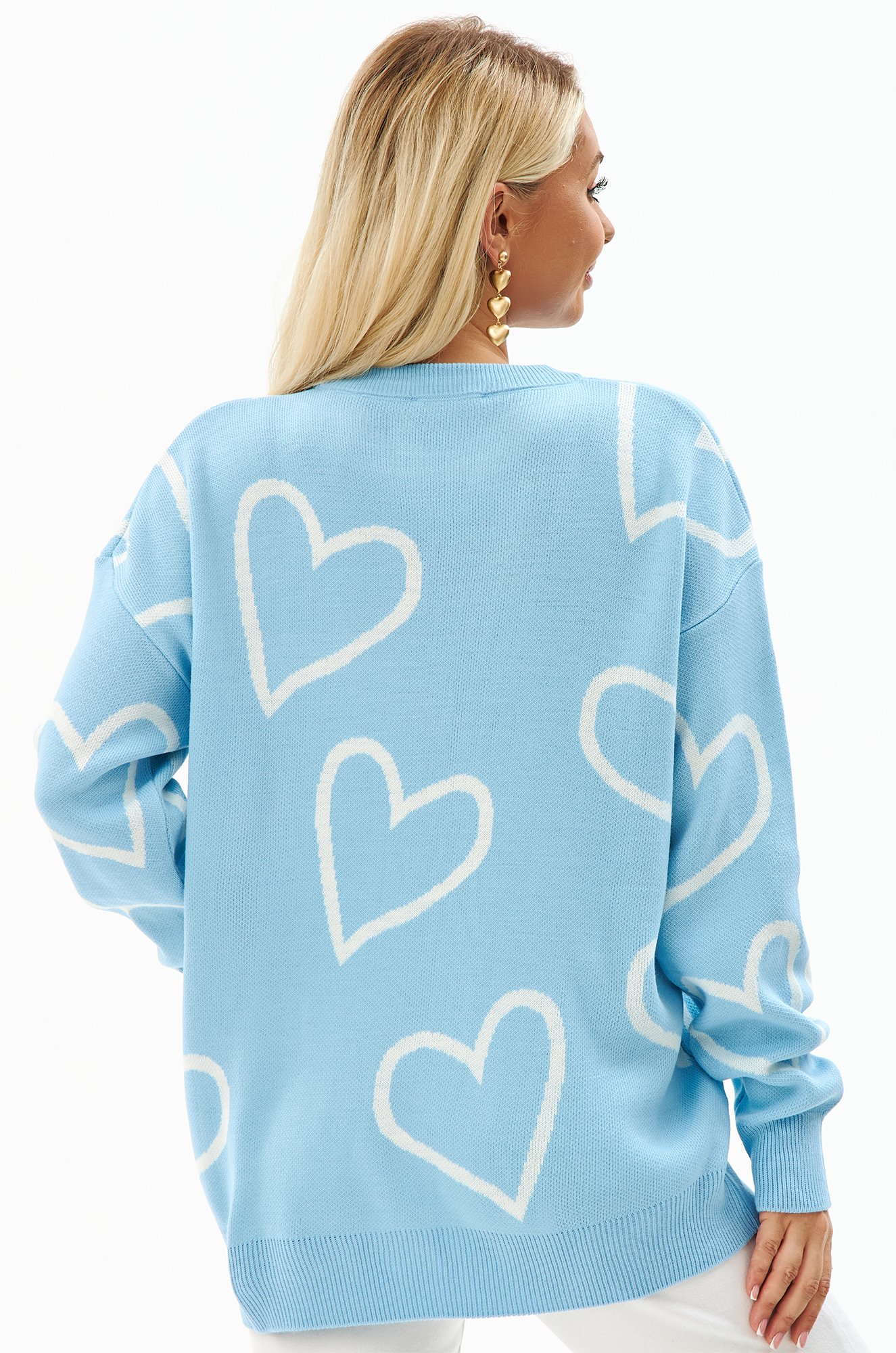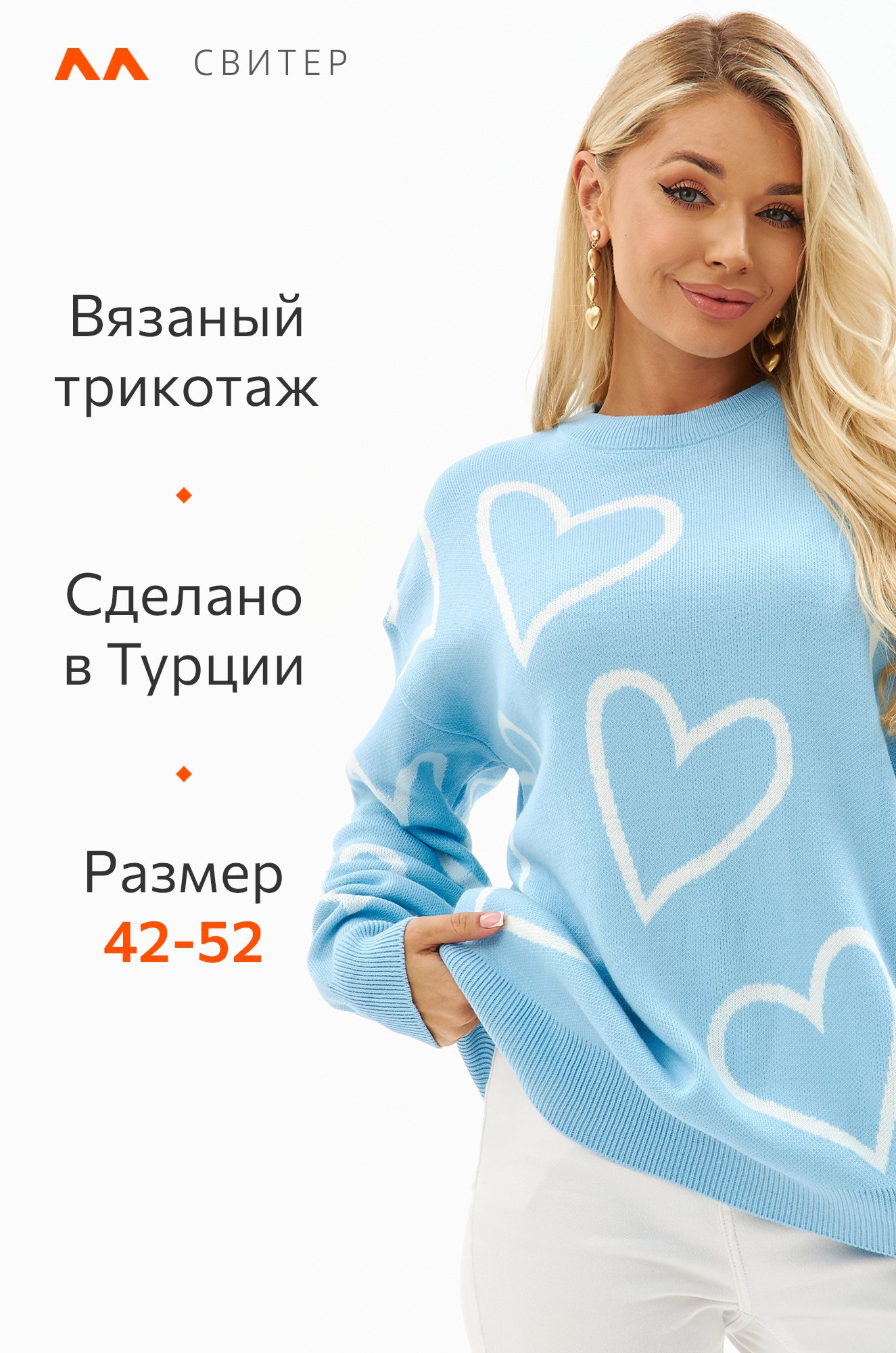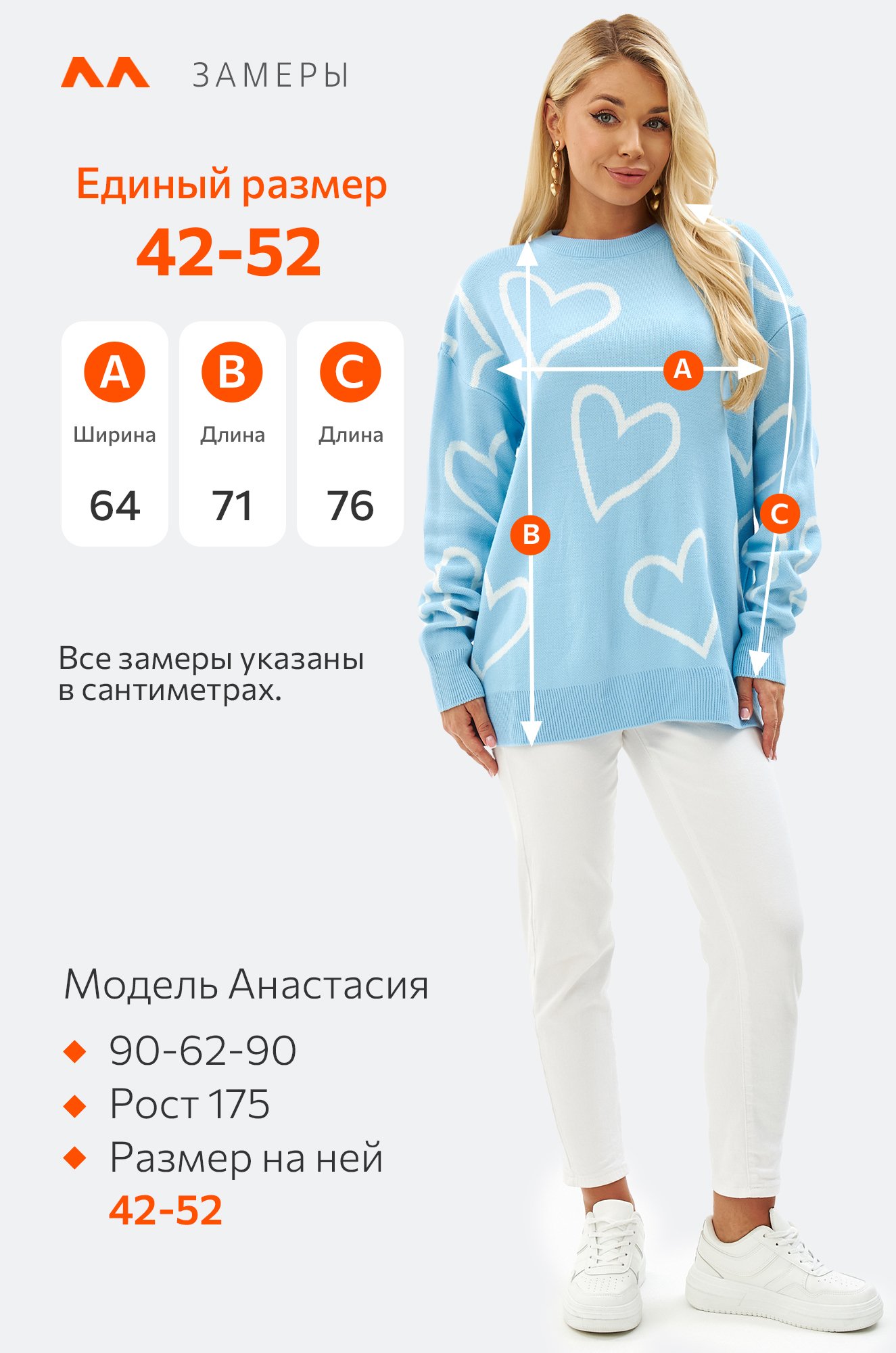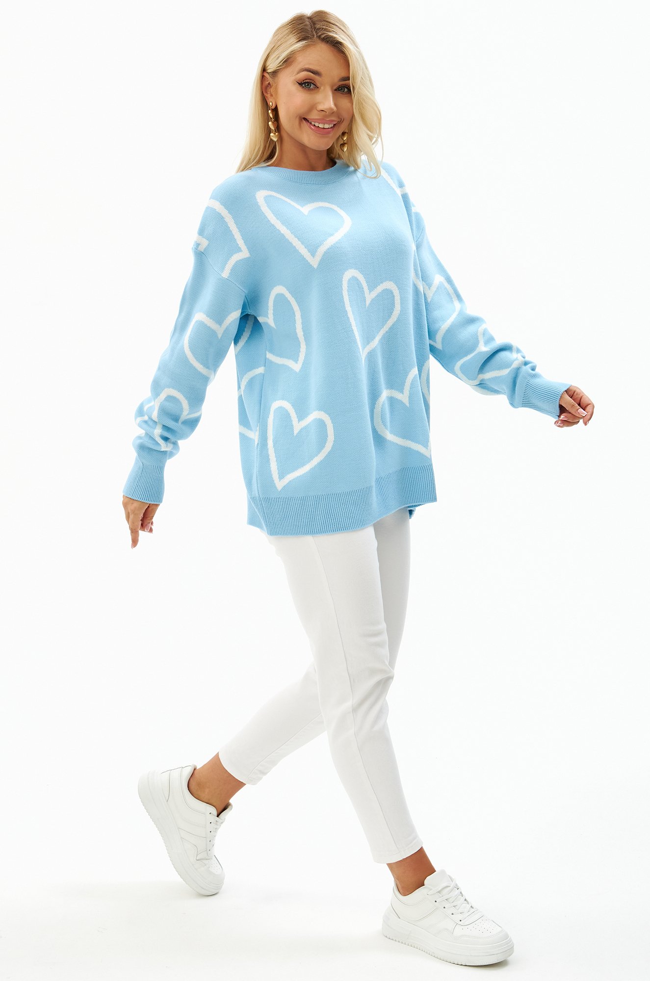 Голубой свитер оверсайз с рисунком сердечки станет новым фаворитом для уютных зимних дней. Он сочетает в себе стиль и комфорт, создавая теплый и чарующий образ. Спущенные плечи и длинные рукава придают женскому джемперу элегантный вид и делают его идеальным для холодной погоды.