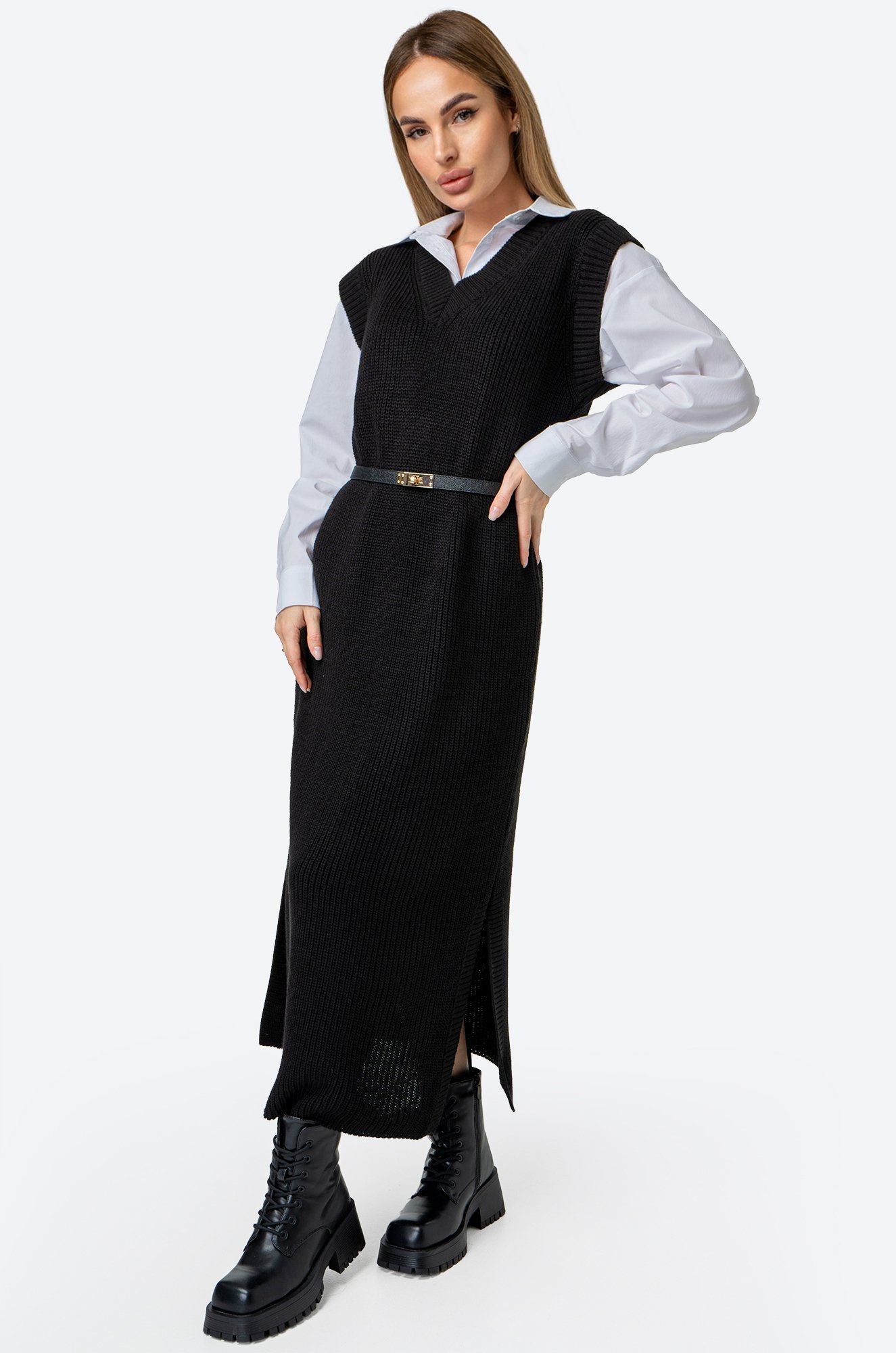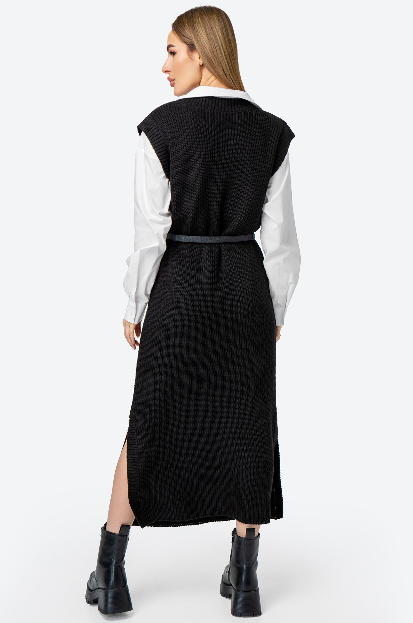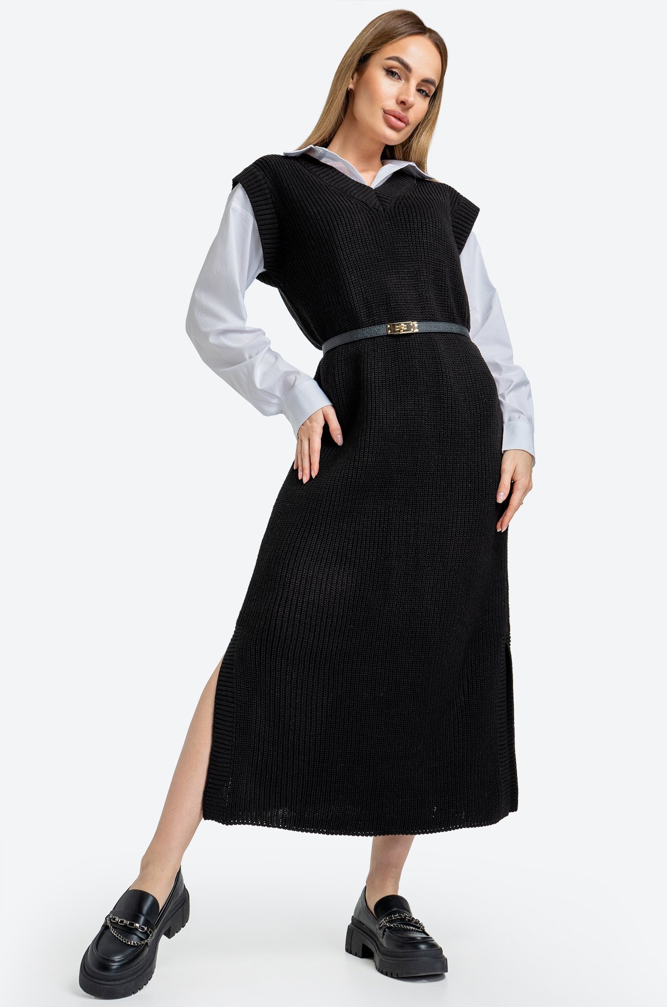 Платье-жилетка миди дарит комфорт благодаря свободному крою. Нежная фактурная вязка делает образ уютным, а V-вырез и разрезы добавляют нотку кокетства.