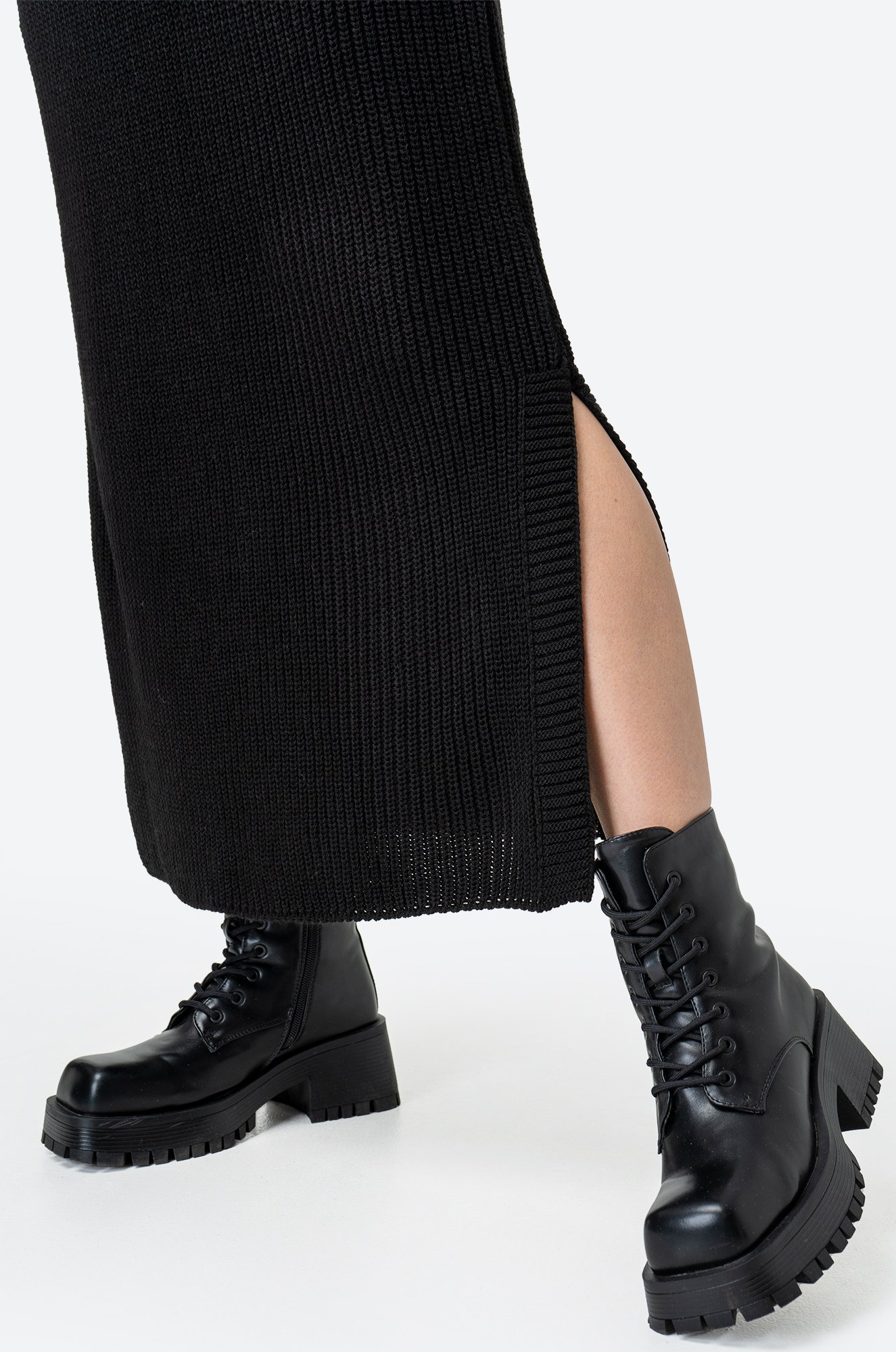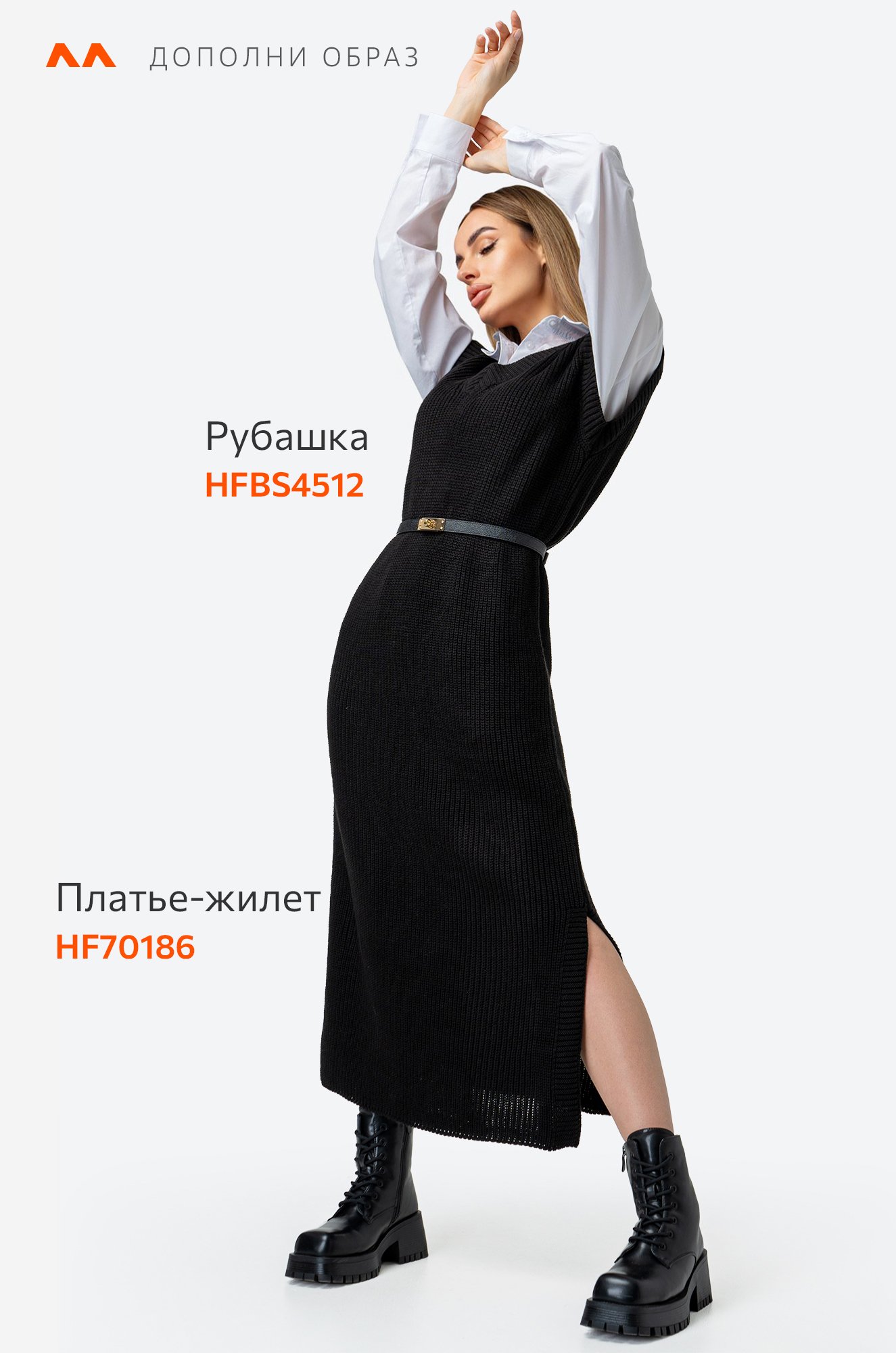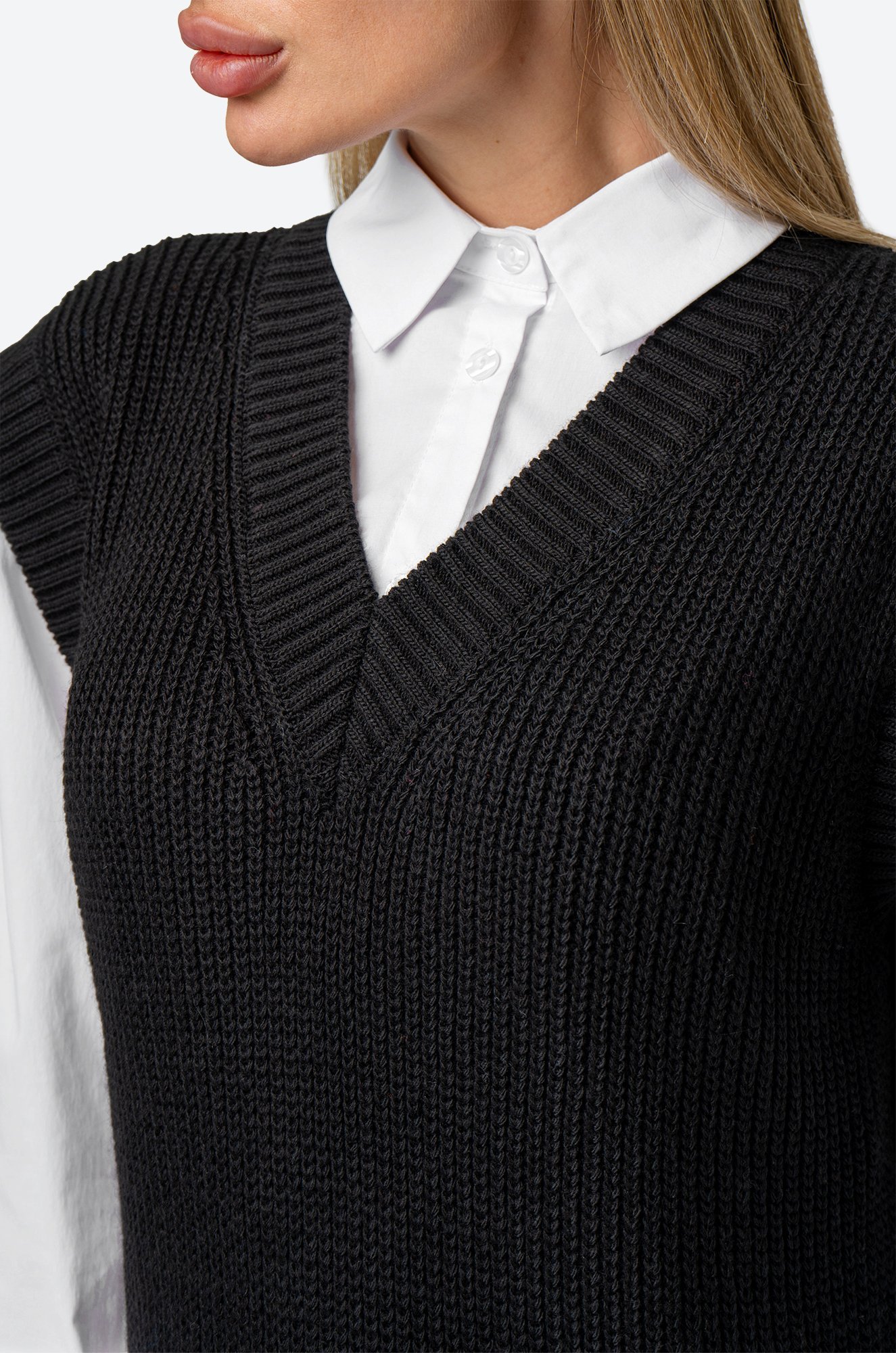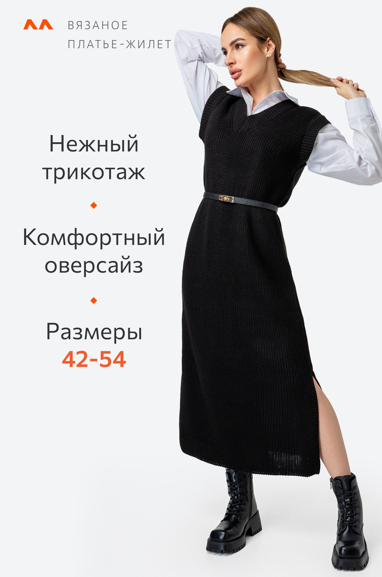 Платье-жилетка миди дарит комфорт благодаря свободному крою. Нежная фактурная вязка делает образ уютным, а V-вырез и разрезы добавляют нотку кокетства.