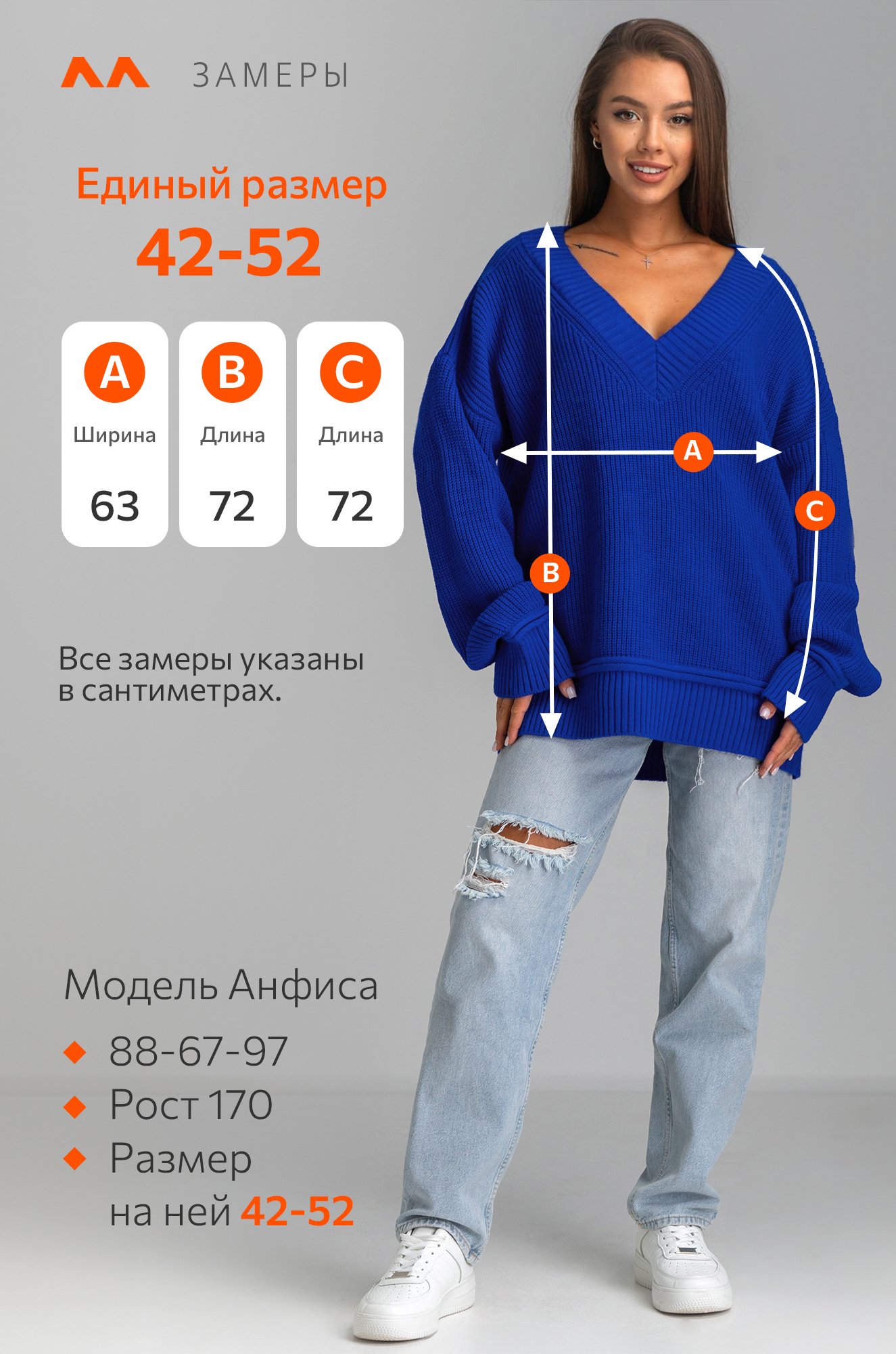 Модель Анфиса, рост 170 см, параметры 88-67-97 см. На ней единый размер 42-52.