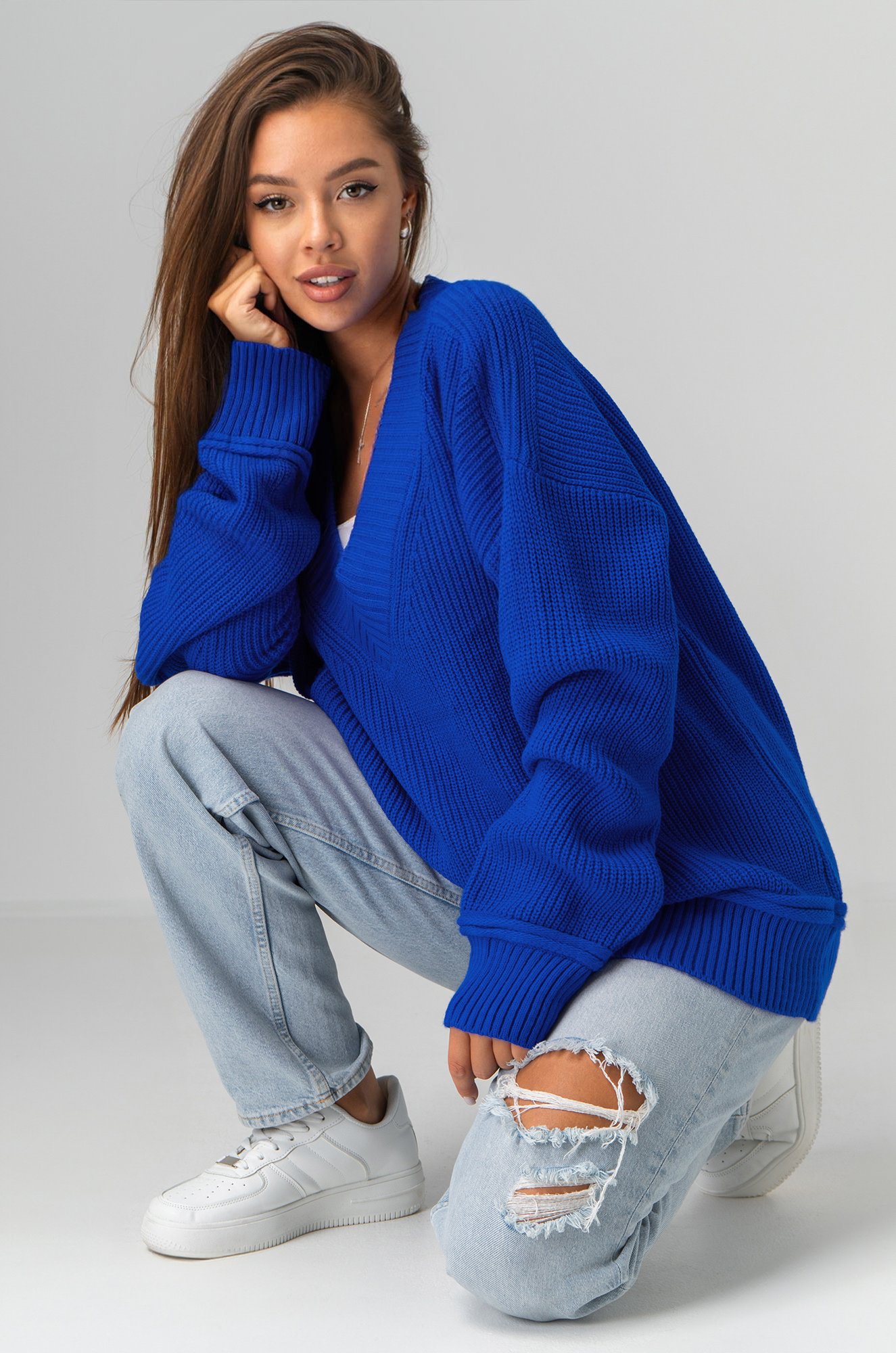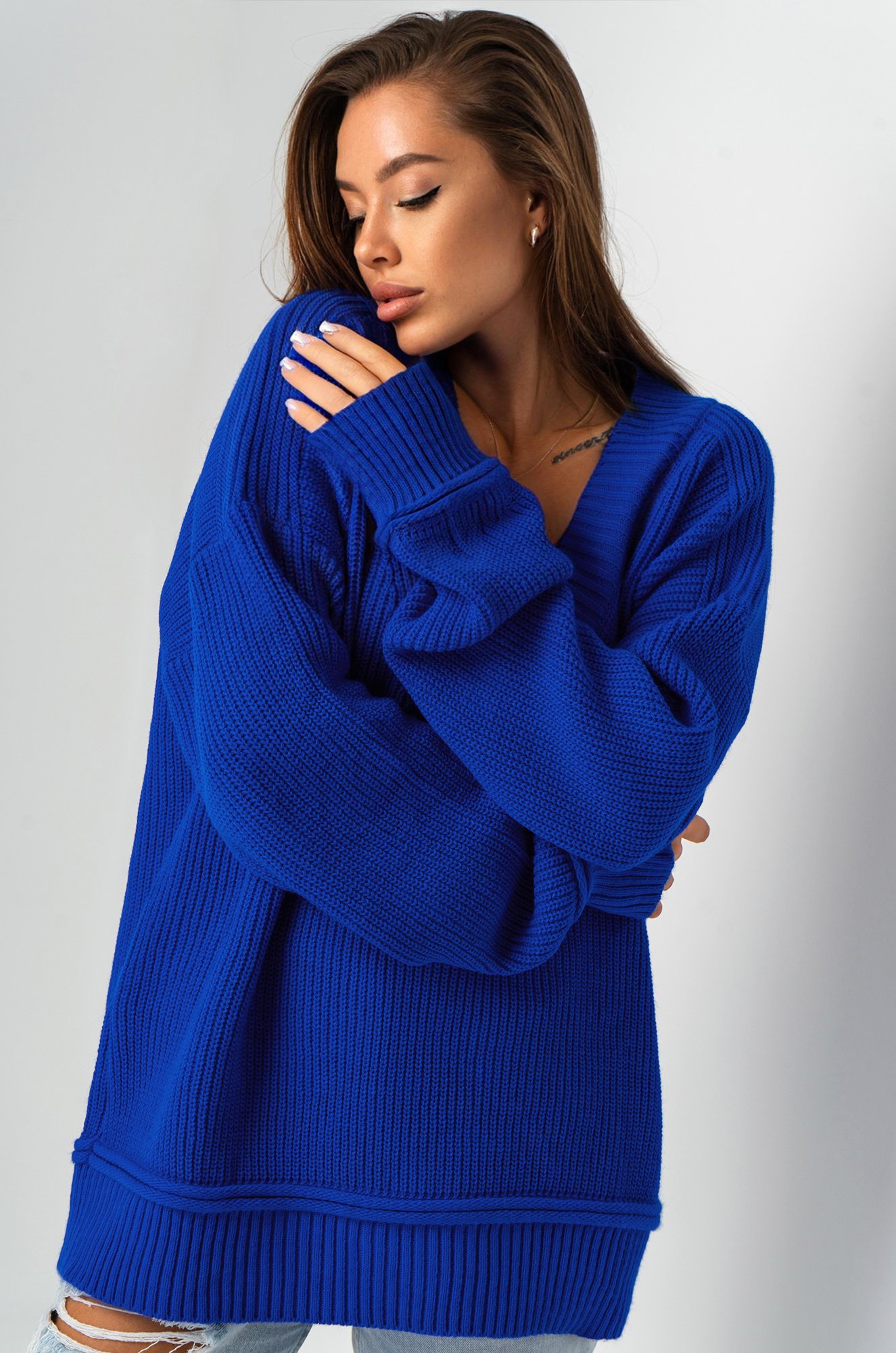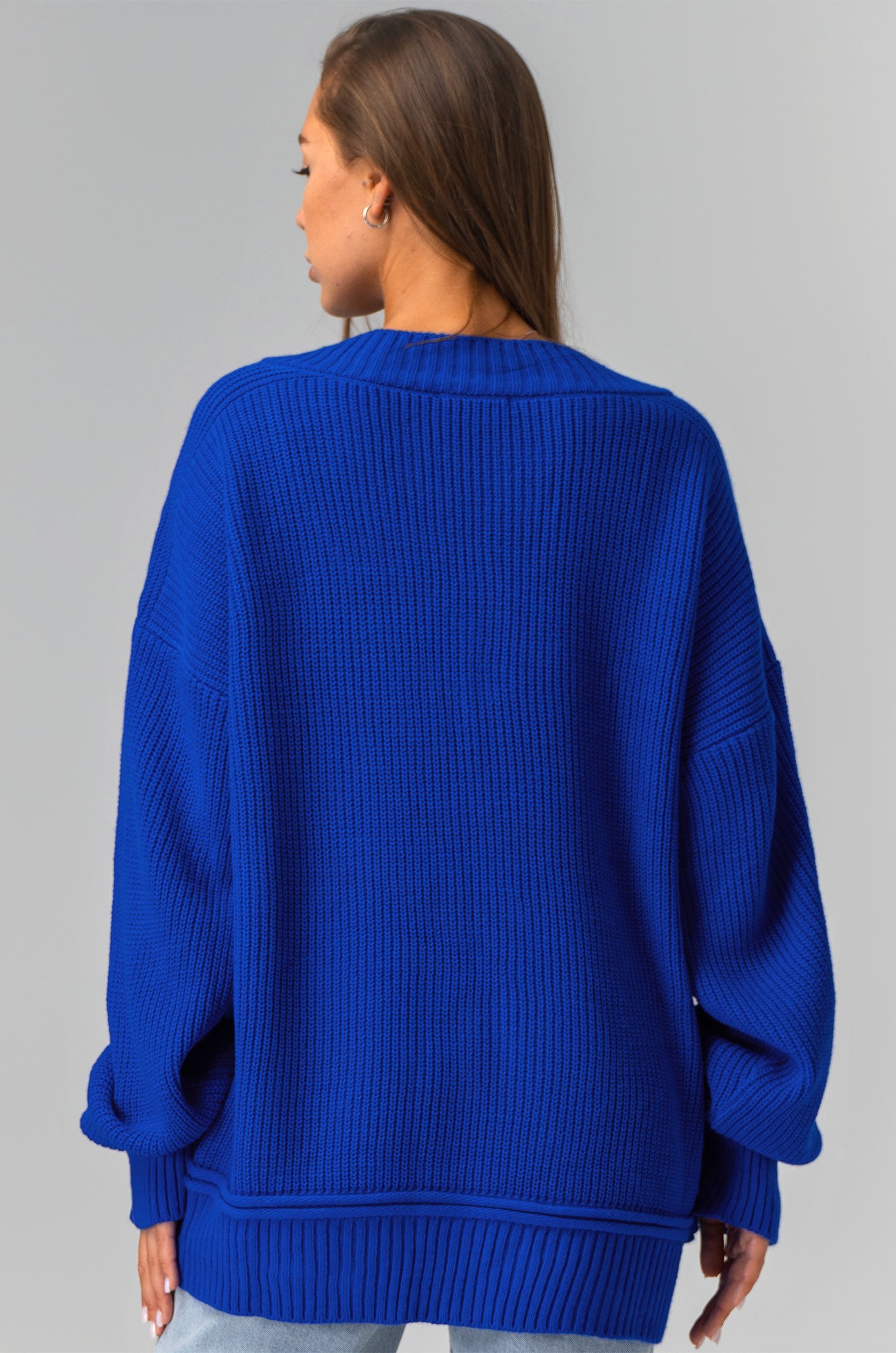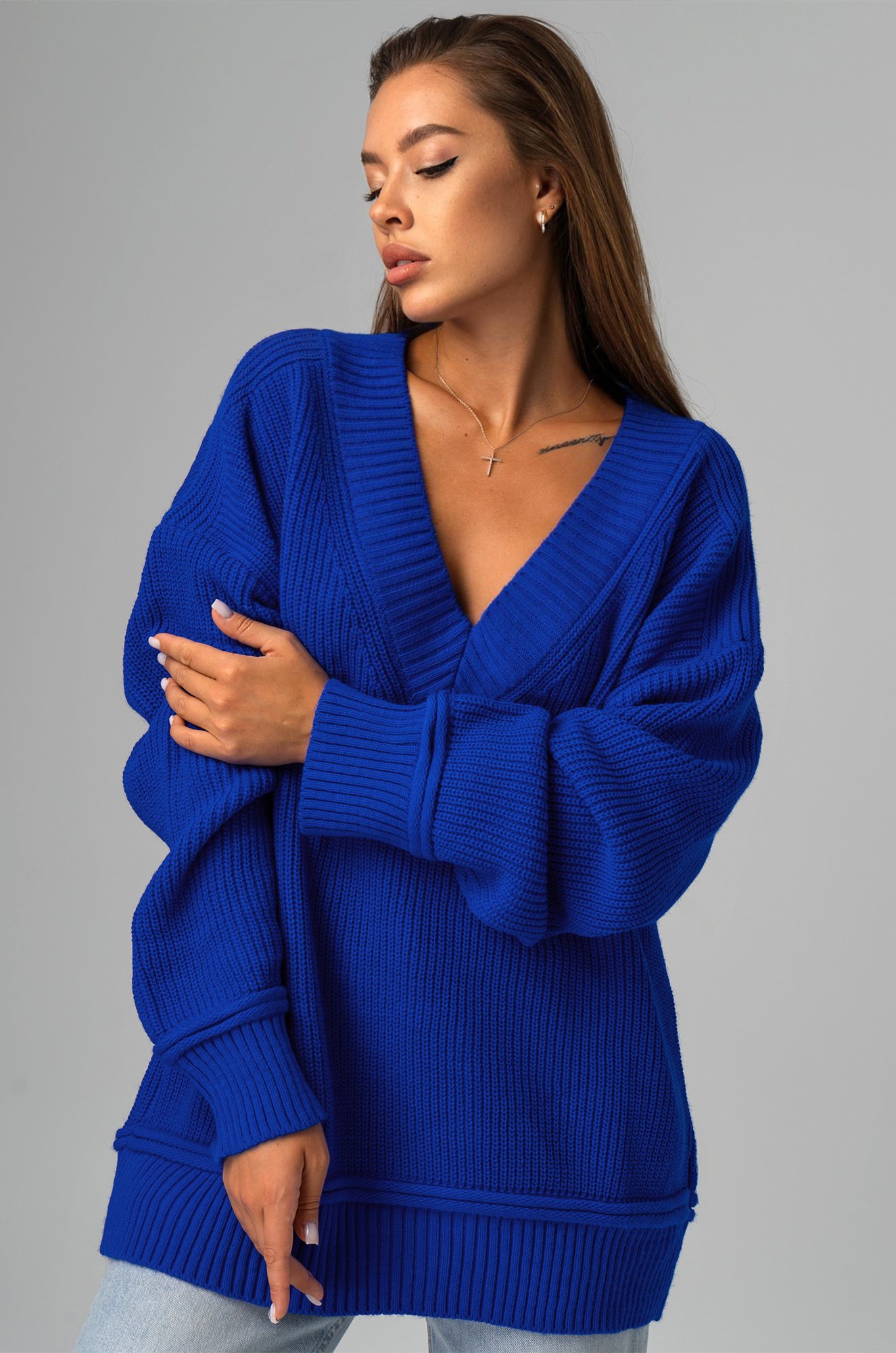 Женский джемпер в синем цвете станет идеальным выбором для создания классного образа. Оверсайз фасон и V-образный вырез добавят легкости и элегантности, а длинный рукав гарантирует комфорт в прохладную погоду.
