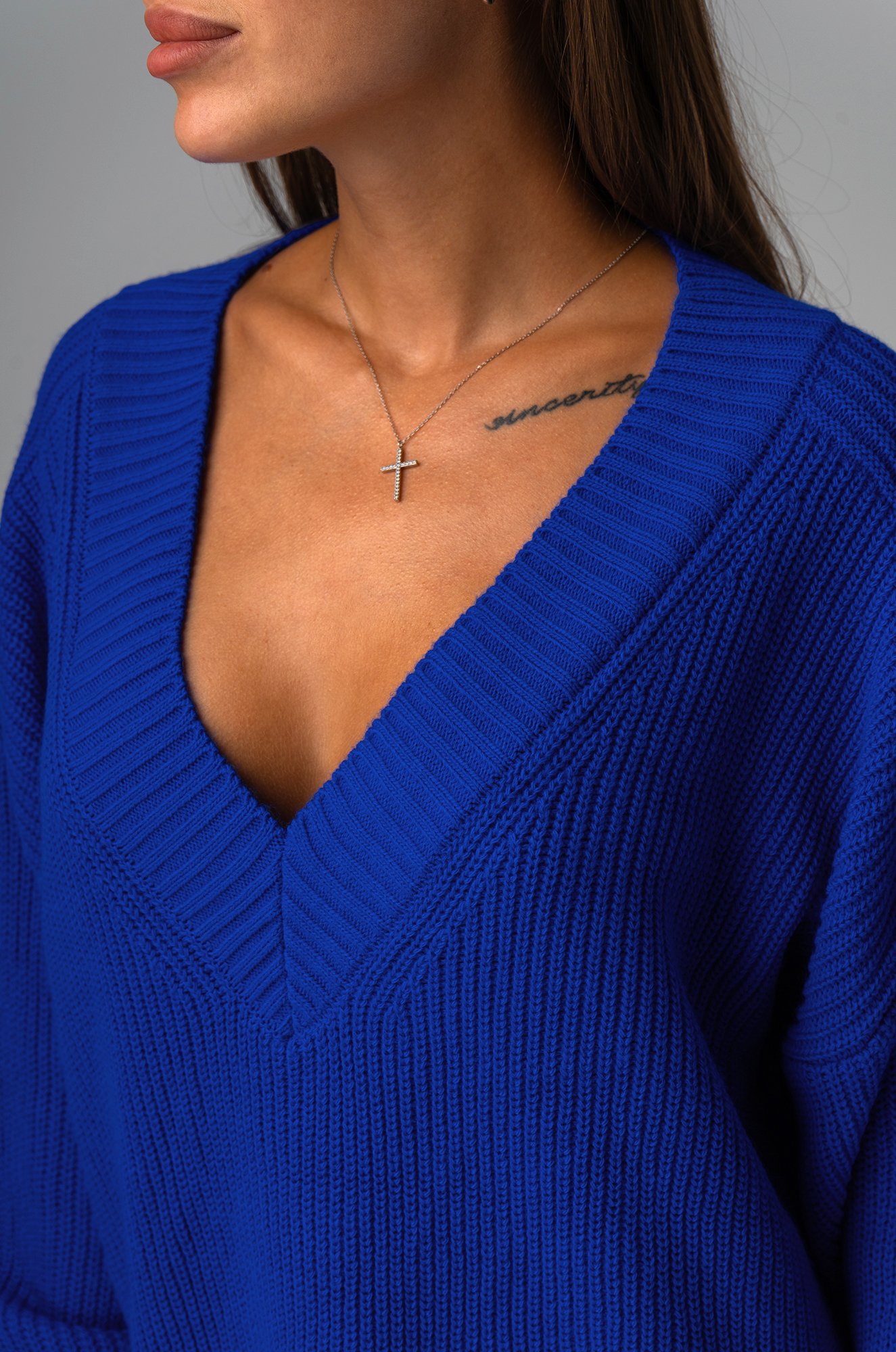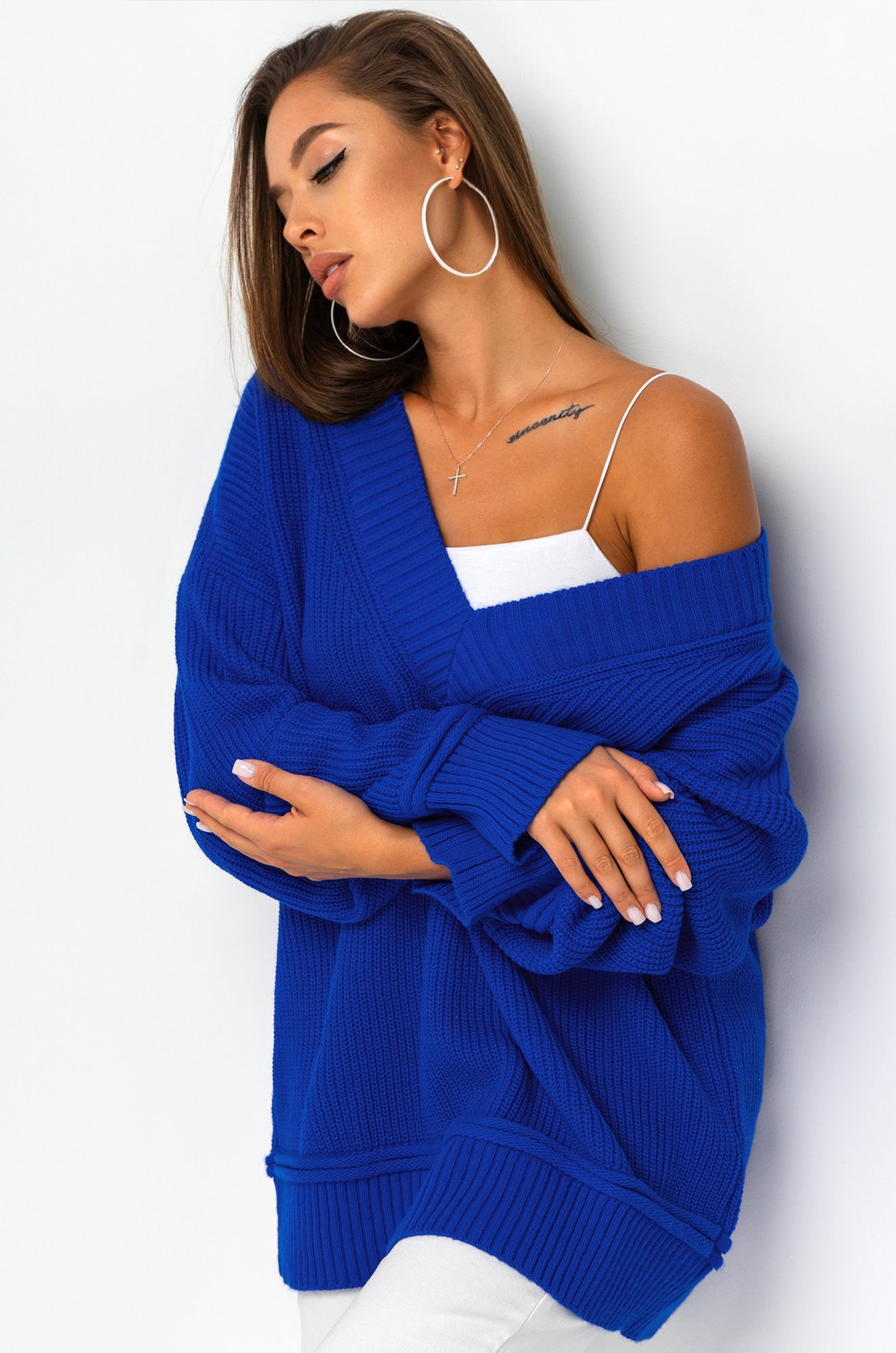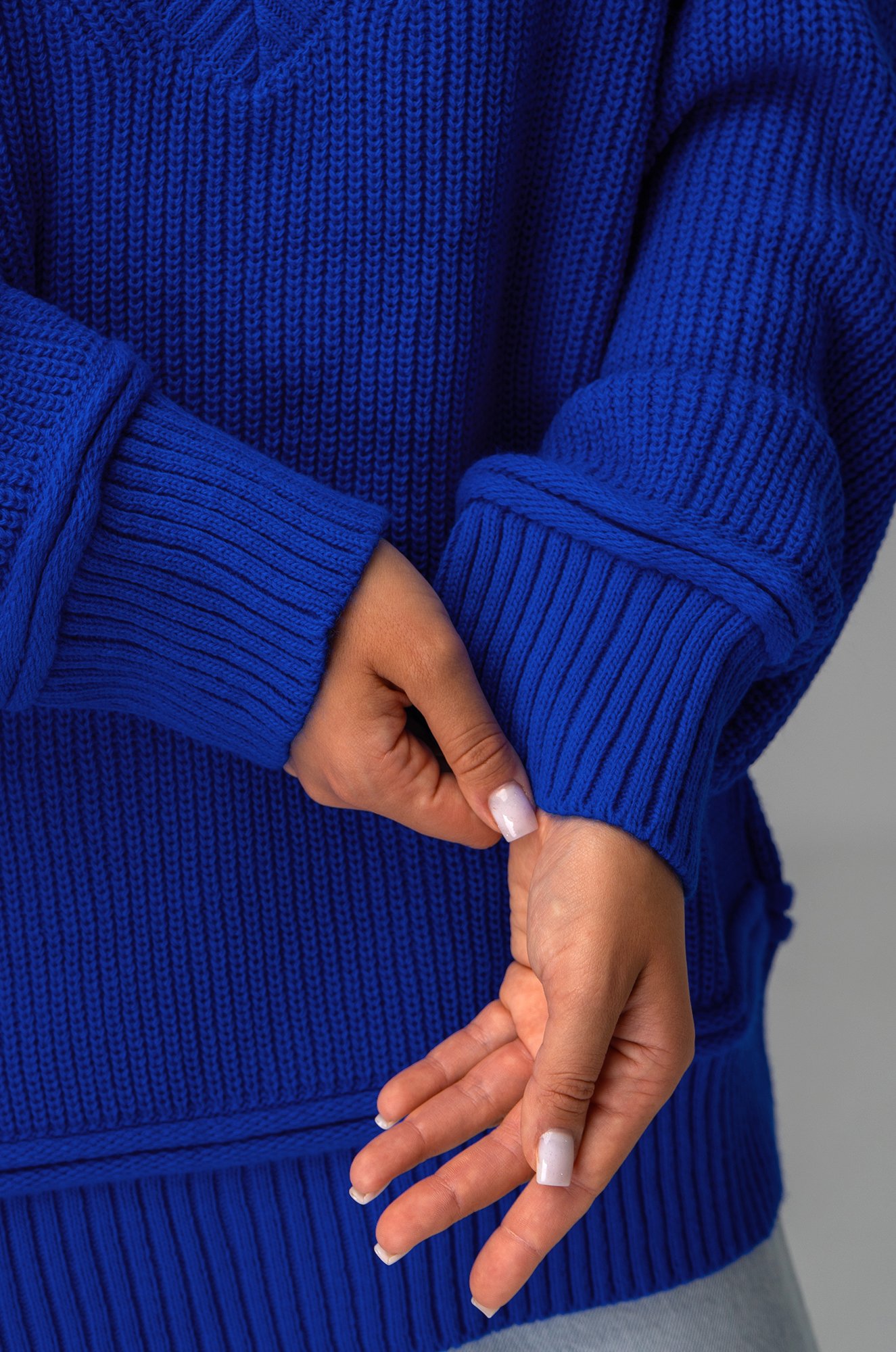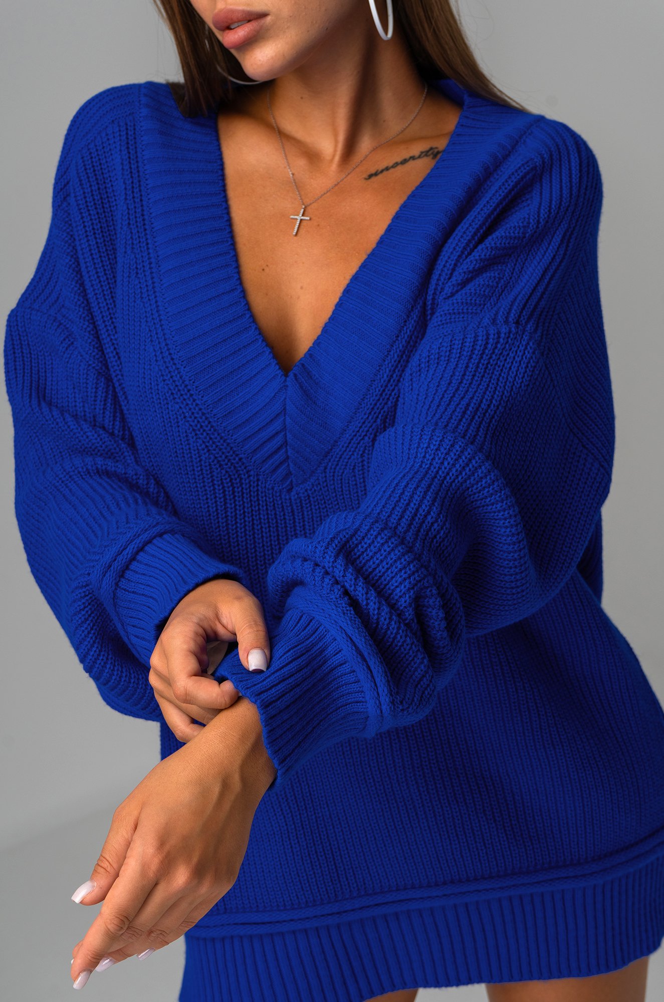 Женский джемпер в синем цвете станет идеальным выбором для создания классного образа. Оверсайз фасон и V-образный вырез добавят легкости и элегантности, а длинный рукав гарантирует комфорт в прохладную погоду.