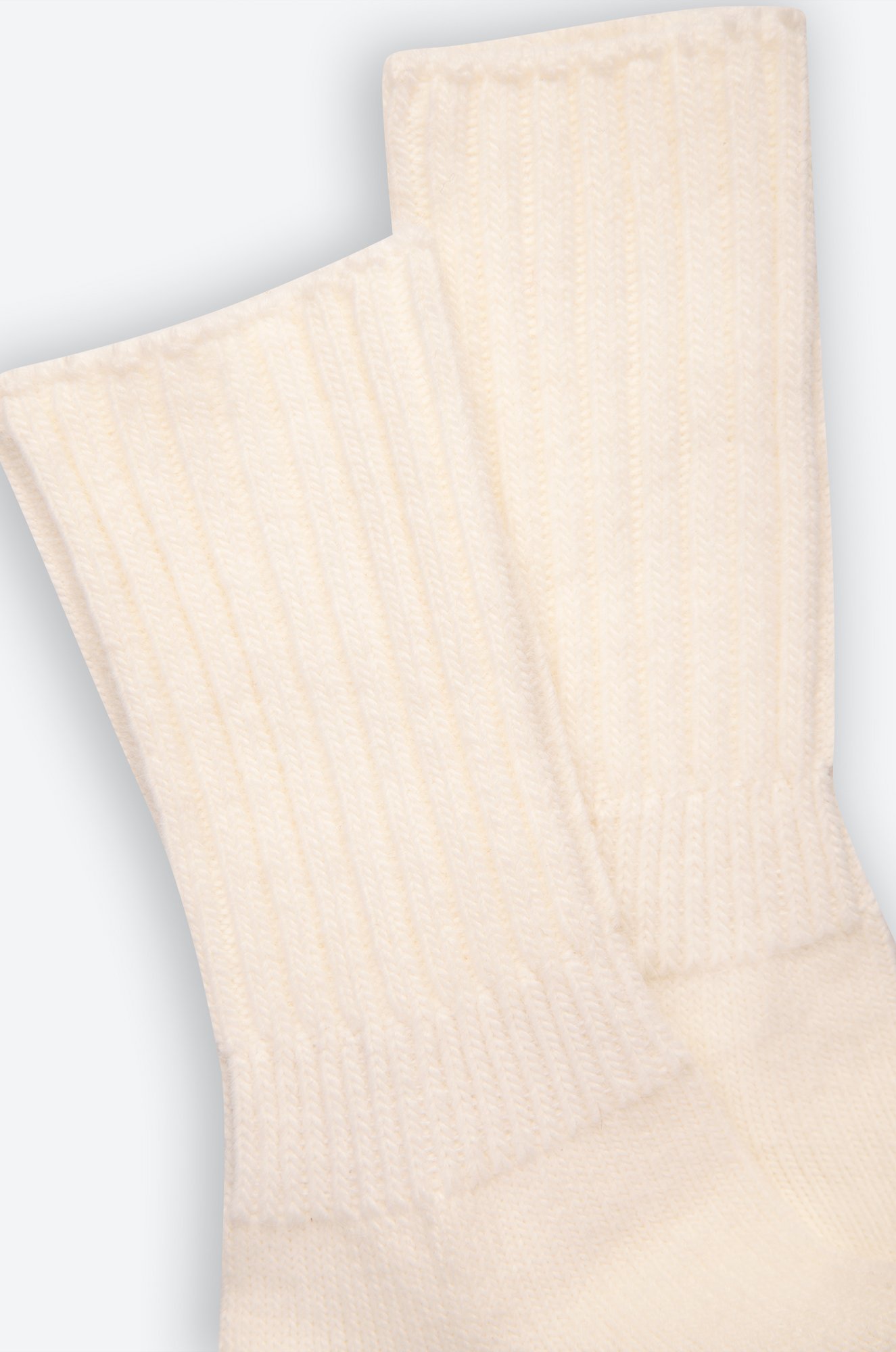 Теплые женские носки выполнены из приятной к телу пряжи с добавлением натуральной шерсти. Однотонные высокие носки белого цвета идеальны для уютных осенних вечеров в компании пледа и какао.