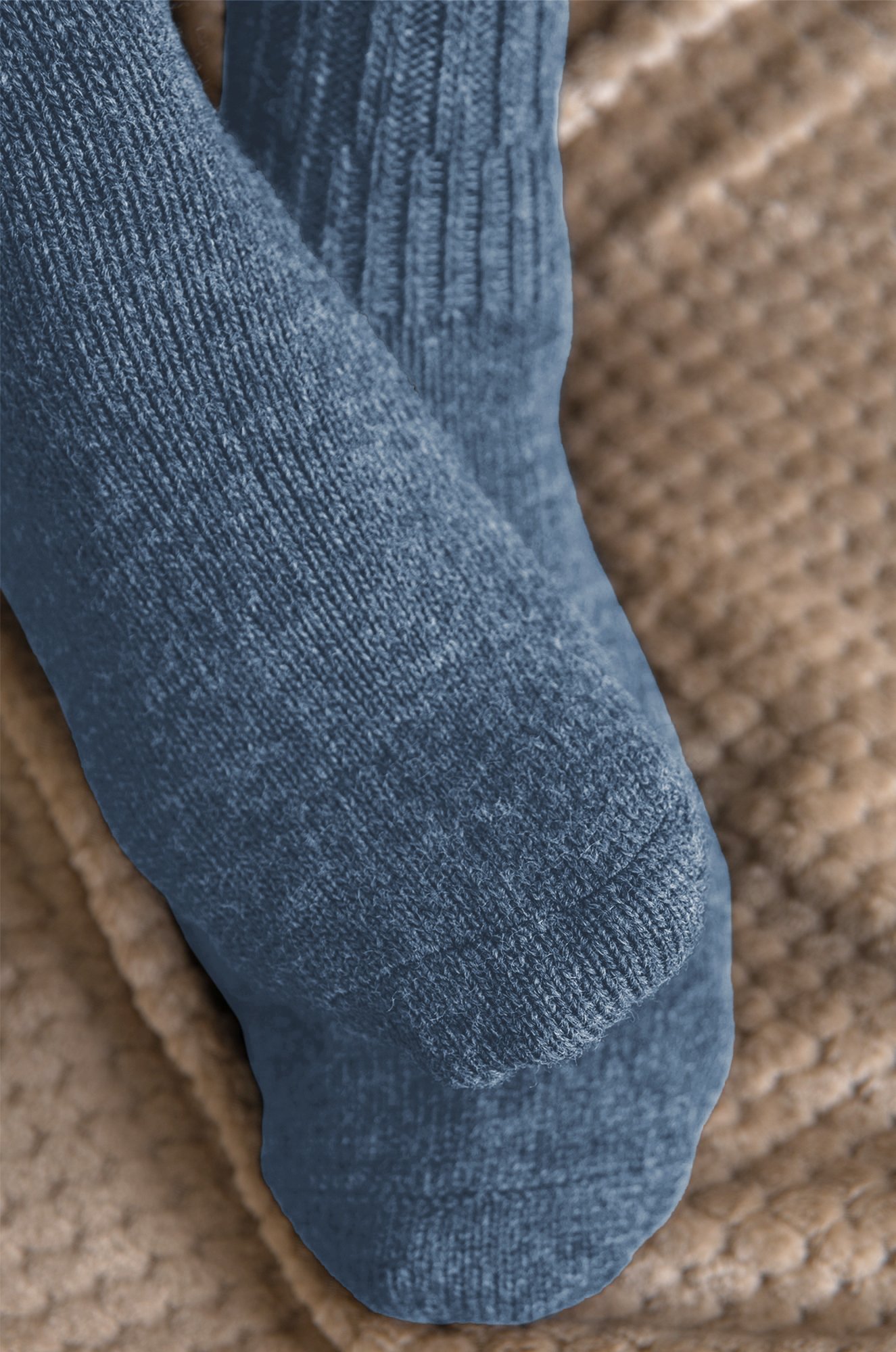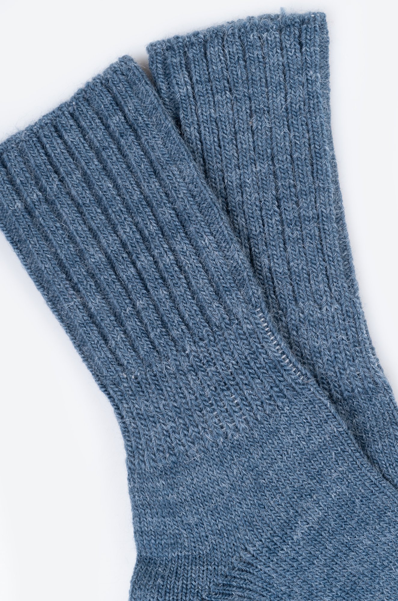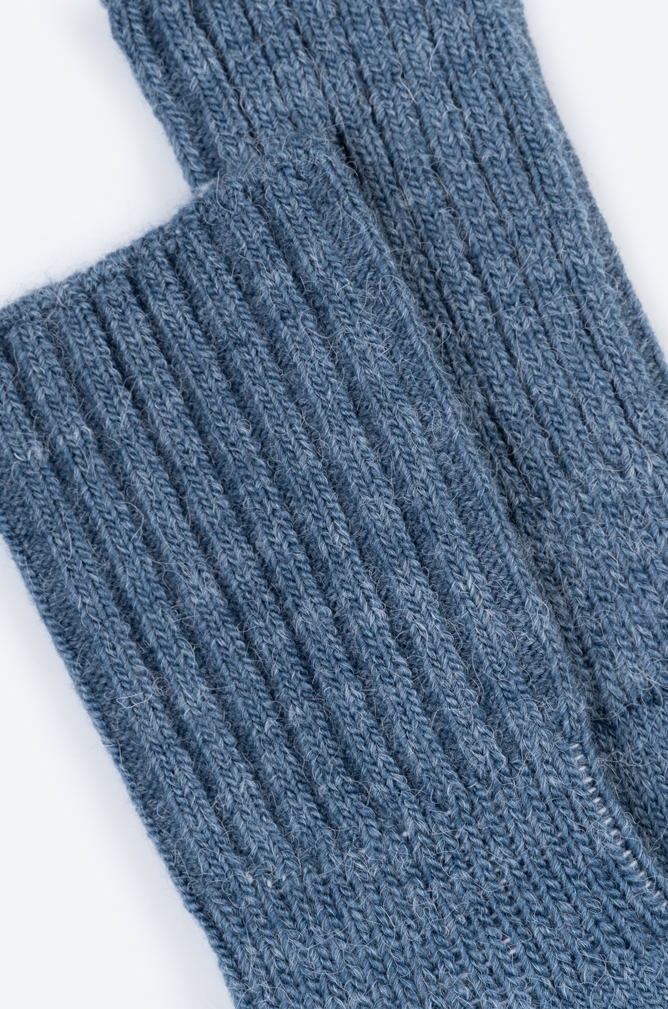 Теплые женские носки выполнены из приятной к телу пряжи с добавлением натуральной шерсти. Однотонные высокие носки синего цвета идеальны для уютных осенних вечеров в компании пледа и какао.