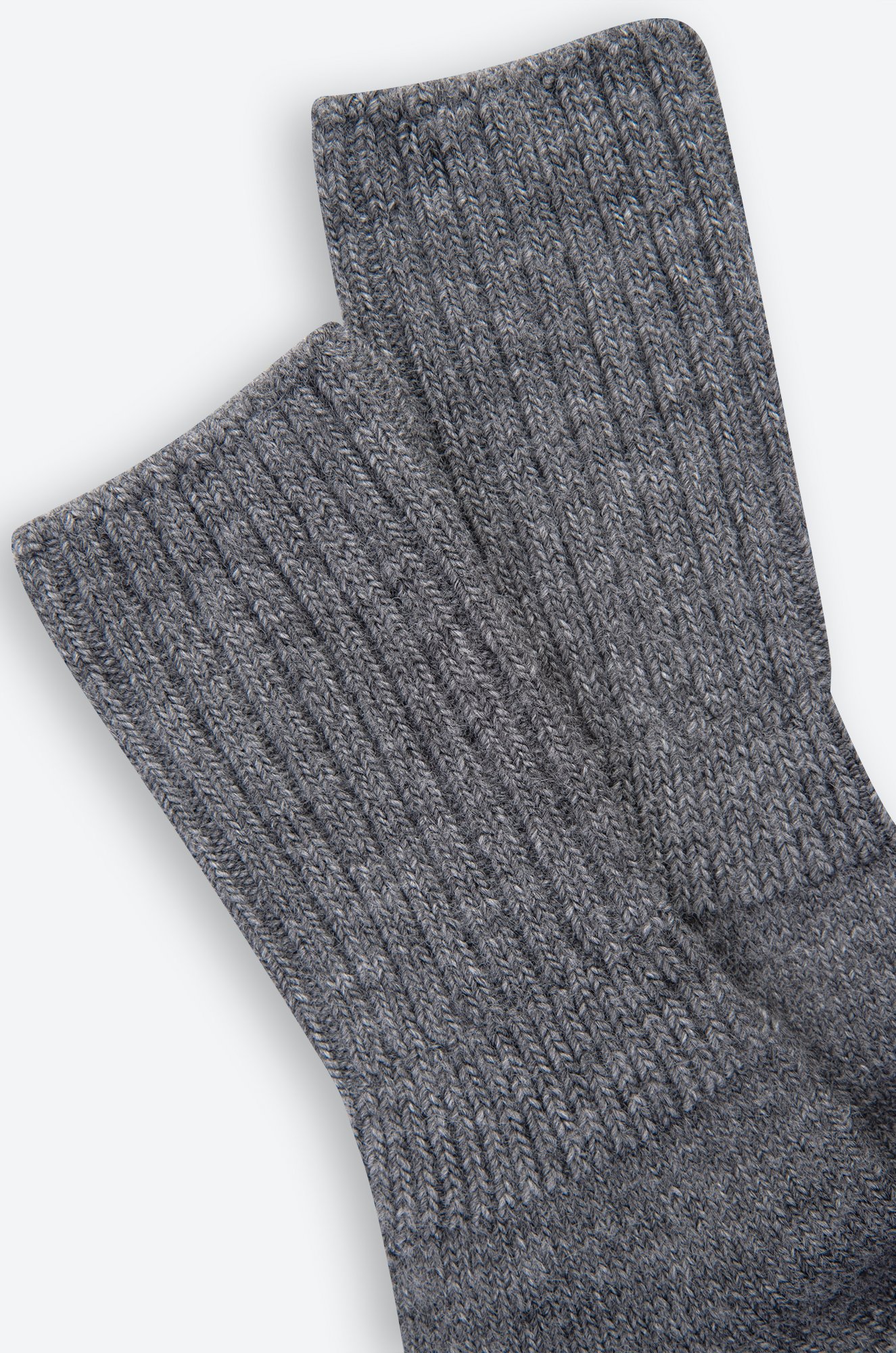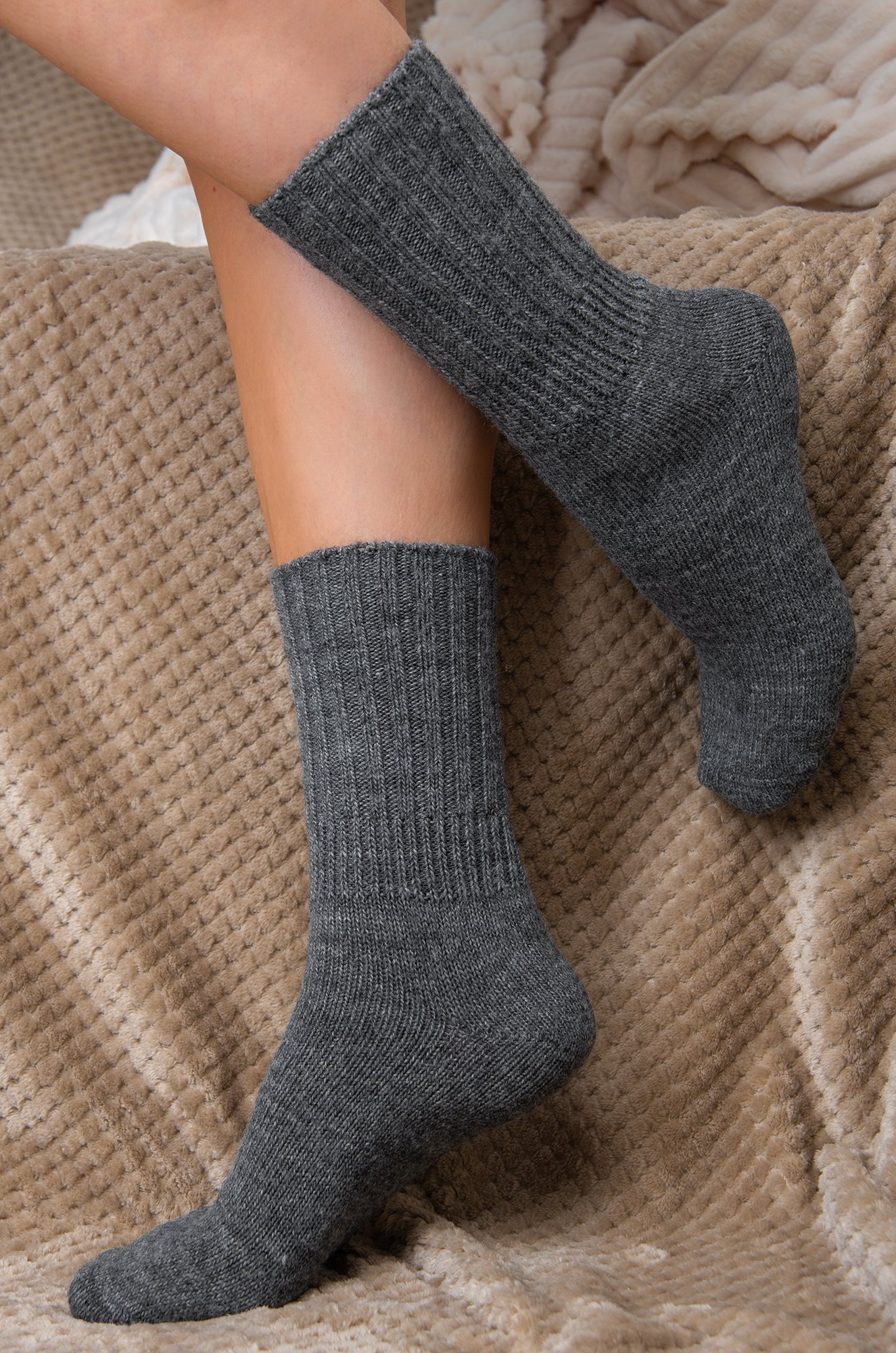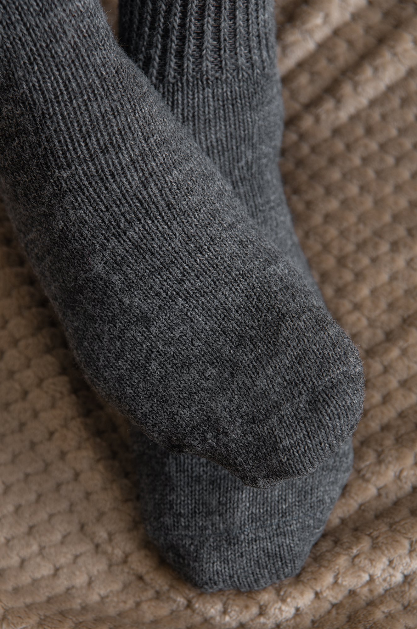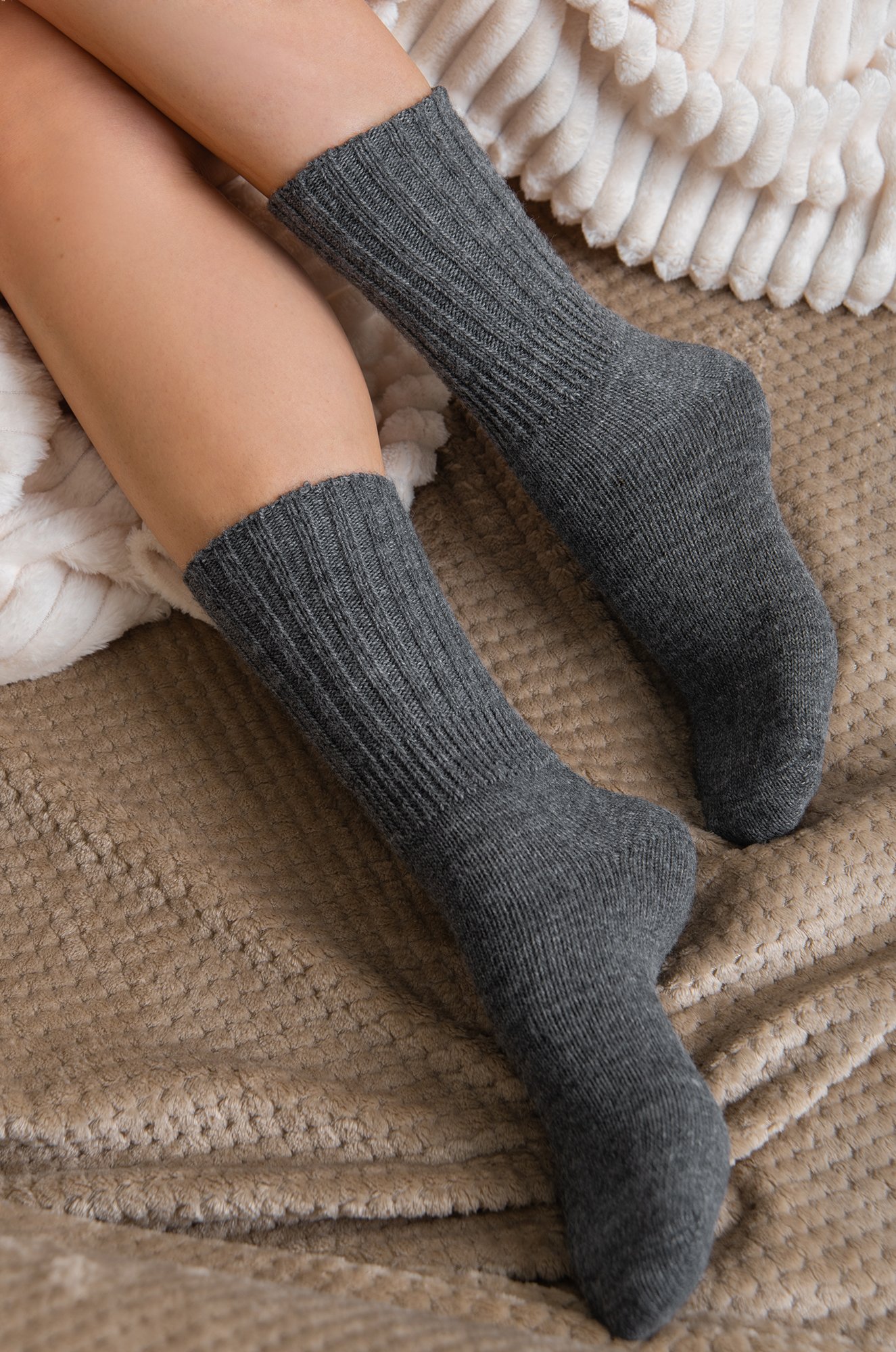 Теплые женские носки выполнены из приятной к телу пряжи с добавлением натуральной шерсти. Однотонные высокие носки серого цвета идеальны для уютных осенних вечеров в компании пледа и какао.
