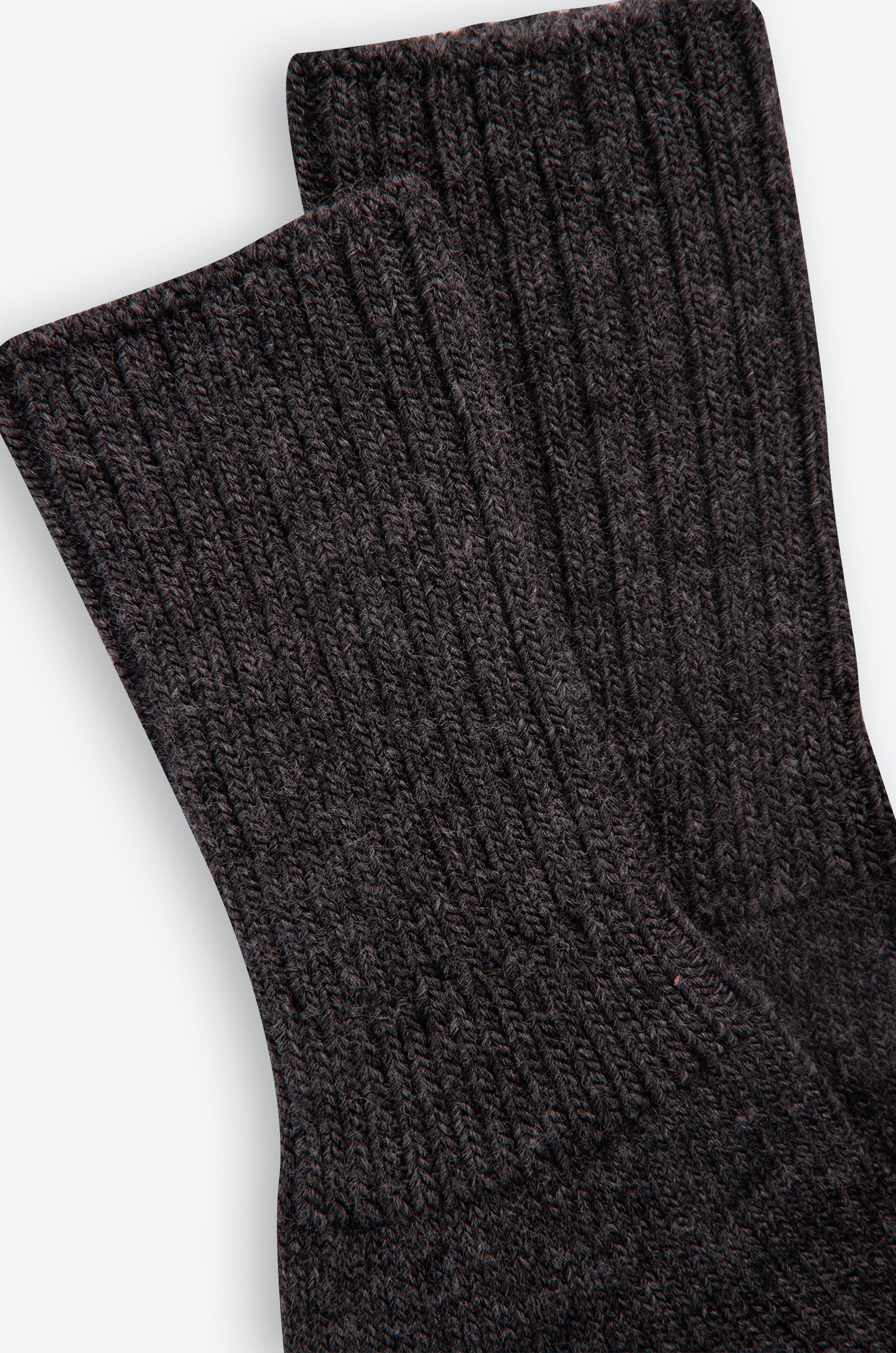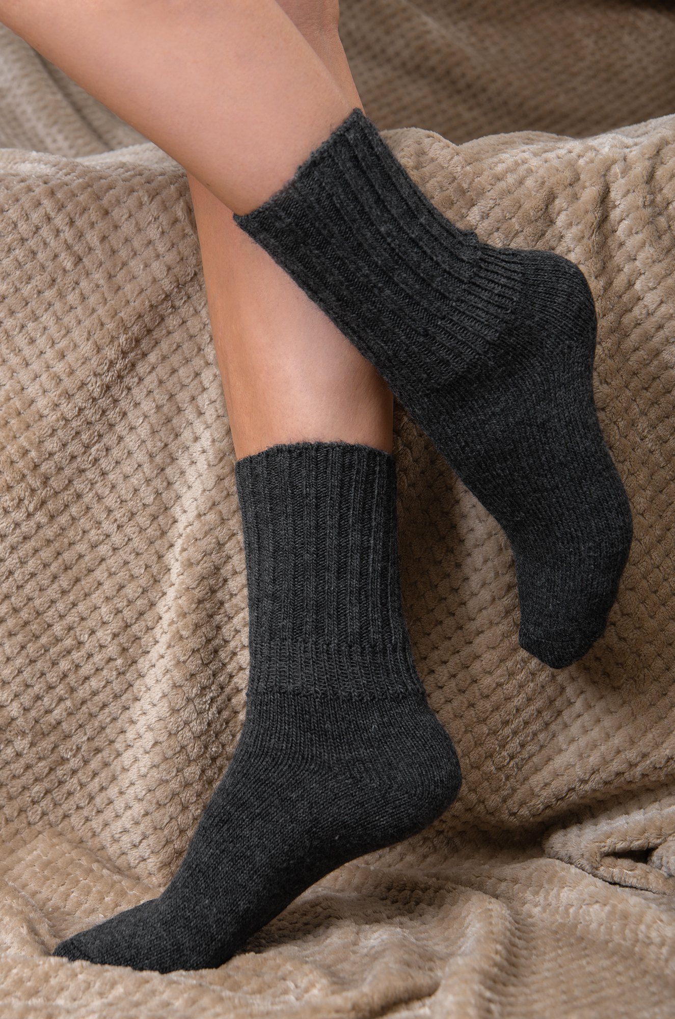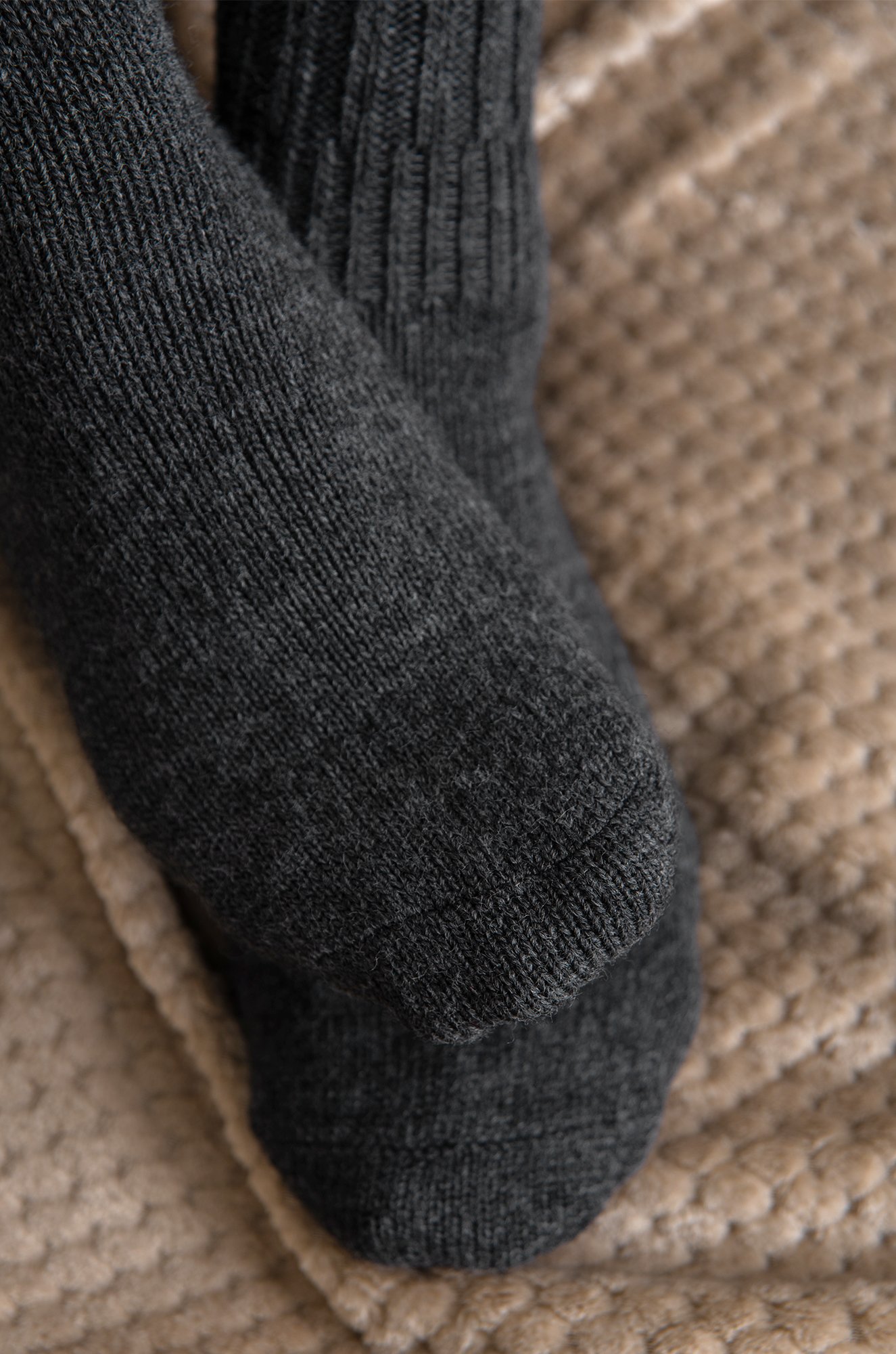 Теплые женские носки выполнены из приятной к телу пряжи с добавлением натуральной шерсти. Однотонные высокие носки темно-серого цвета идеальны для уютных осенних вечеров в компании пледа и какао.