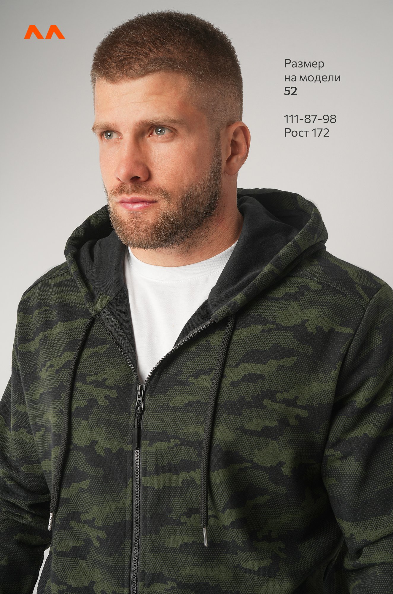 Мужской спортивный костюм выполнен из 100% хлопка, плотного футера трехнитки. Демисезонный камуфляжный костюм состоит из толстовки с капюшоном и брюк джоггеров. Мастерка с застежкой на молнию и карманами, капюшон регулируется по объему. Штаны дополнены карманами, пояс утягивается шнуром, по низу расположены эластичные манжеты.