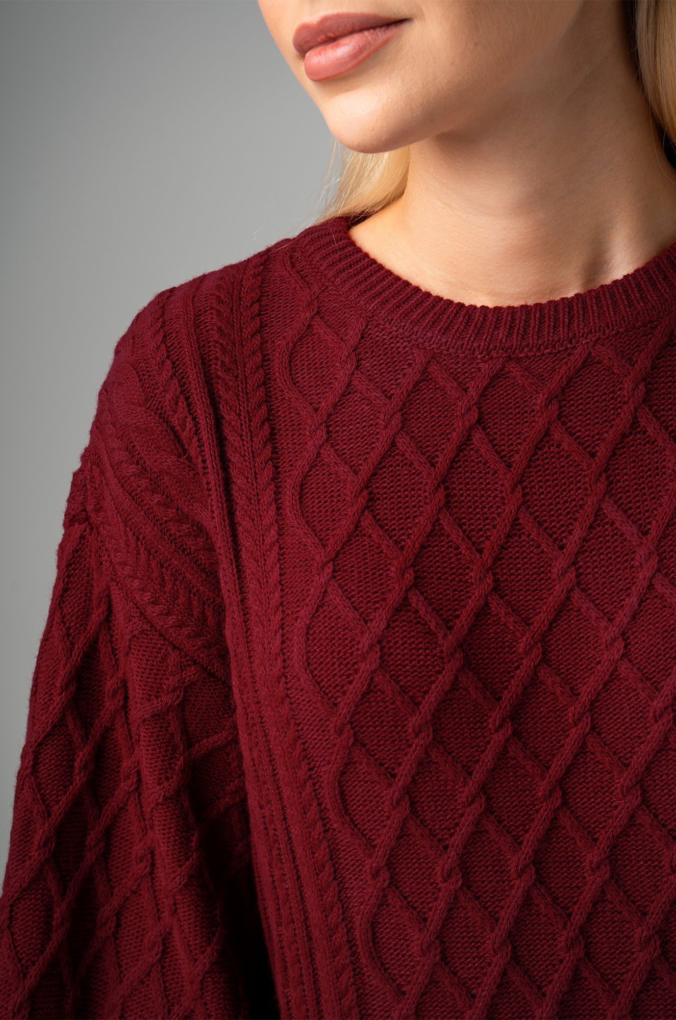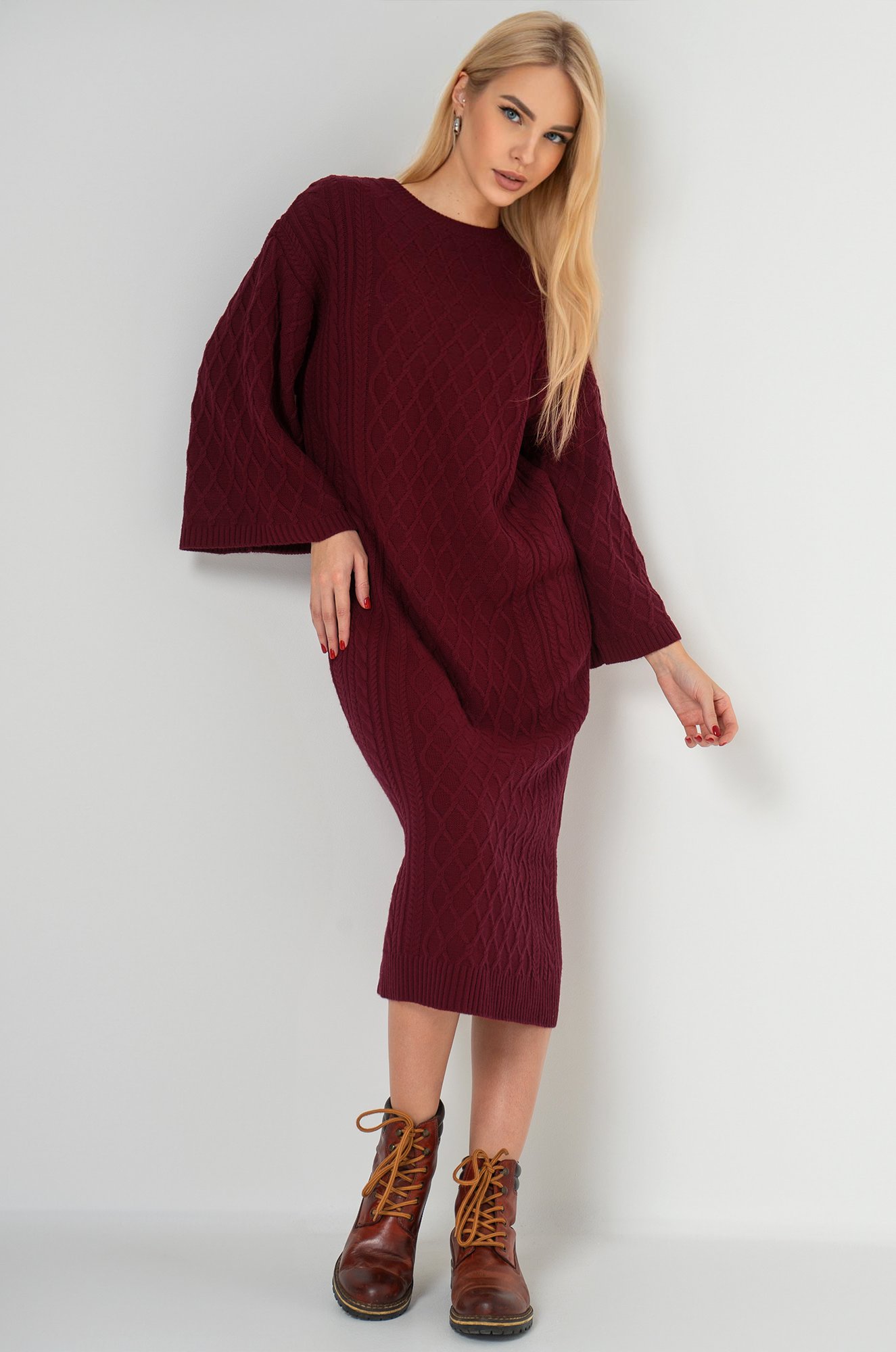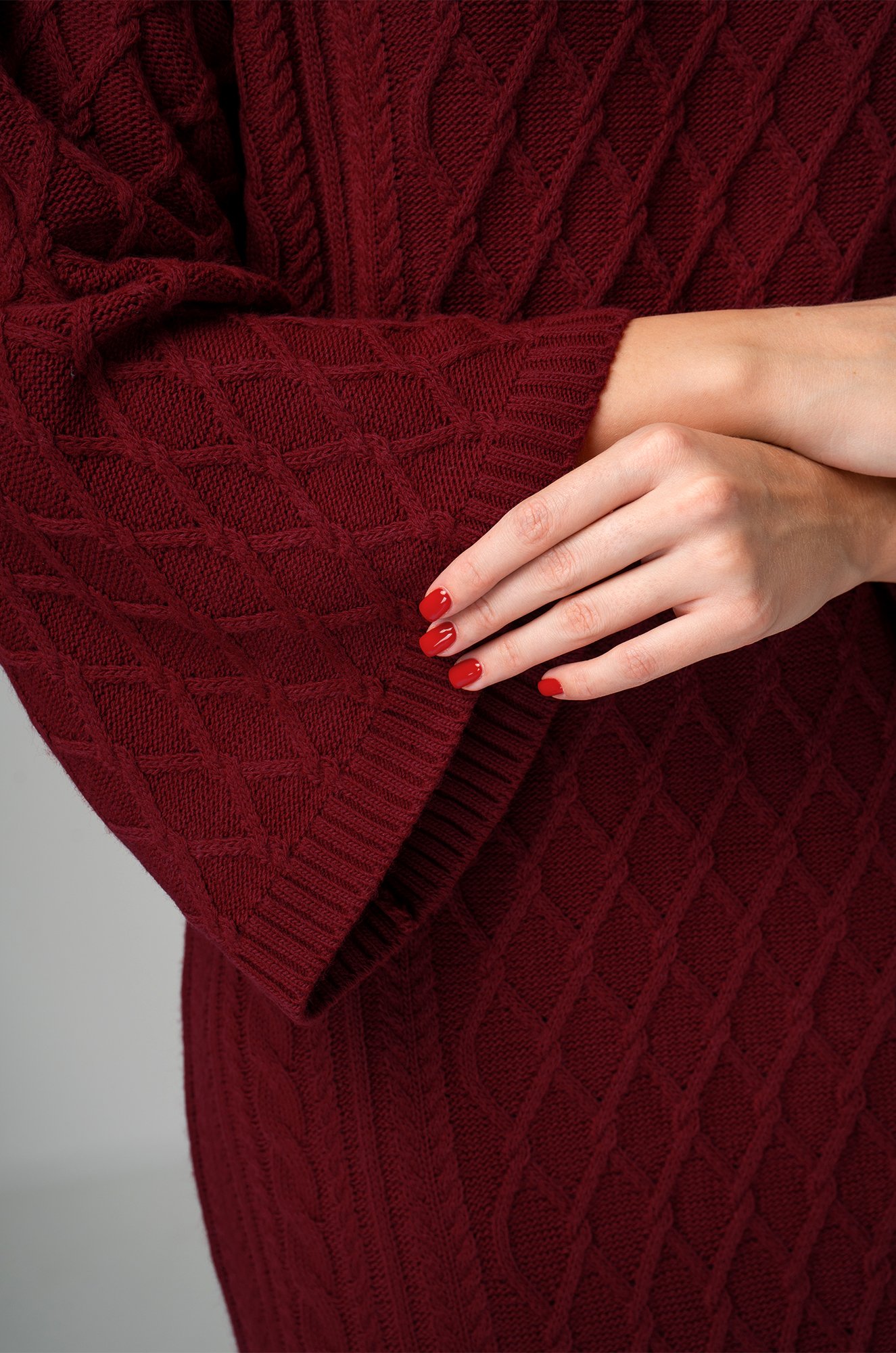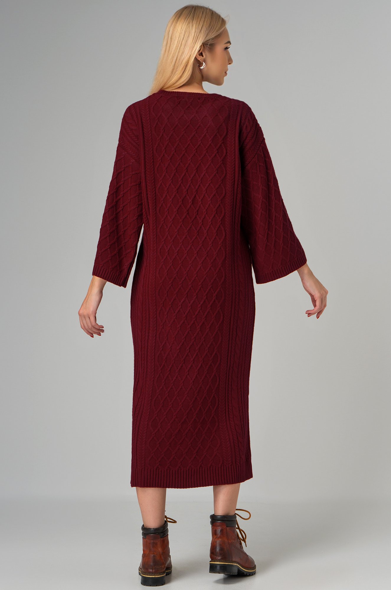 Выполненное из вязаного трикотажа длинное платье цвета бордо отличается мягкостью и нежностью. Плотный трикотаж с оригинальной вязкой ромбы и косички сохраняет тепло, делая платье идеальным для осени, зимы и весны.