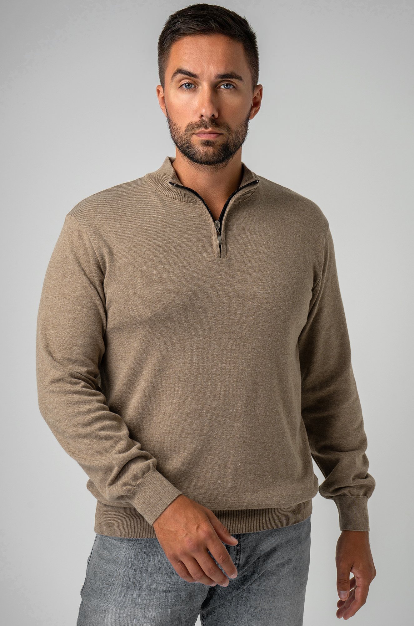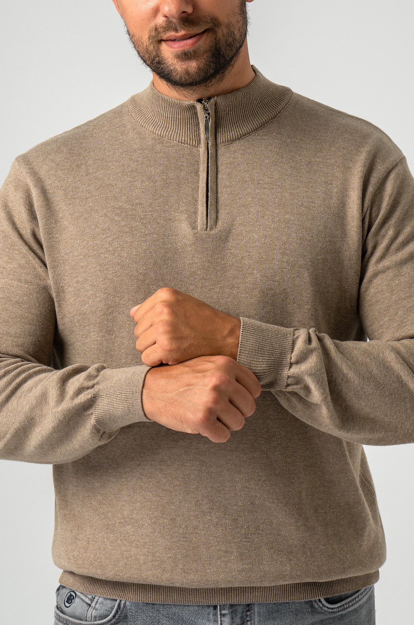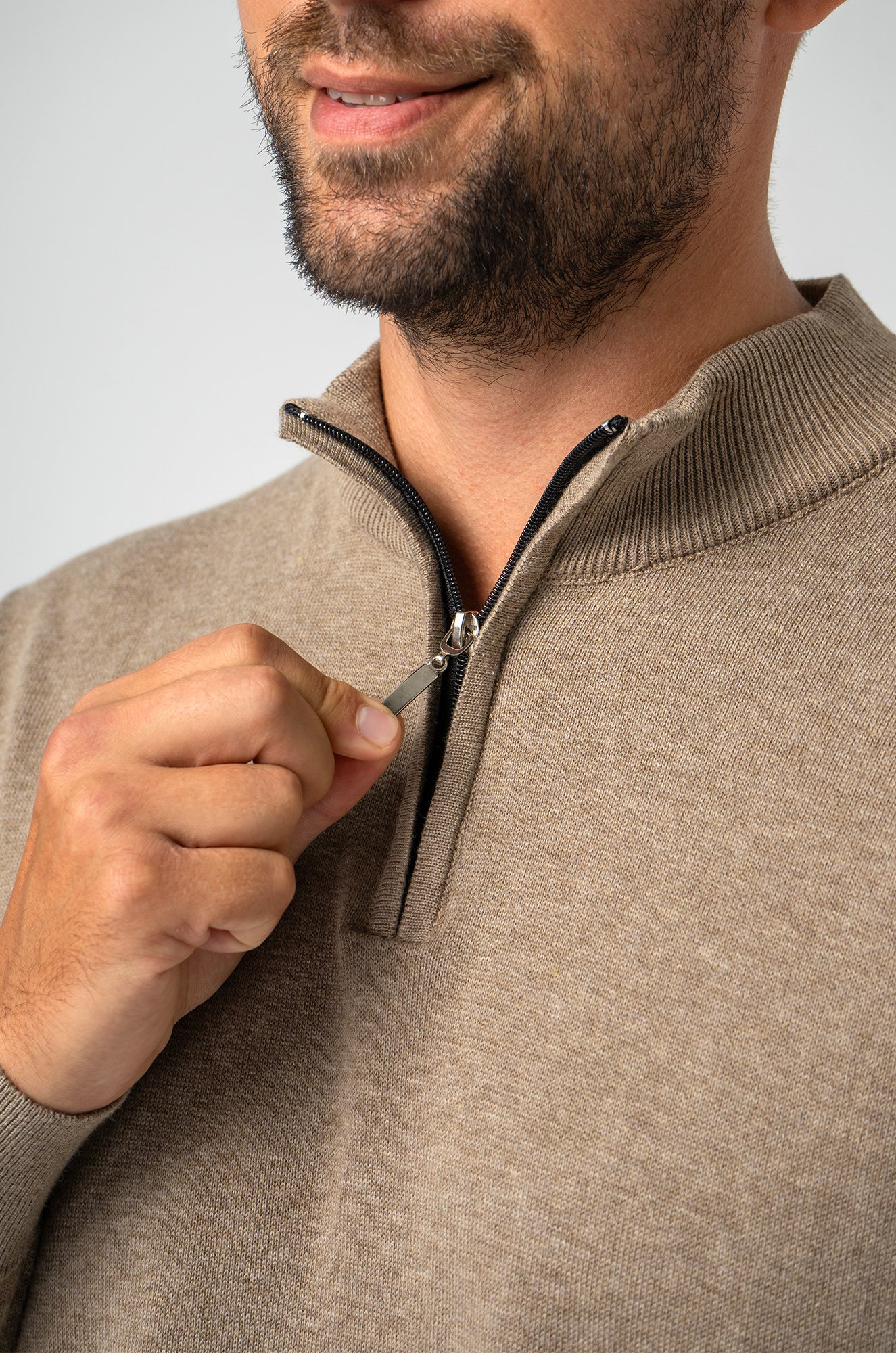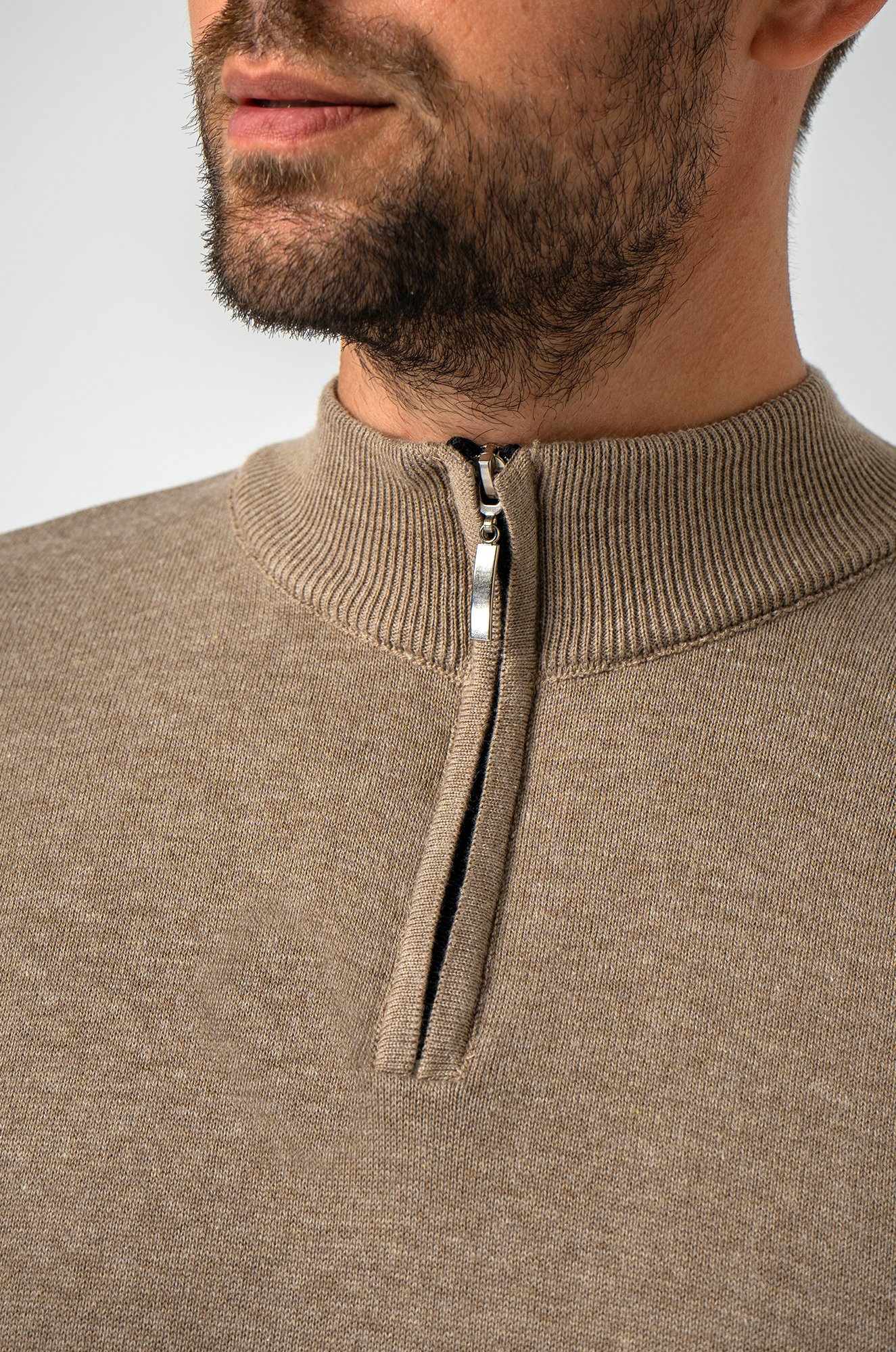 Бежевый мужской джемпер станет незаменимой частью вашего гардероба на осень и весну. Демисезонный свитер создан для мужчин, которые ценят качество и универсальность. Прямой крой, ворот стойка с застежкой на молнию добавляют классический штрих, делая его подходящим как для повседневных, так и для более официальных образов.