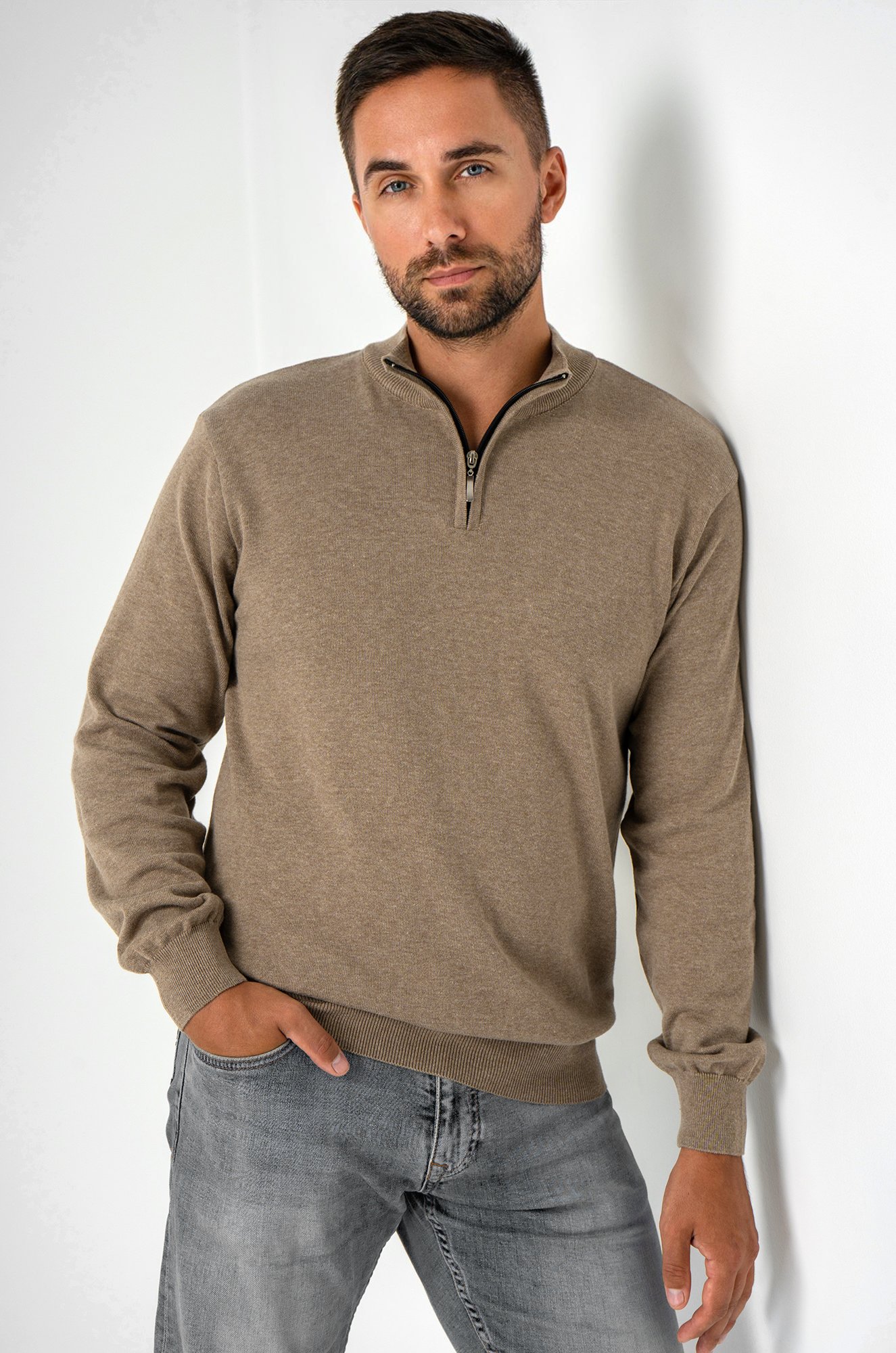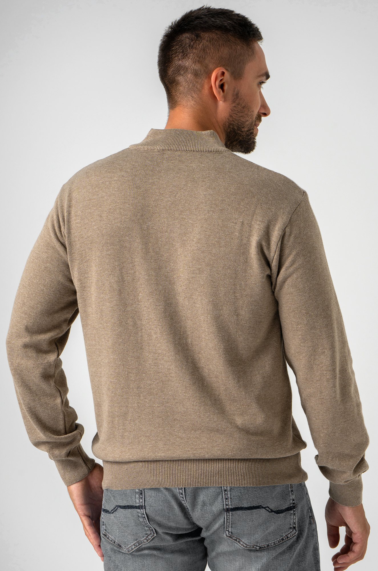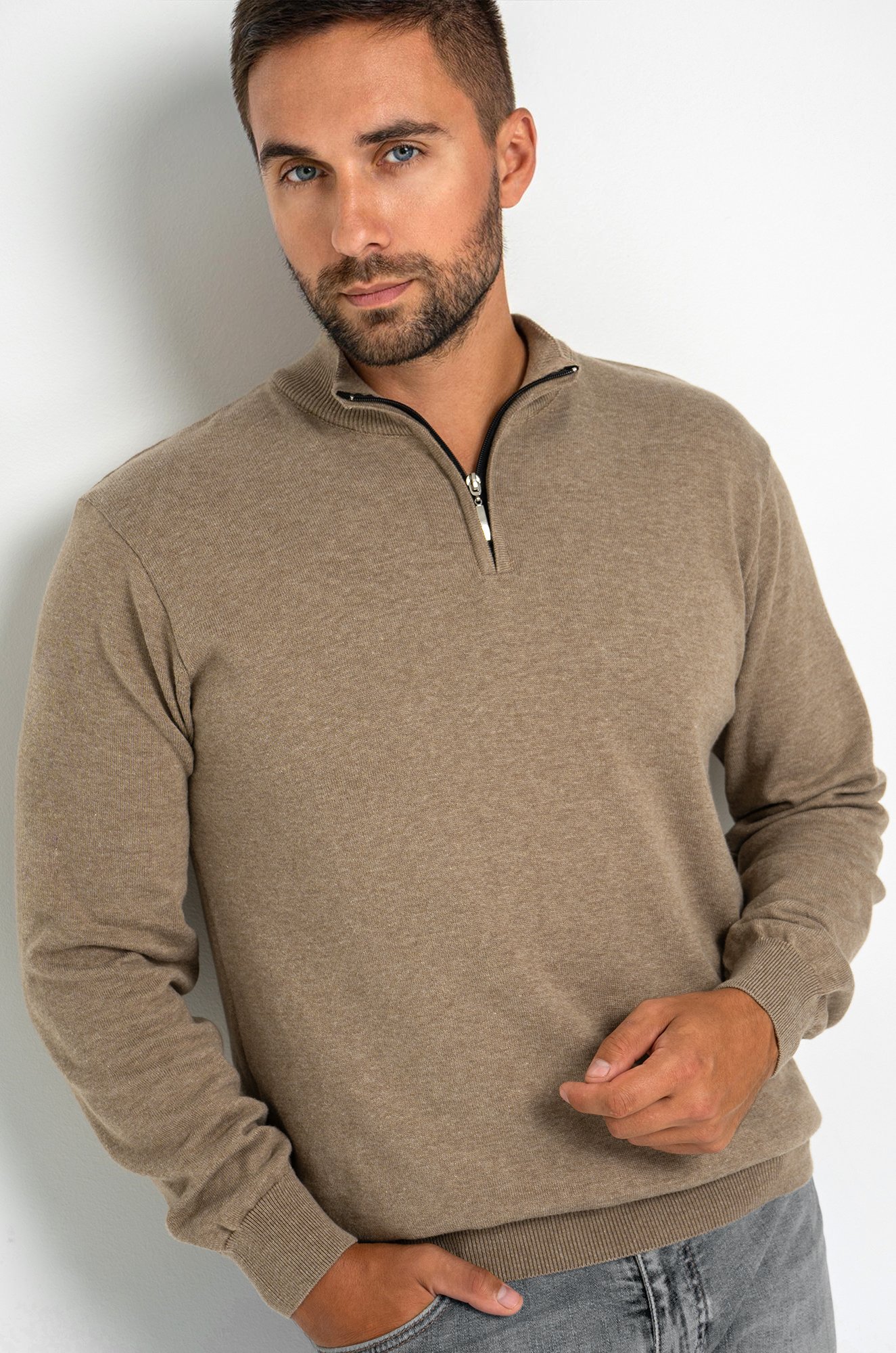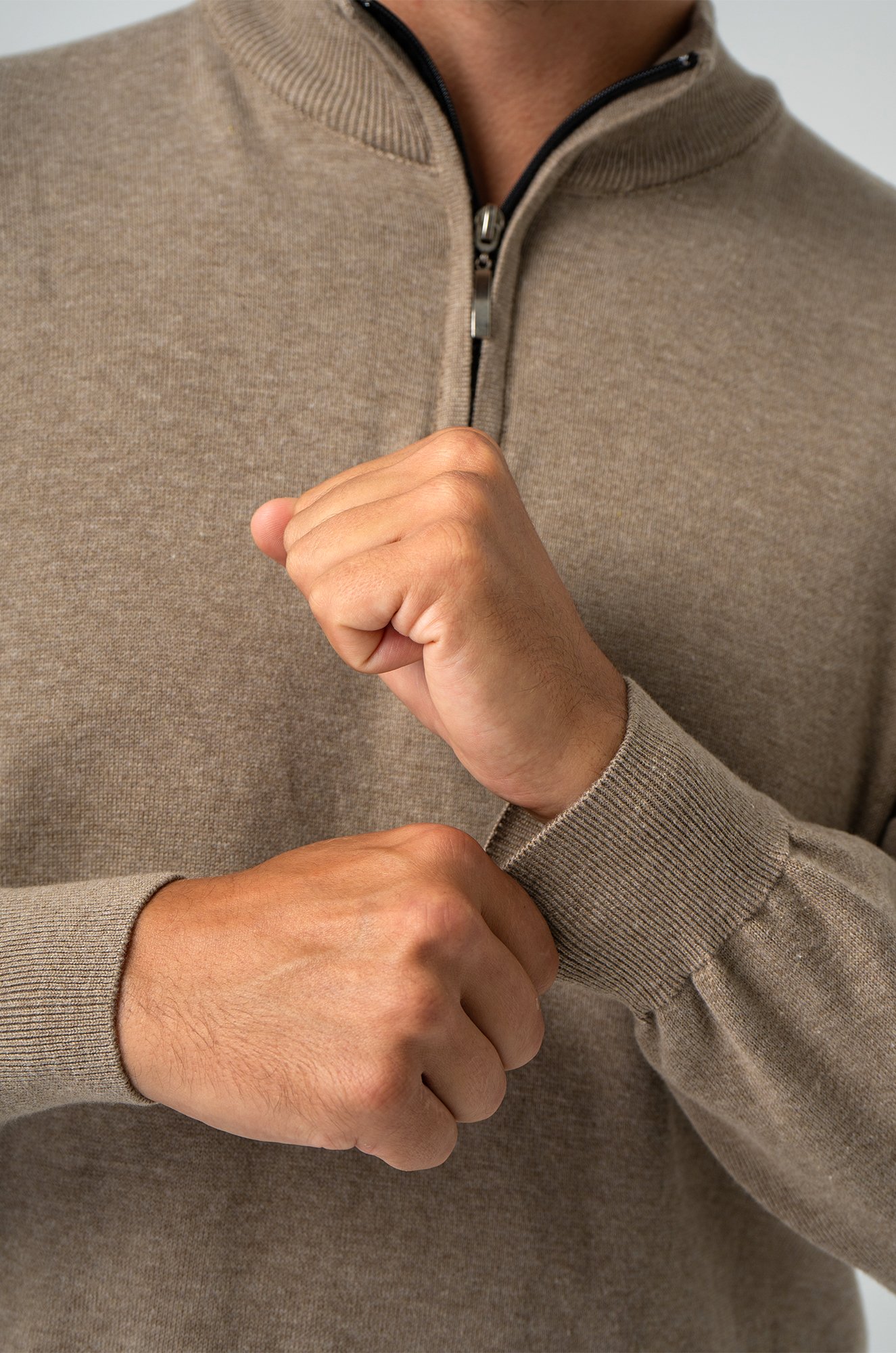 Бежевый мужской джемпер станет незаменимой частью вашего гардероба на осень и весну. Демисезонный свитер создан для мужчин, которые ценят качество и универсальность. Прямой крой, ворот стойка с застежкой на молнию добавляют классический штрих, делая его подходящим как для повседневных, так и для более официальных образов.