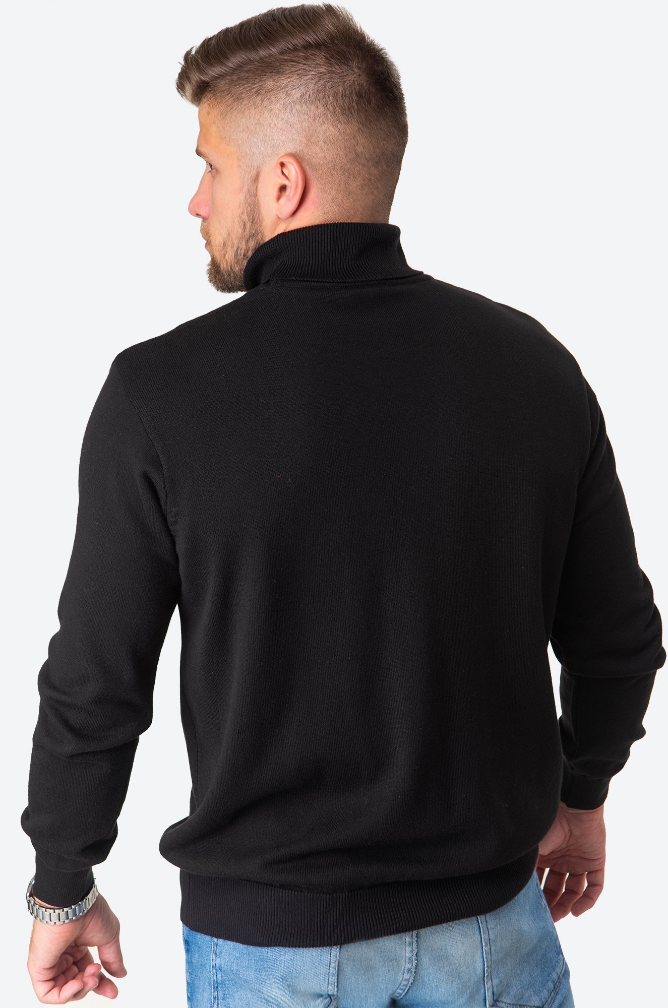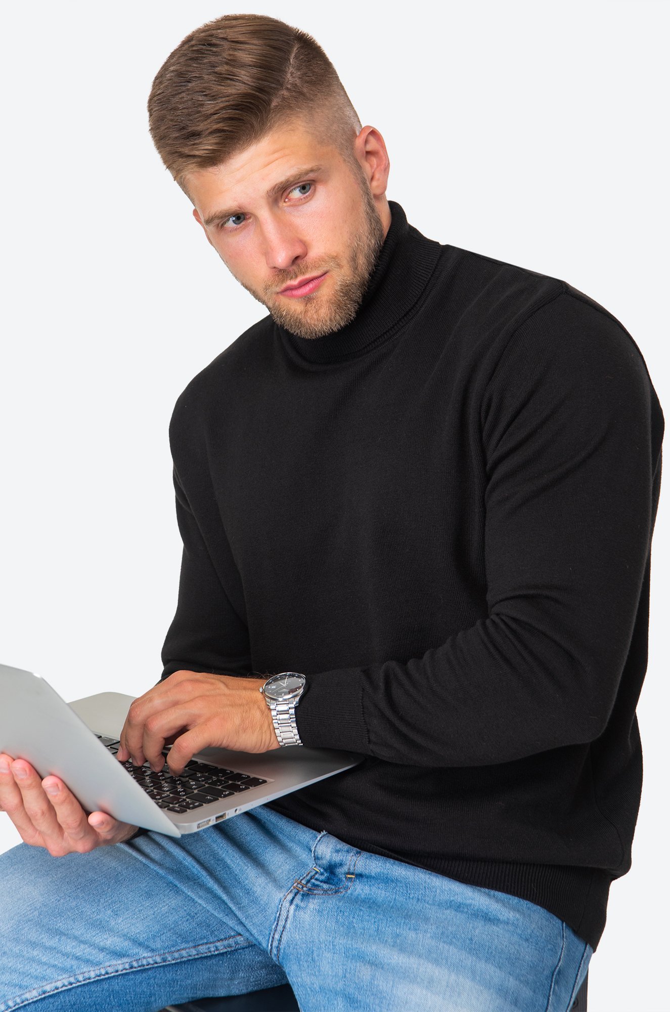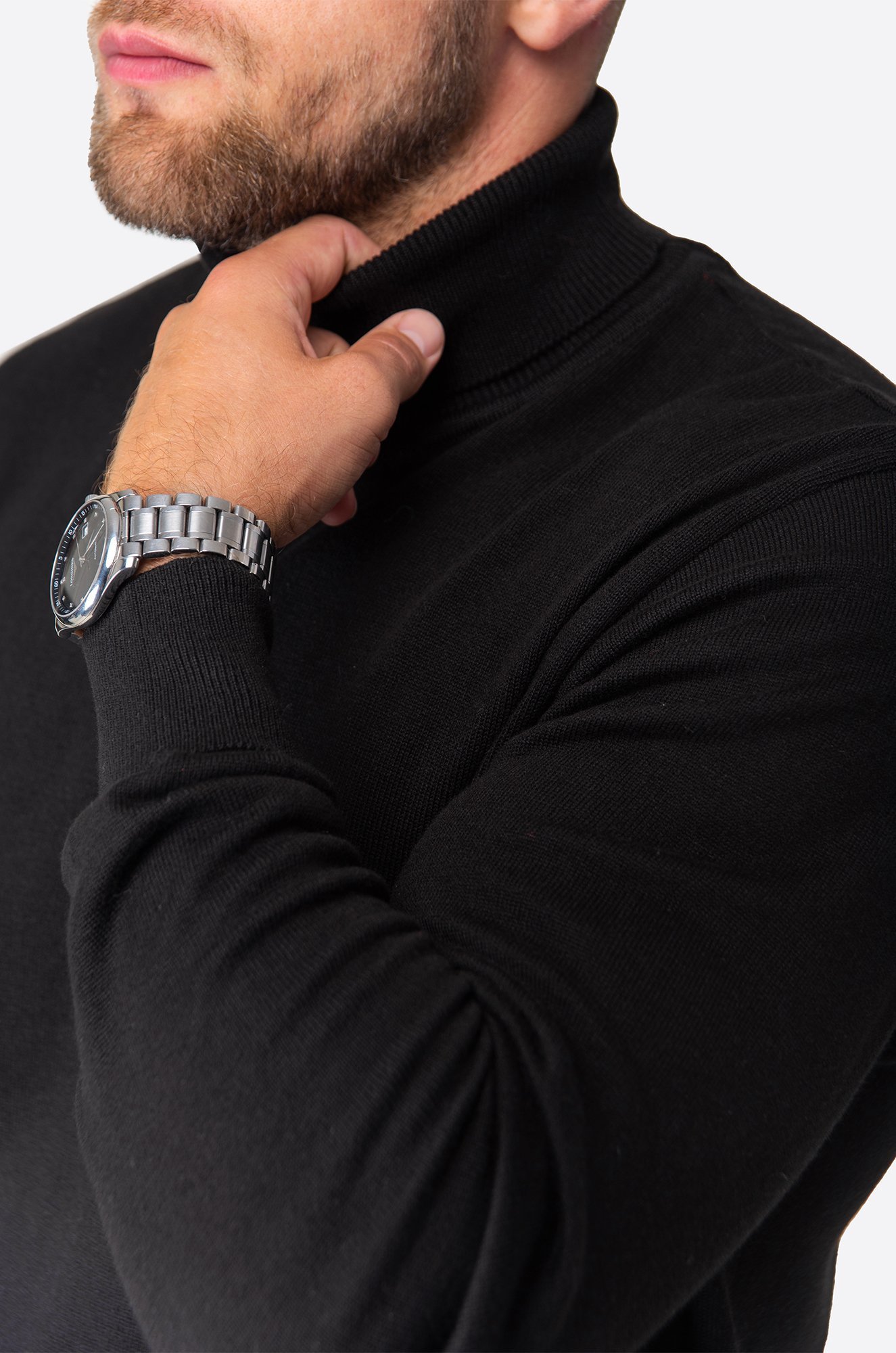 Черная водолазка с высоким воротом для мужчин выполнена из вязаного трикотажа: в ней будет уютно и тепло в прохладную погоду. Хлопковый джемпер из мягкой пряжи с акрилом не колется, он невероятно мягкий и приятный к телу.