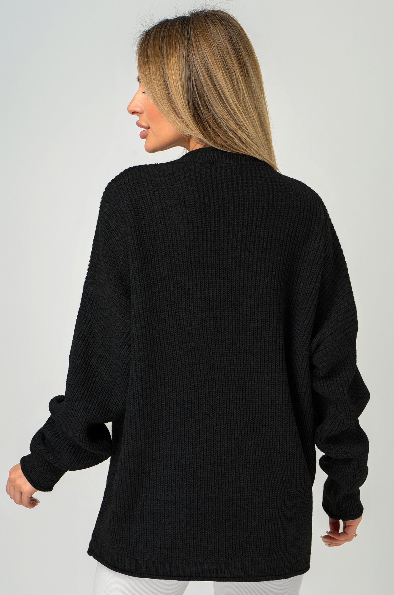 Окутывающий нежностью и заботой черный свитер выполнен из акрила и шерсти. Удлиненный силуэт, крой oversize, v-образный вырез, длинные рукава – в этом джемпере для женщин есть все, что поможет оставаться стильной в любой ситуации!