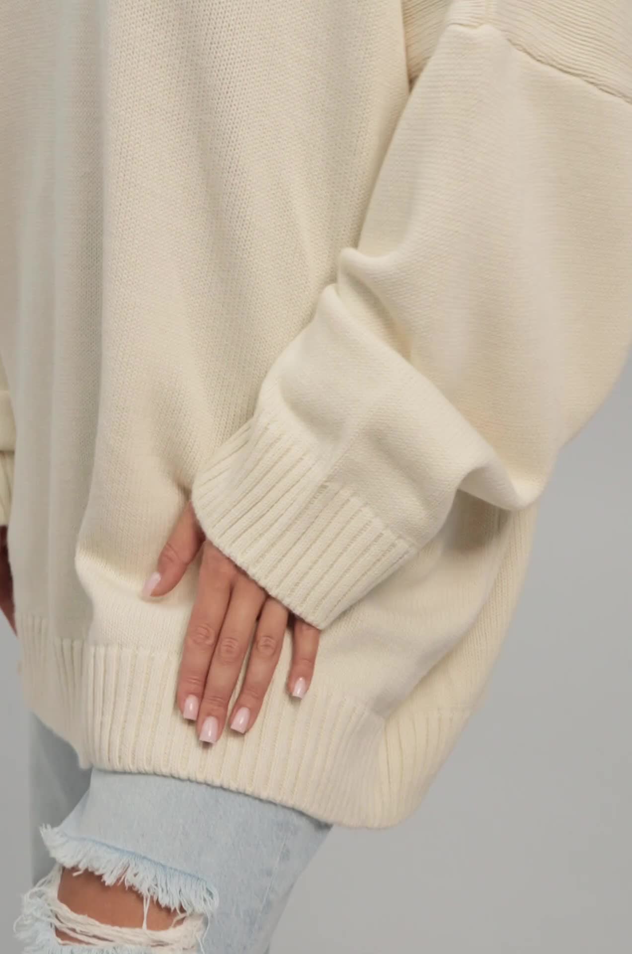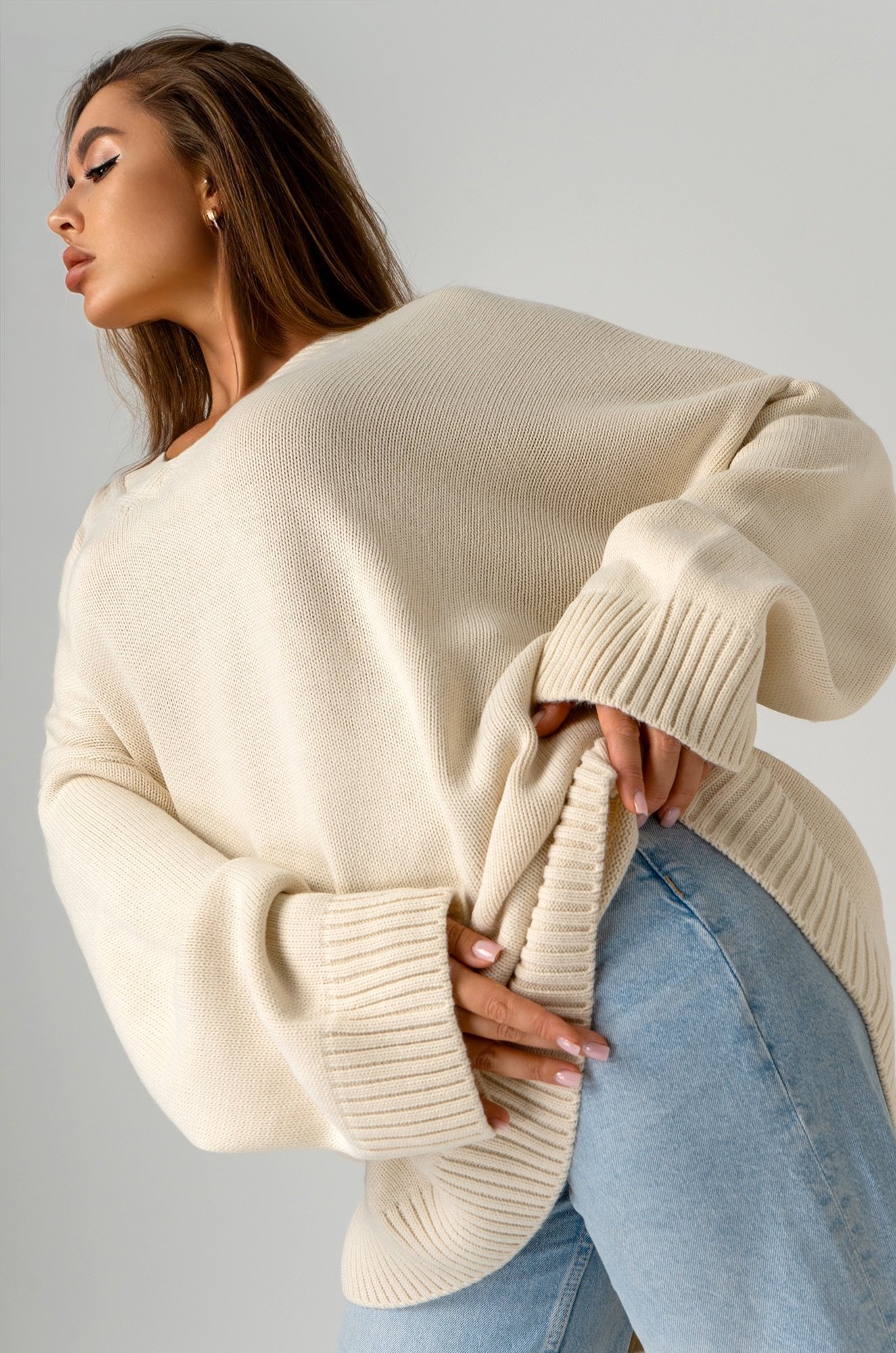 Вязаное трикотажное полотно из хлопка и шерсти делает свитер onesize теплым и идеальным для весенней погоды и даже зимних дней. Благодаря добавлению акрила демисезонный бежевый свитер не вытягивается даже после частых стирок.