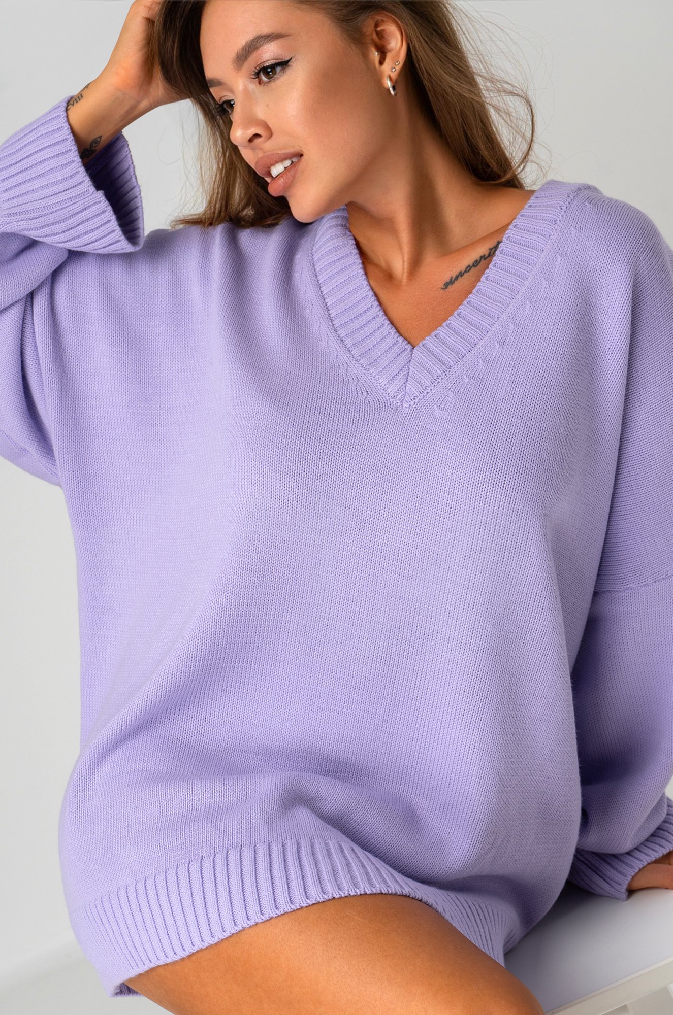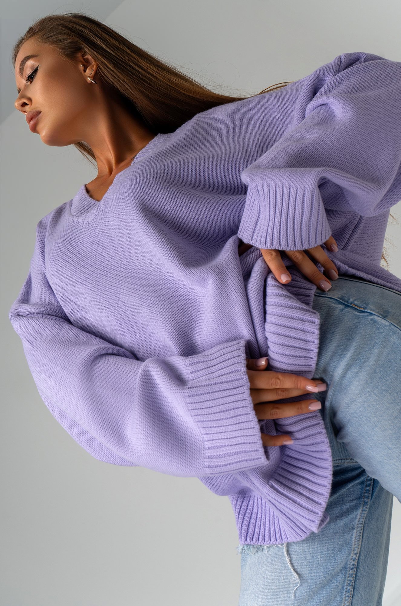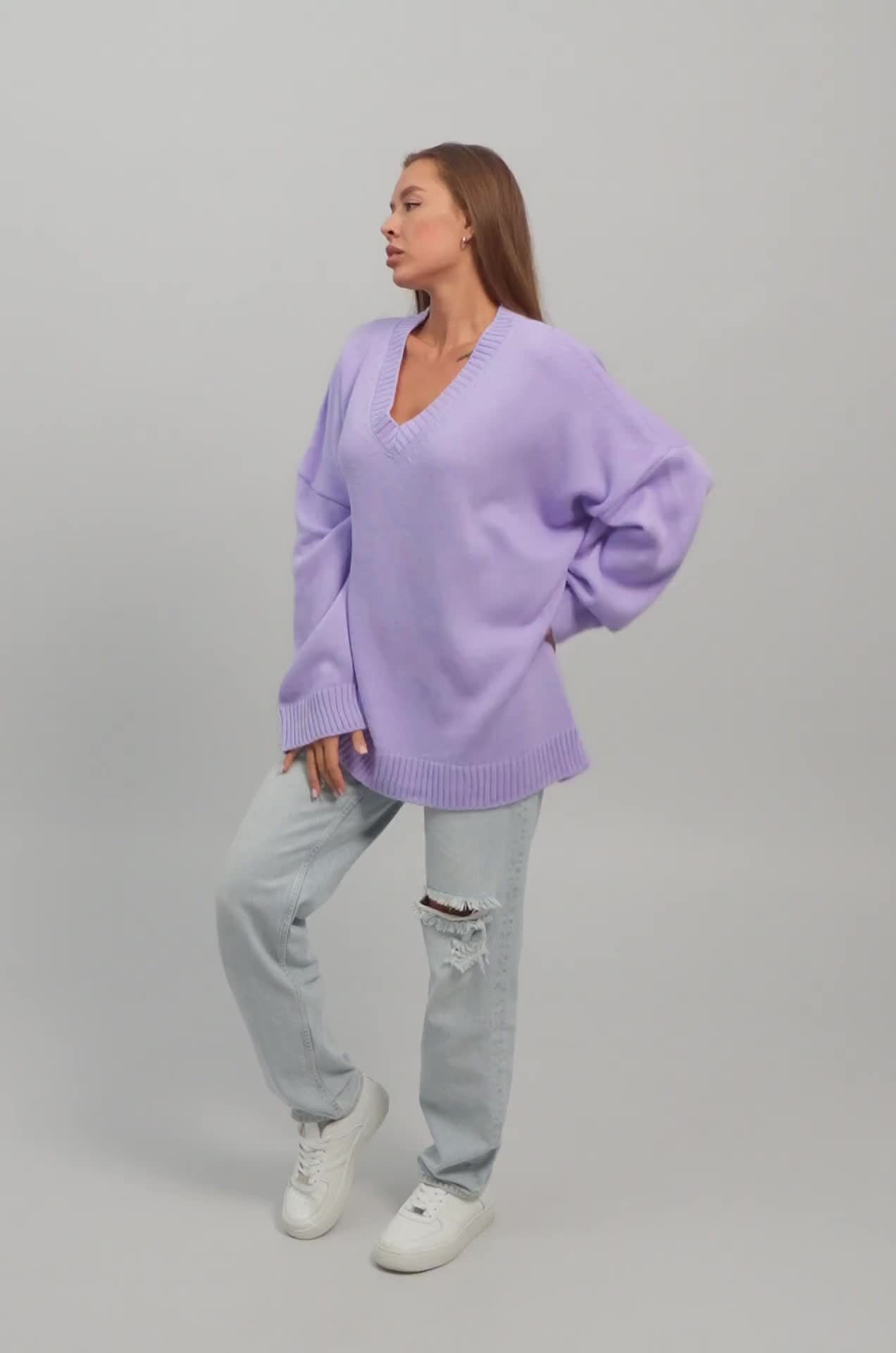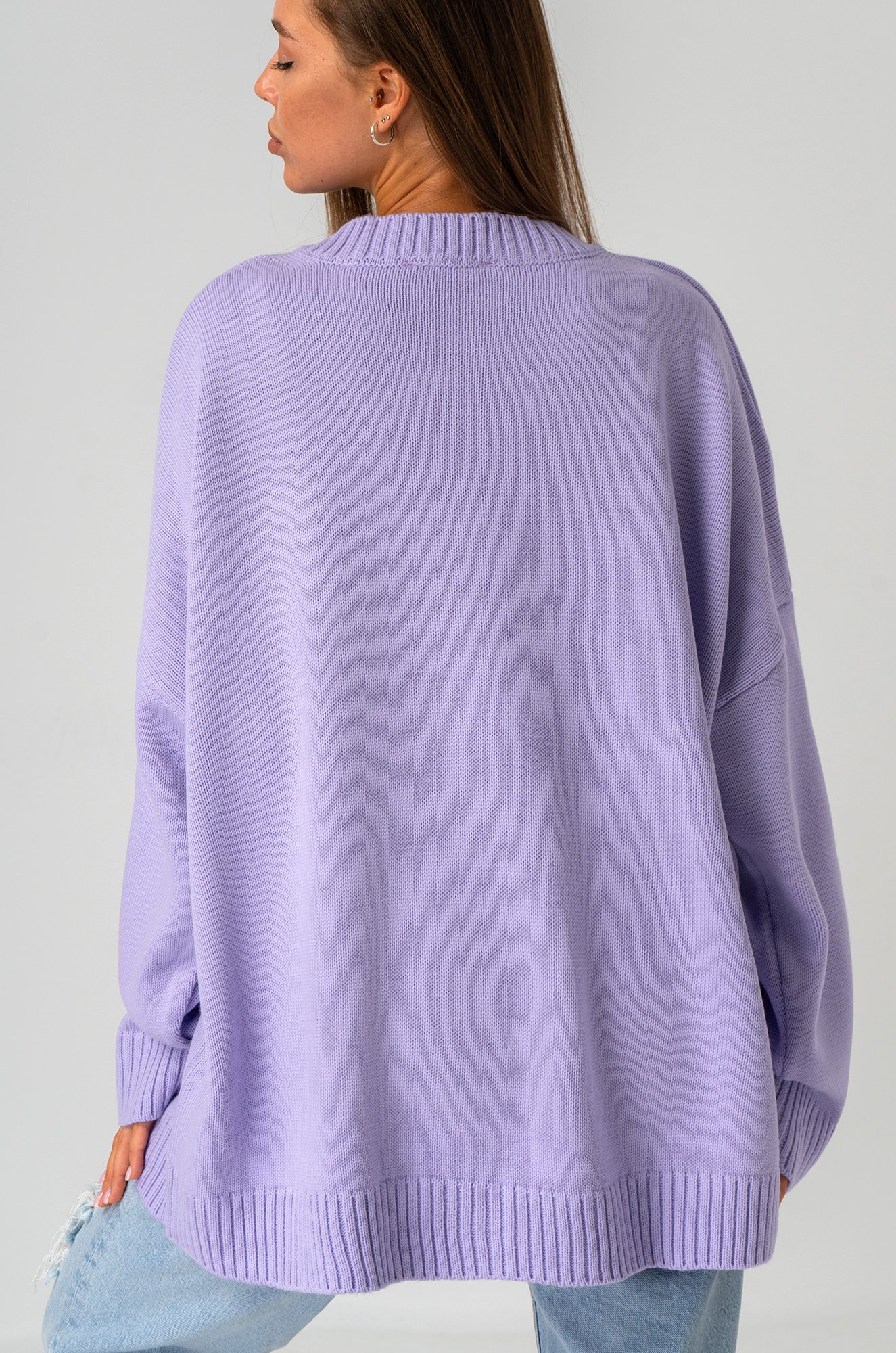 Сиреневый свитер из вязаного трикотажа станет крутой основой для повседневных образов в стиле smart casual (смарт кэжуал) в осенние и зимние дни. Однотонный джемпер с v-вырезом не оставит девушку незамеченной на прогулке осенью. Морозной зимой утепленный джемпер поможет создать уютный многослойный образ.