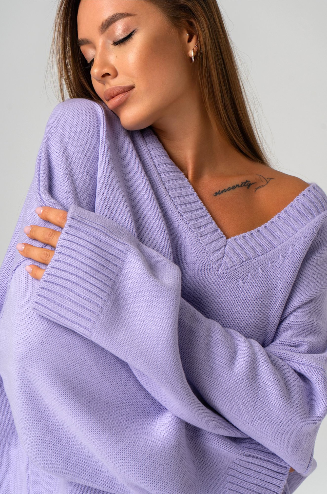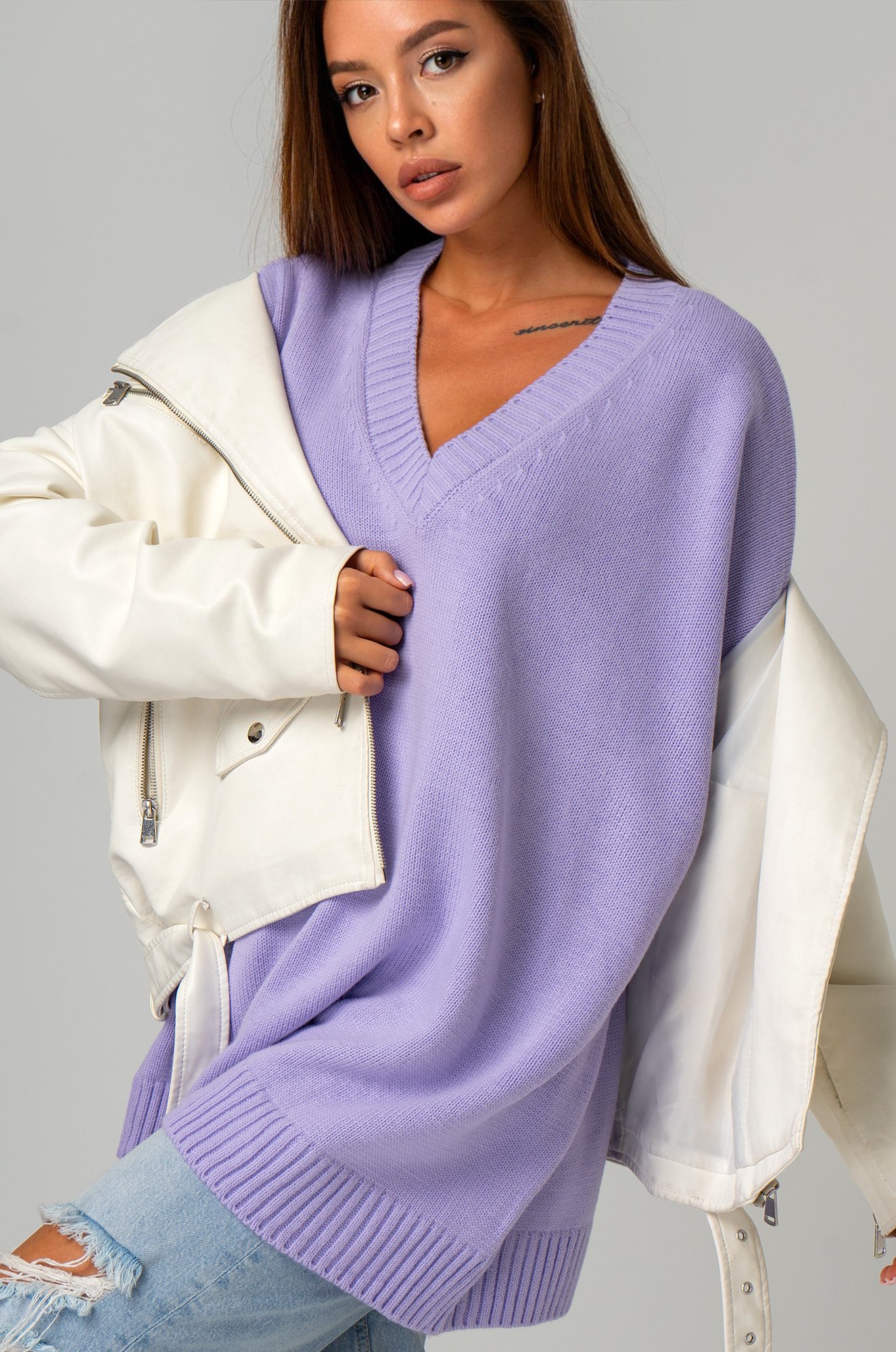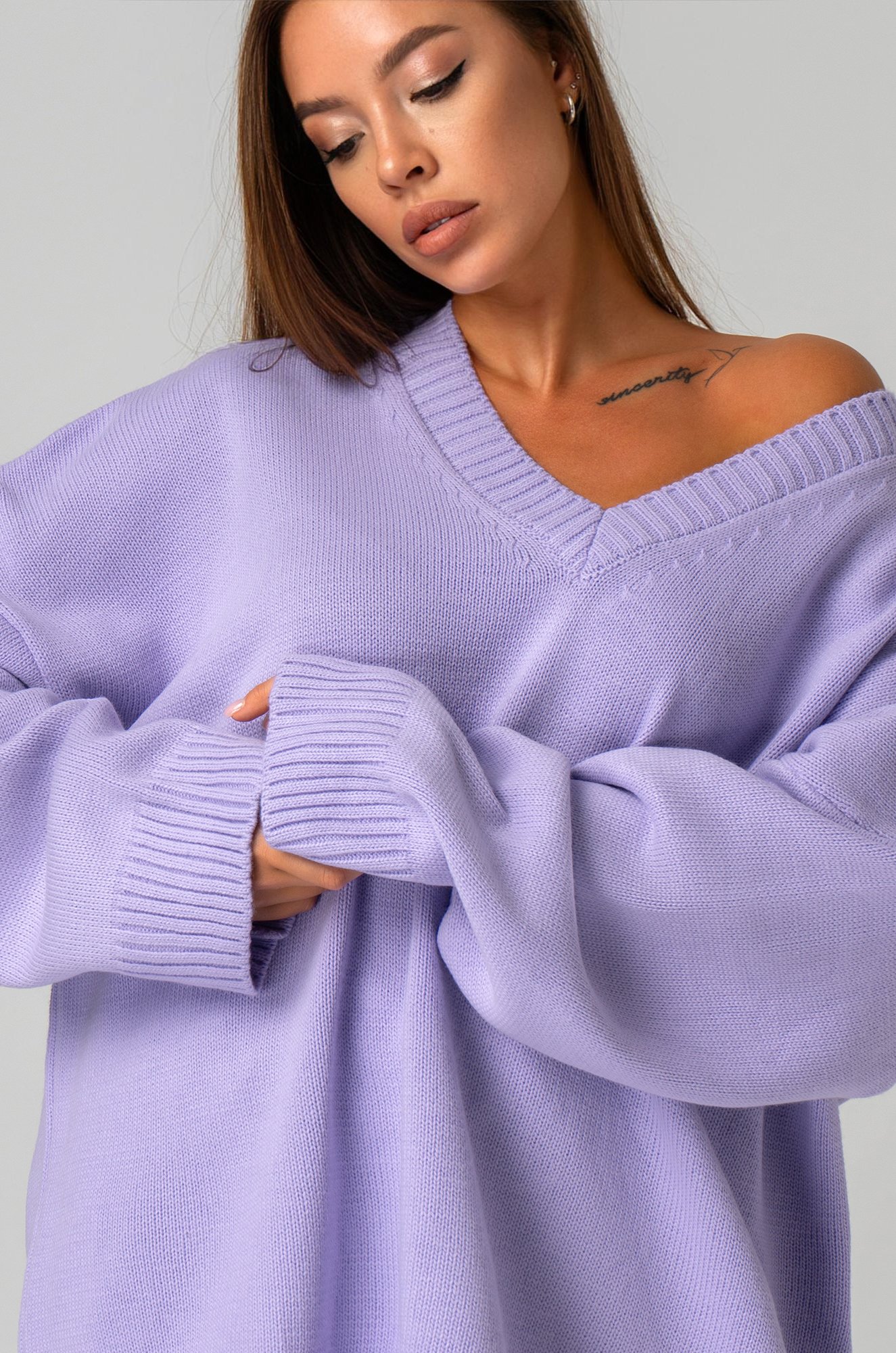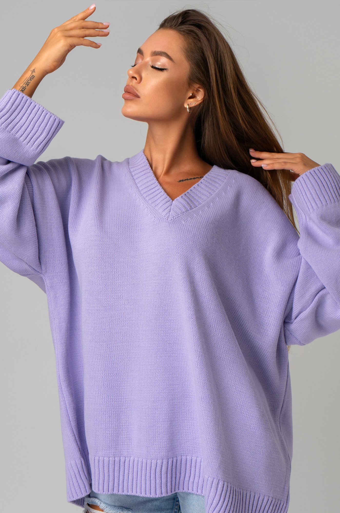 Сиреневый свитер из вязаного трикотажа станет крутой основой для повседневных образов в стиле smart casual (смарт кэжуал) в осенние и зимние дни. Однотонный джемпер с v-вырезом не оставит девушку незамеченной на прогулке осенью. Морозной зимой утепленный джемпер поможет создать уютный многослойный образ.