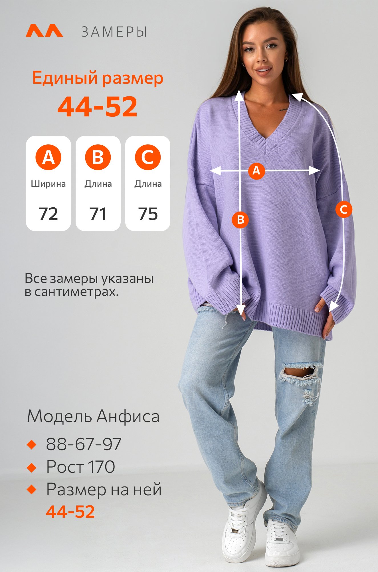 Модель Анфиса, ее рост 170, параметры: 88-67-97. На ней единый размер 44-52.