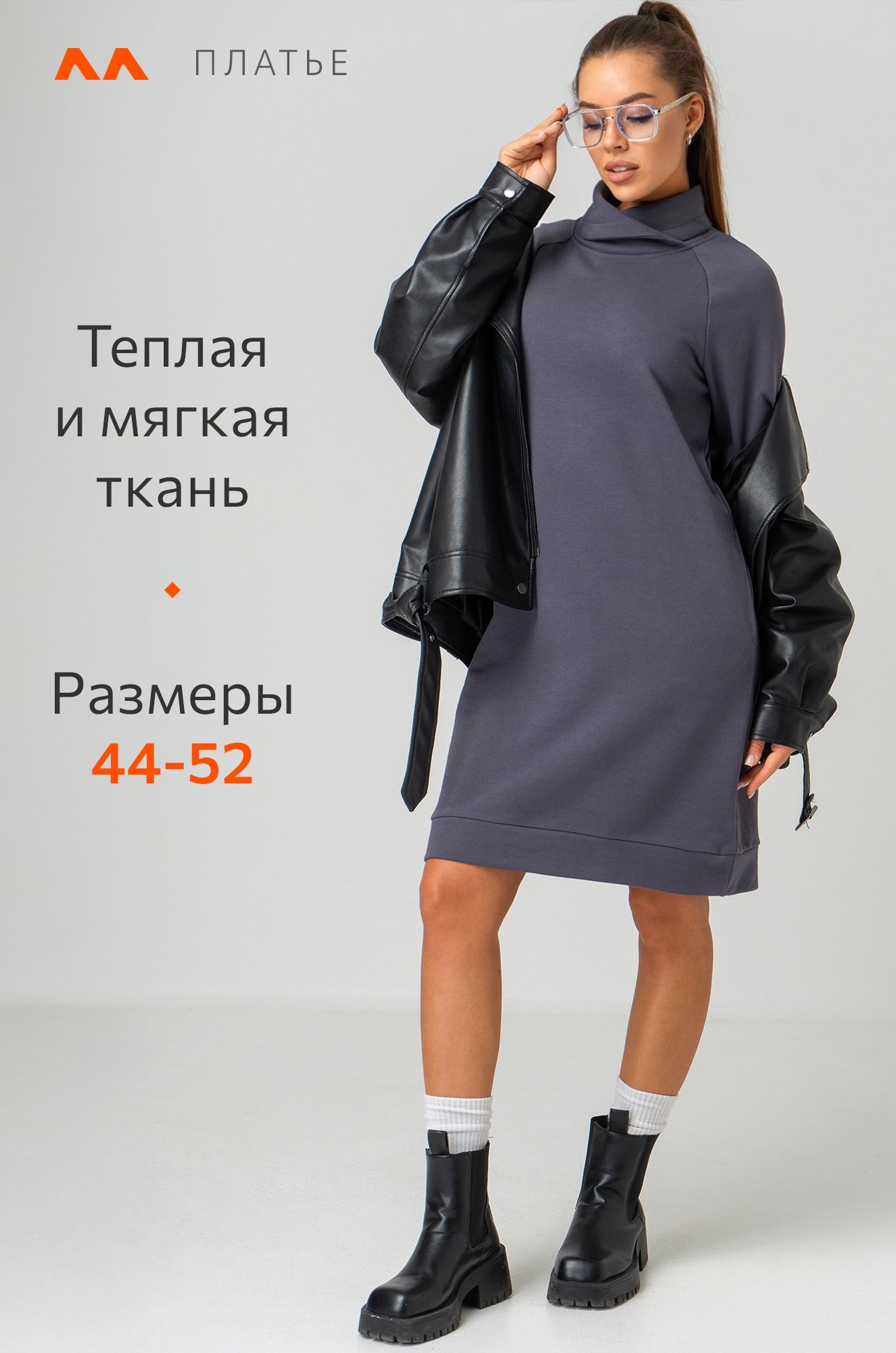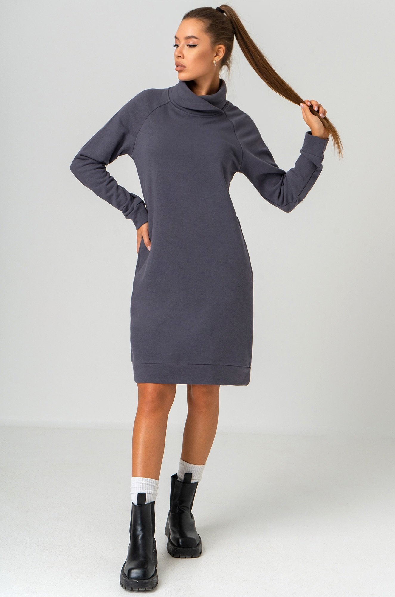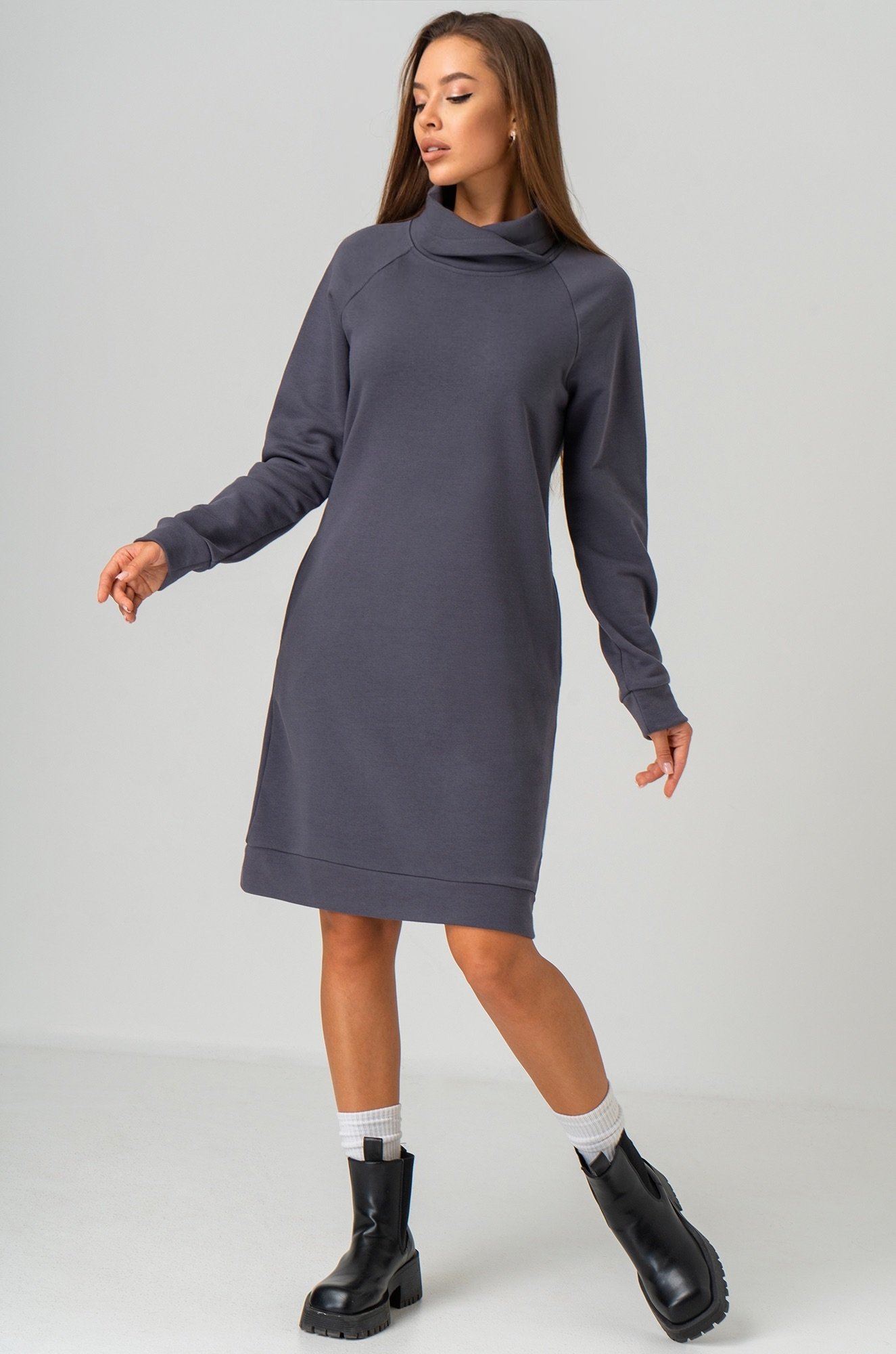 Хлопковое платье с горлом станет отличным выбором для женщин, ценящих комфорт и непринужденный стиль. Платье антрацитового цвета — идеальный вариант для осени и зимы. Короткое платье из трикотажа превращает каждое мгновение в комфортное наслаждение и подходит для повседневных прогулок, отдыха дома или встреч с друзьями.