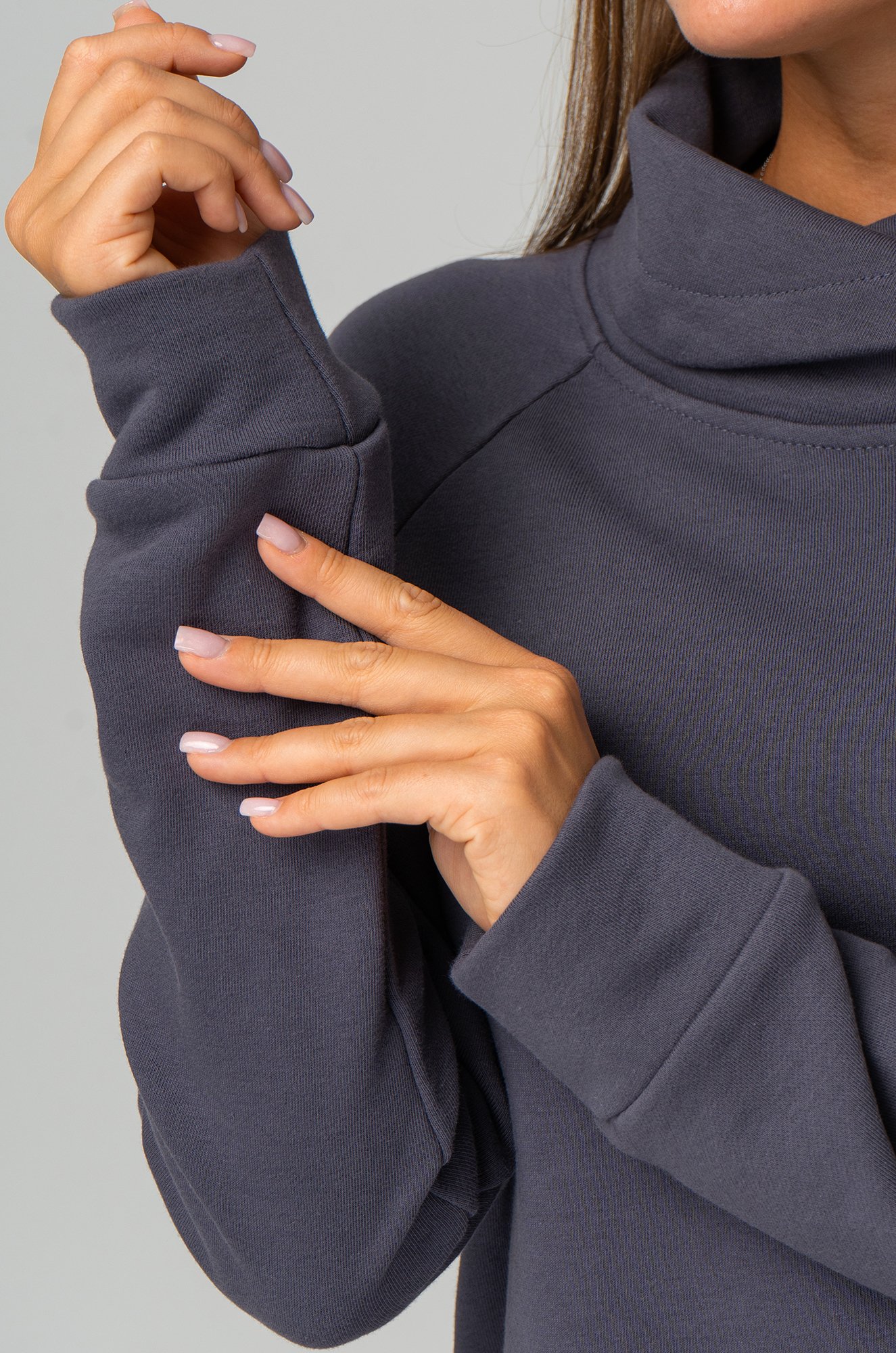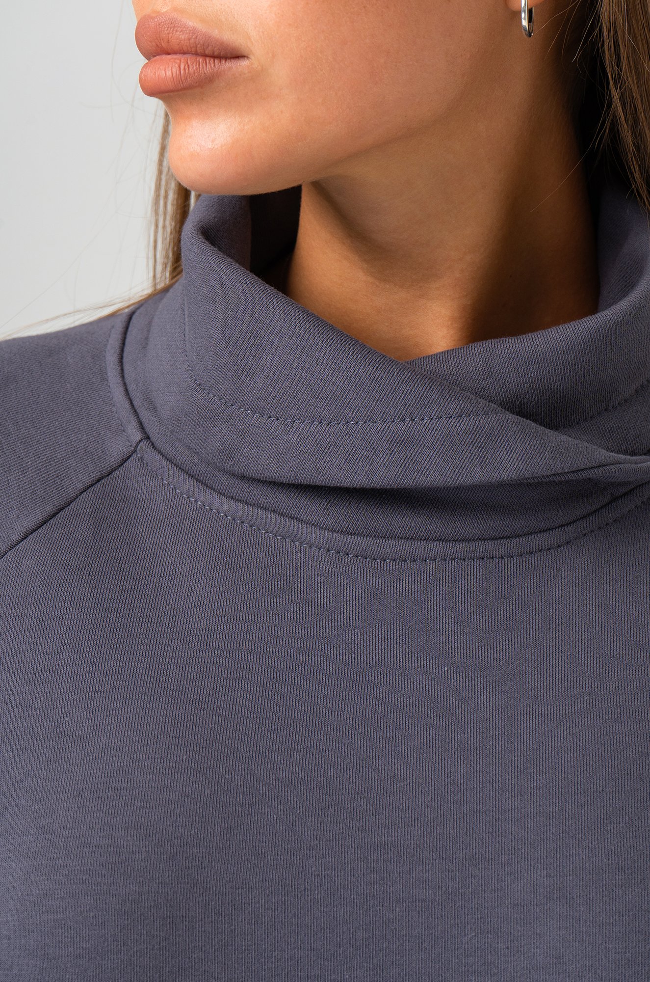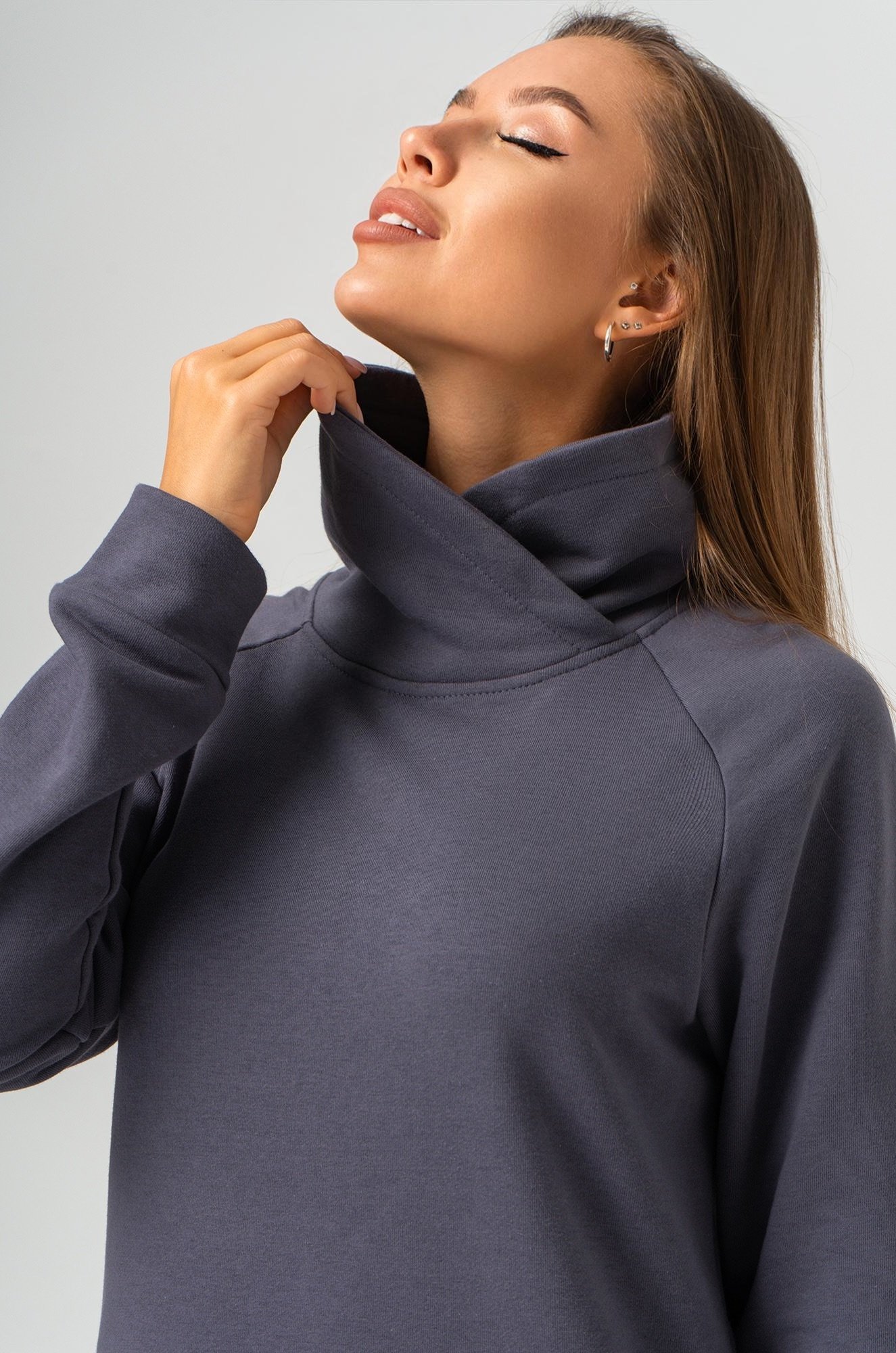 Хлопковое платье с горлом станет отличным выбором для женщин, ценящих комфорт и непринужденный стиль. Платье антрацитового цвета — идеальный вариант для осени и зимы. Короткое платье из трикотажа превращает каждое мгновение в комфортное наслаждение и подходит для повседневных прогулок, отдыха дома или встреч с друзьями.