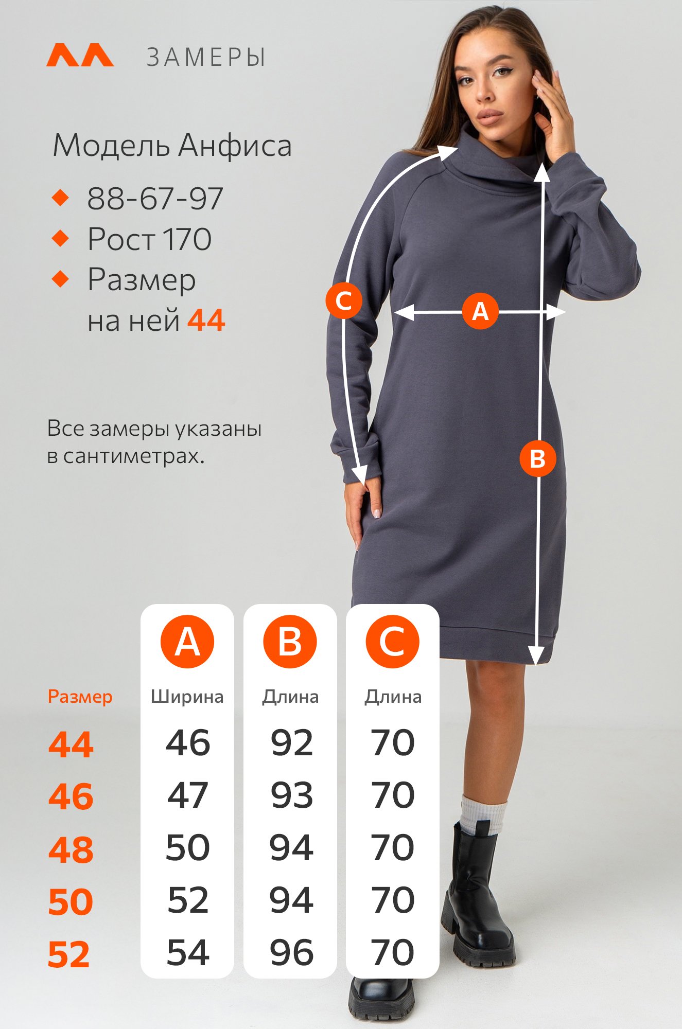 Модель Анфиса, ее рост 170, параметры: 88-67-97. На ней размер 44.