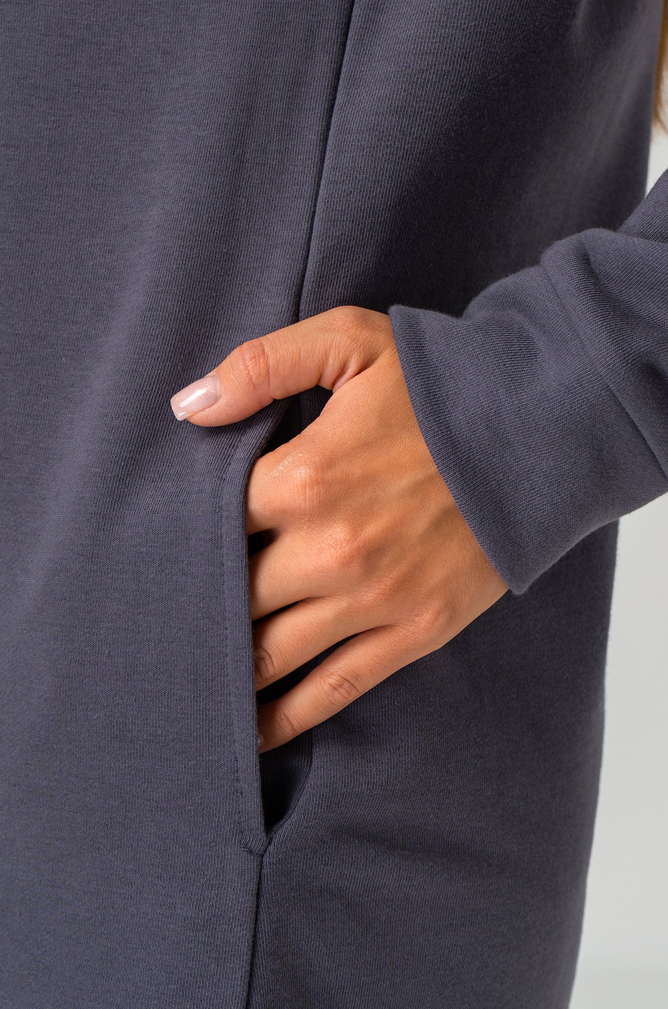 Серое платье-толстовка выполнено из футера трехнитки — натуральный хлопок в составе дарит мягкость и комфорт, а добавление полиэстера сохраняет форму и делает трикотажное платье устойчивым к износу.