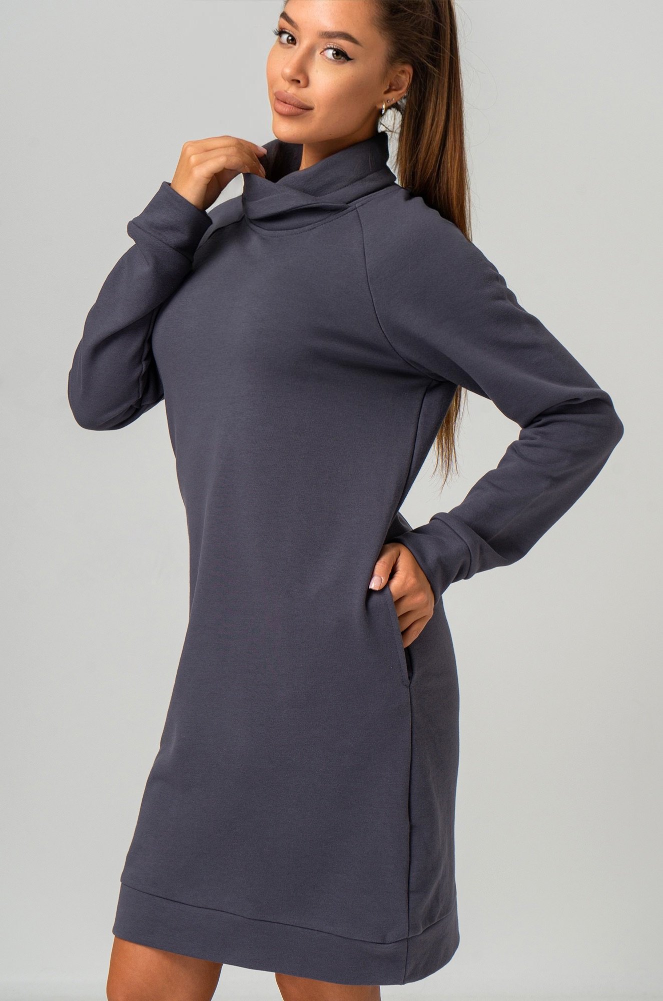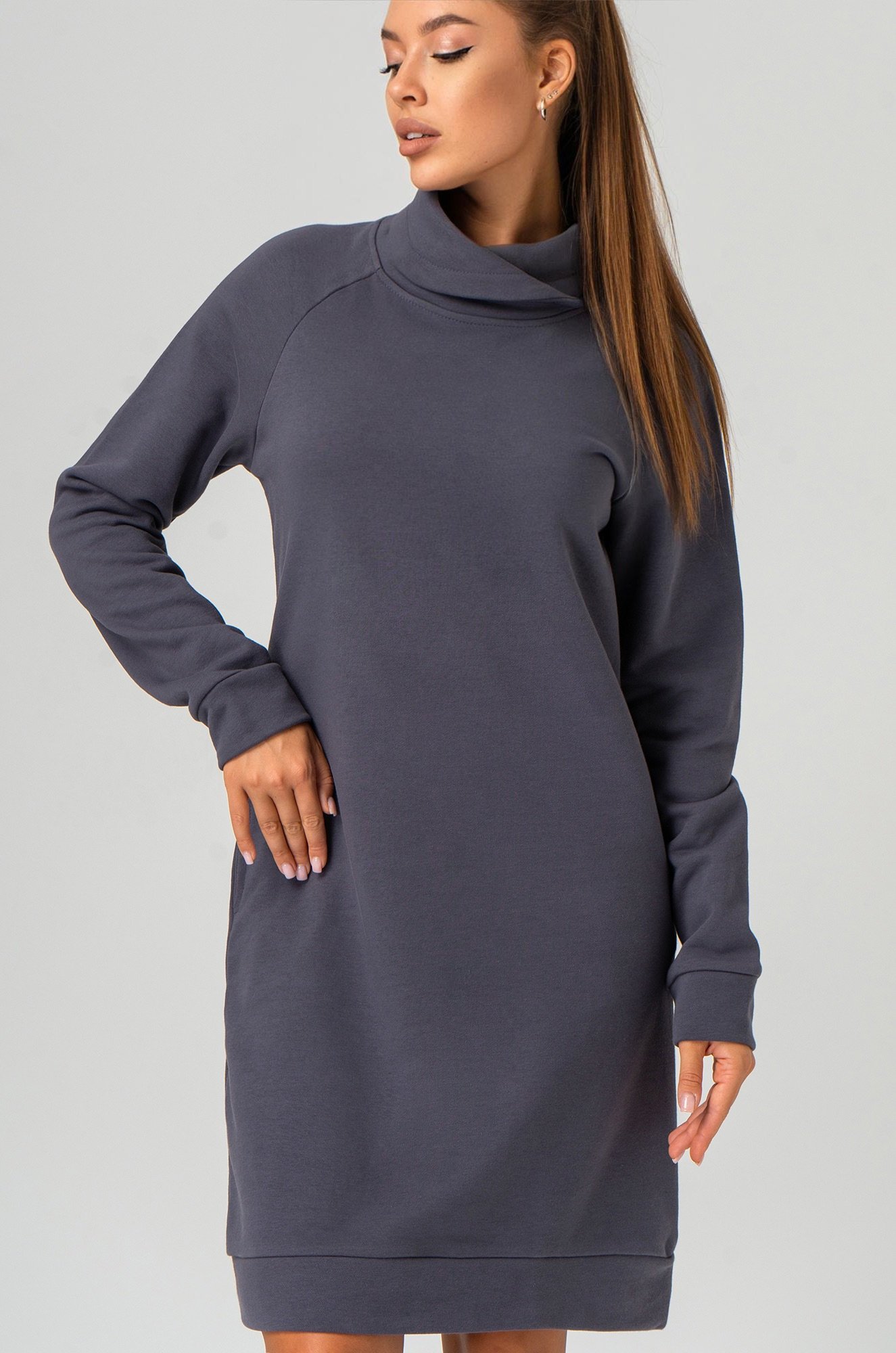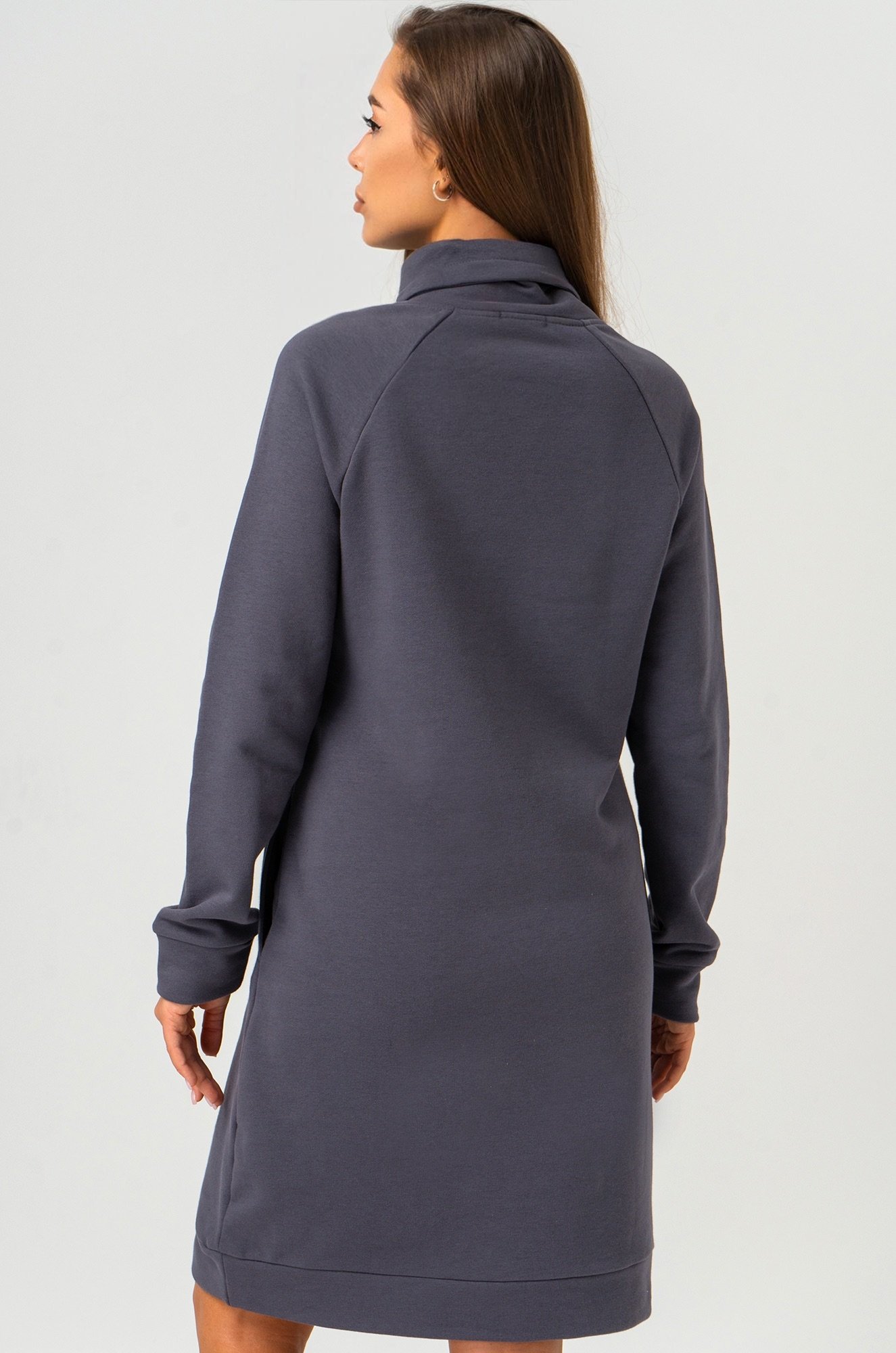 Прямой крой и длина мини создают непринужденный силуэт, позволяя двигаться свободно. Ворот и длинные рукава подчеркивают спортивный стиль, а графитовый цвет делает однотонное платье универсальным. Оно подойдет для прохладных осенних и зимних дней.