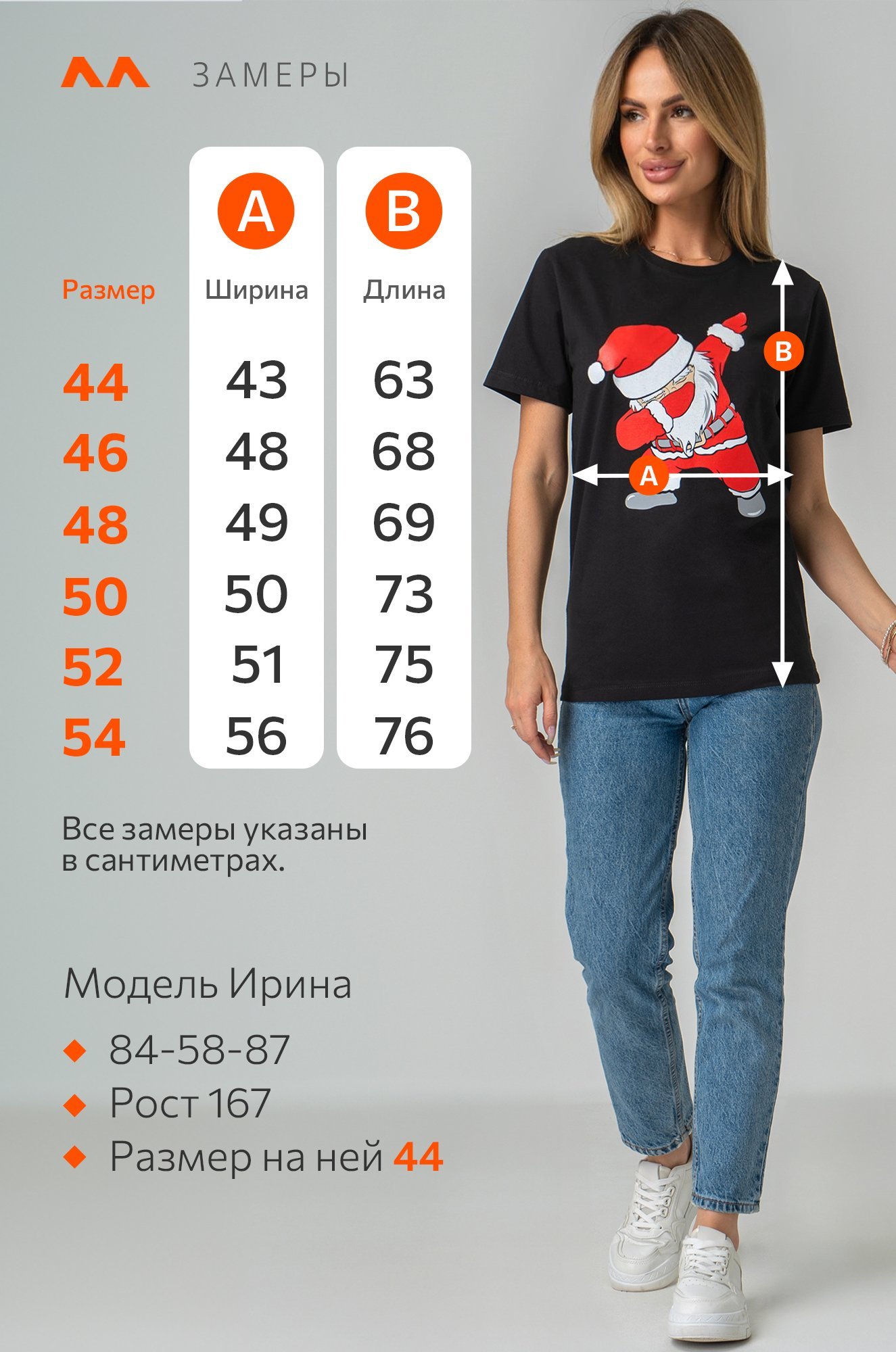 Модель Ирина, ее рост 167, параметры 84-58-87. На ней футболка 44 размера.