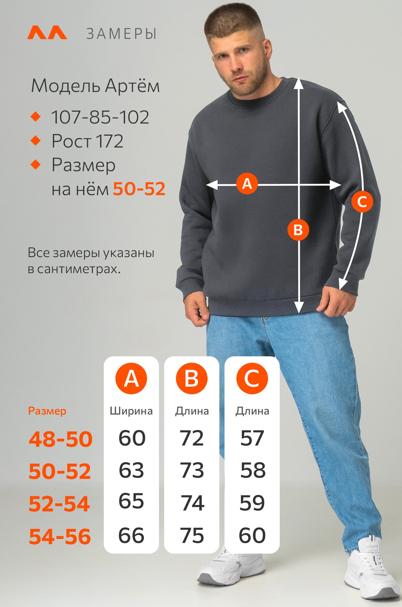 Размер 50-52: длина:73 см; ширина:63 см; длина рукава внешняя:58 см; длина рукава внутренняя:50 см.
