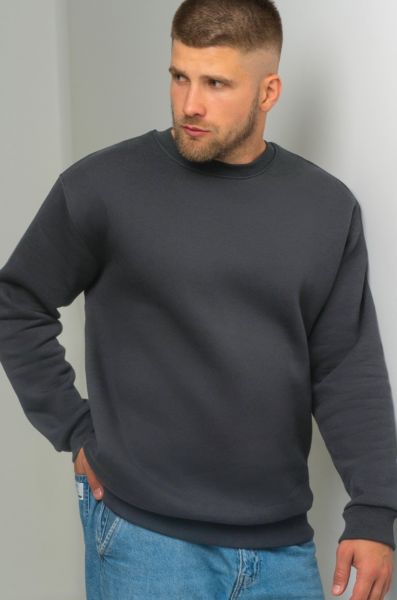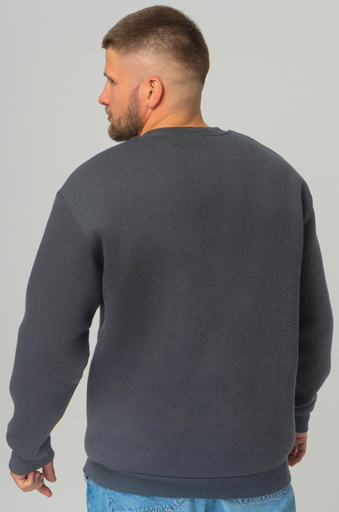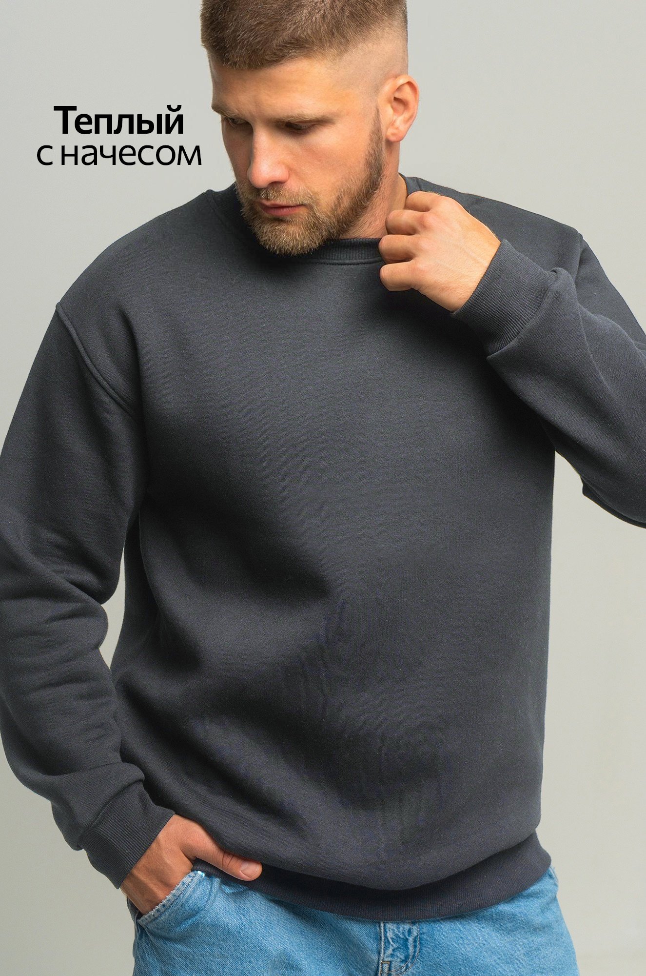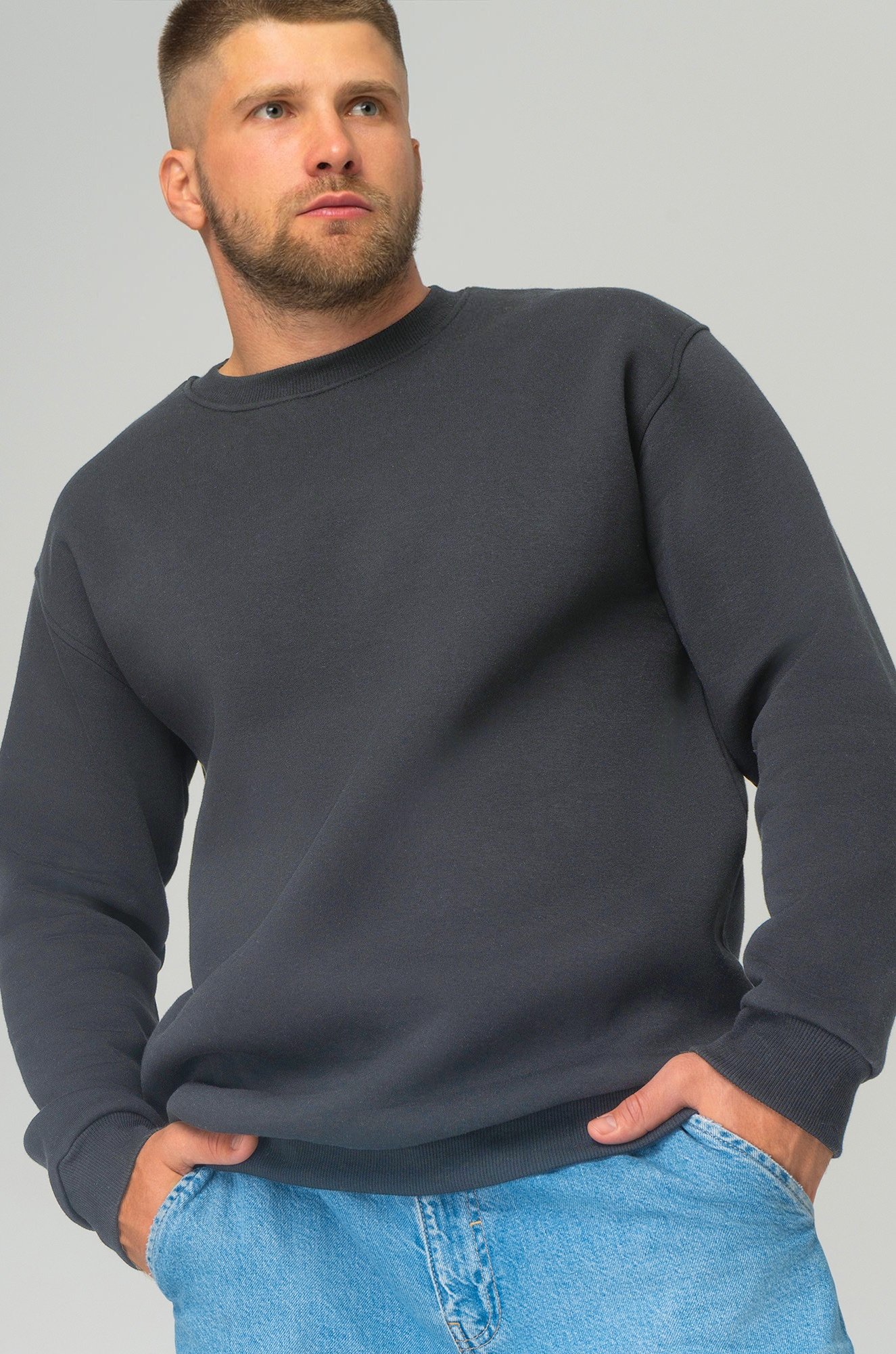 — однотонный темно-серый свитшот для мужчин выполнен из футера с начёсом;